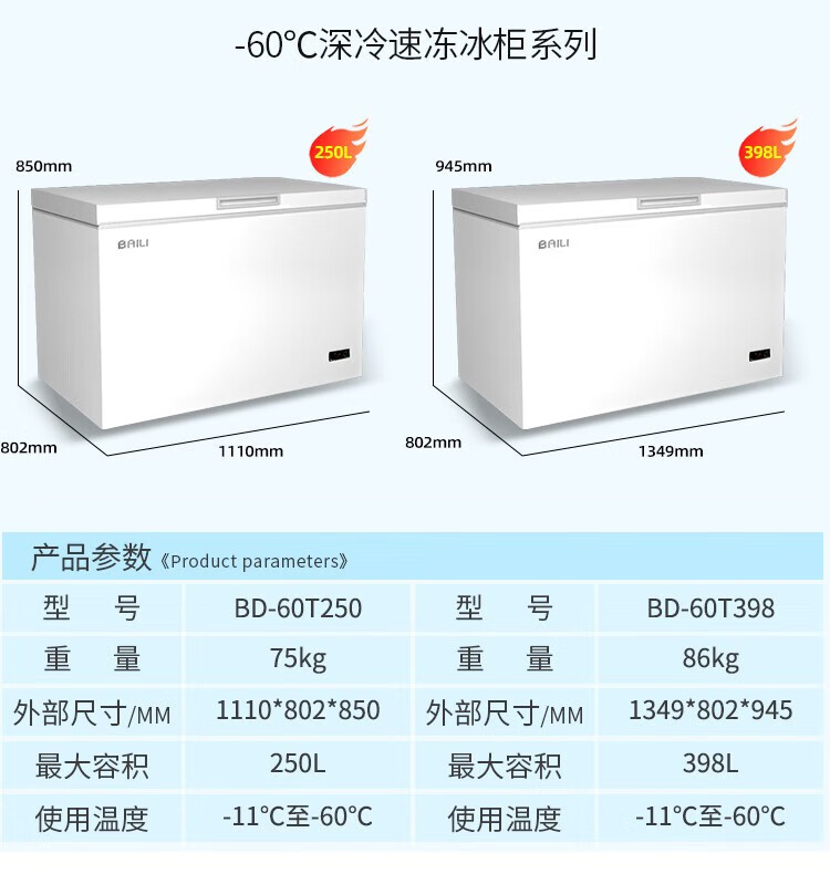 Baili Freezer (BAILI) Freezer Commercial Freezer Ultra-low Temperature Cabinet-40 Degree Freezer Large Capacity Horizontal Freezer Commercial Super Salmon Seafood Cabinet Large Cryogenic Quick Freezer 520 Liters Low Temperature-40 BD-40T520
