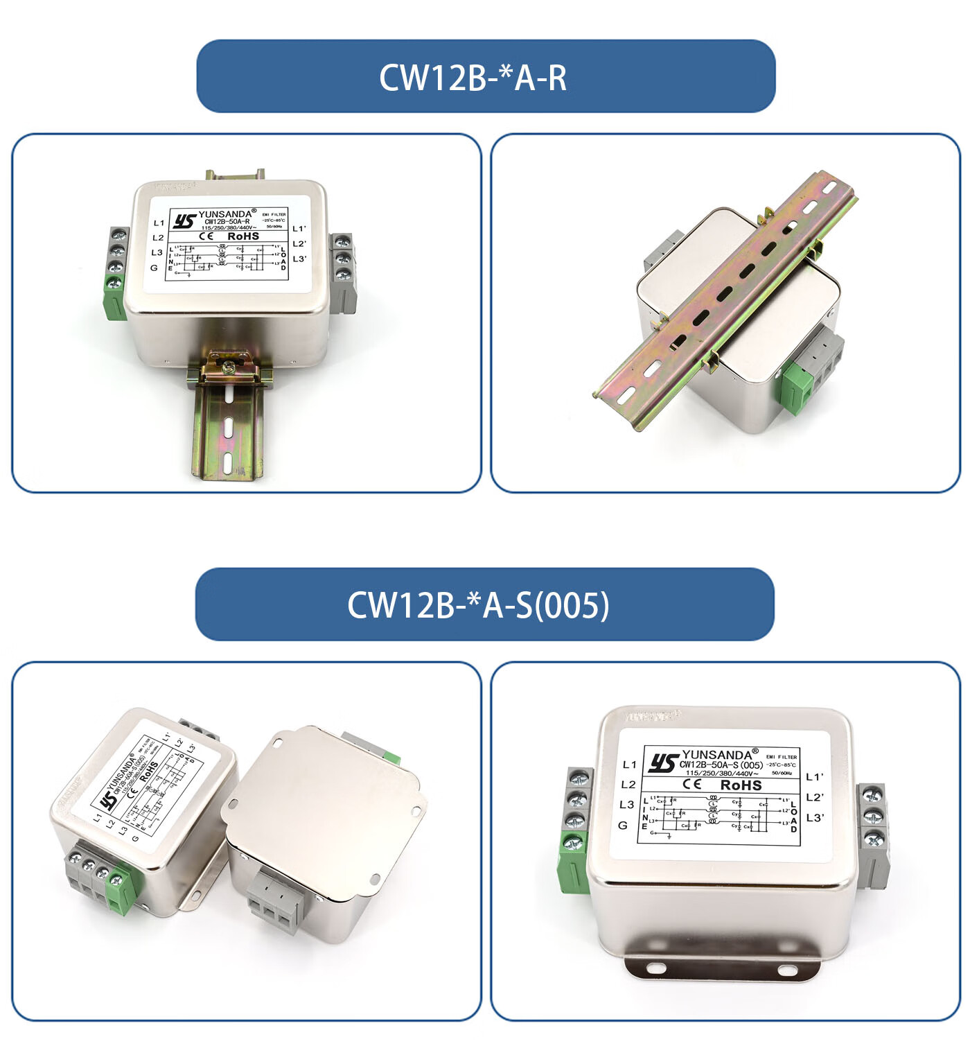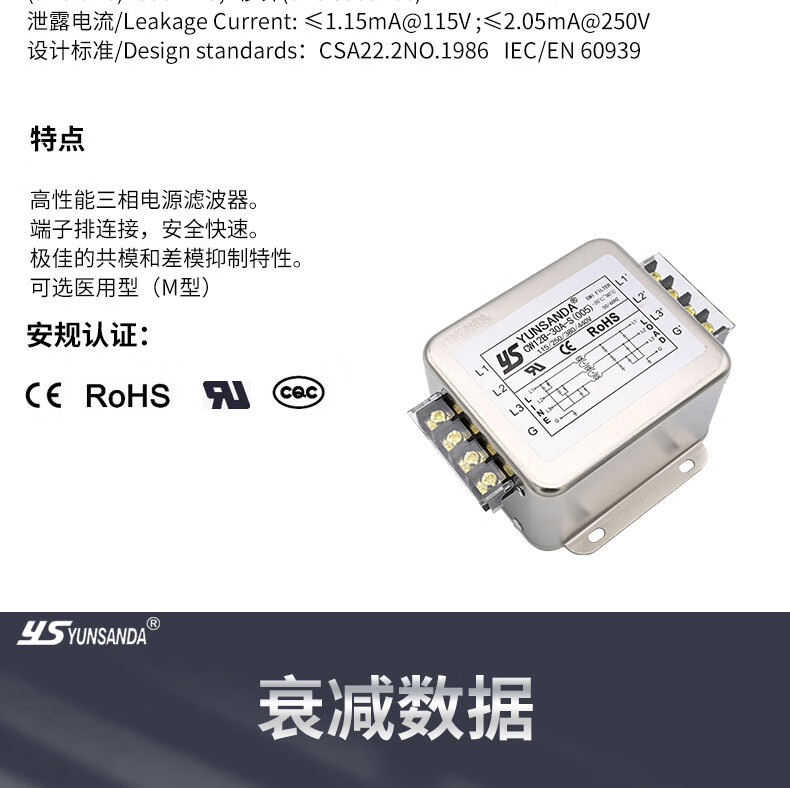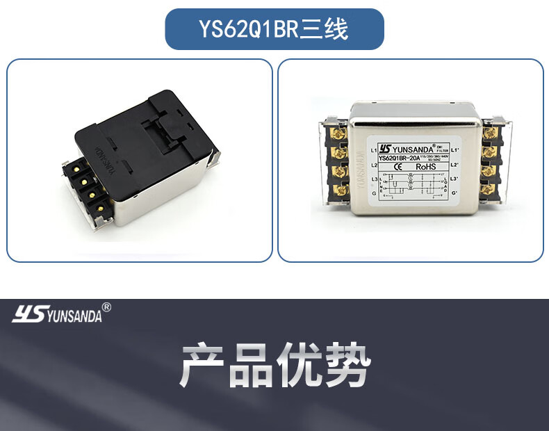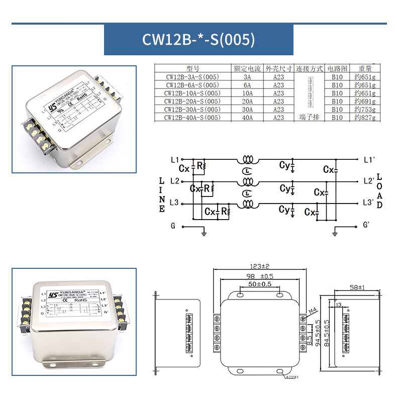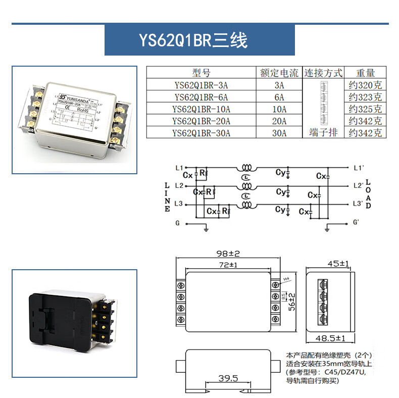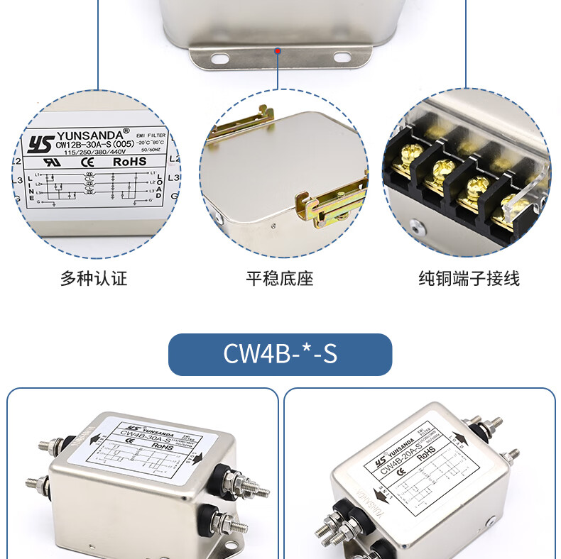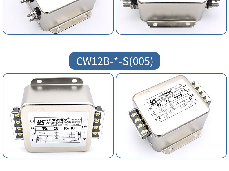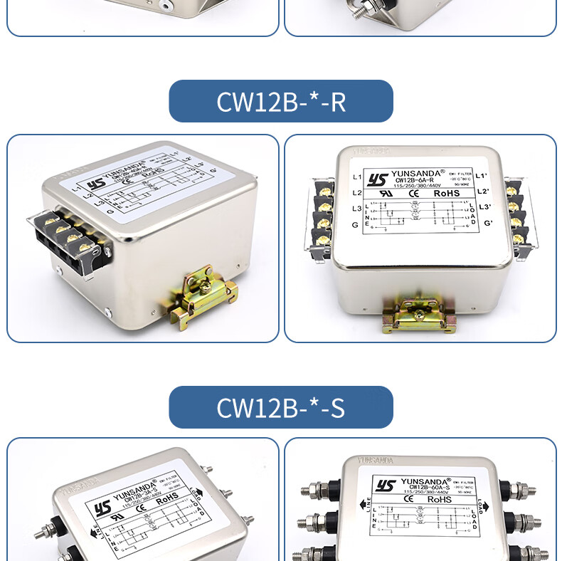 YUNSANDA three-phase three-wire terminal block guide rail type 380V power filter AC anti-interference CW12B-40A-R CW12B-40A-R guide rail installation
