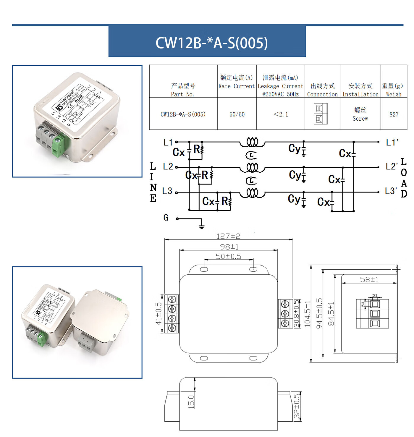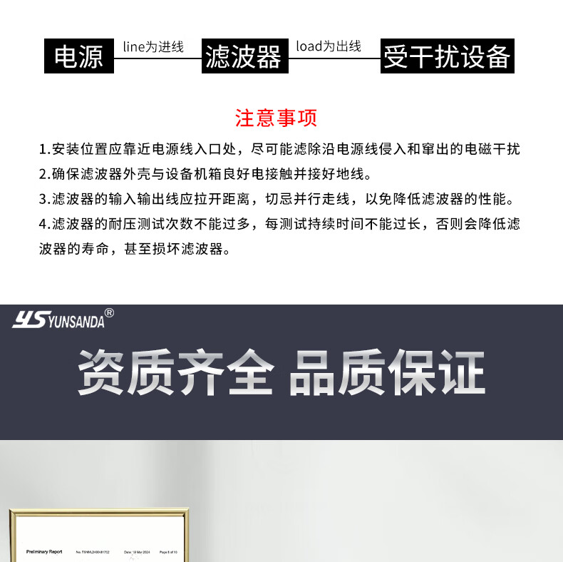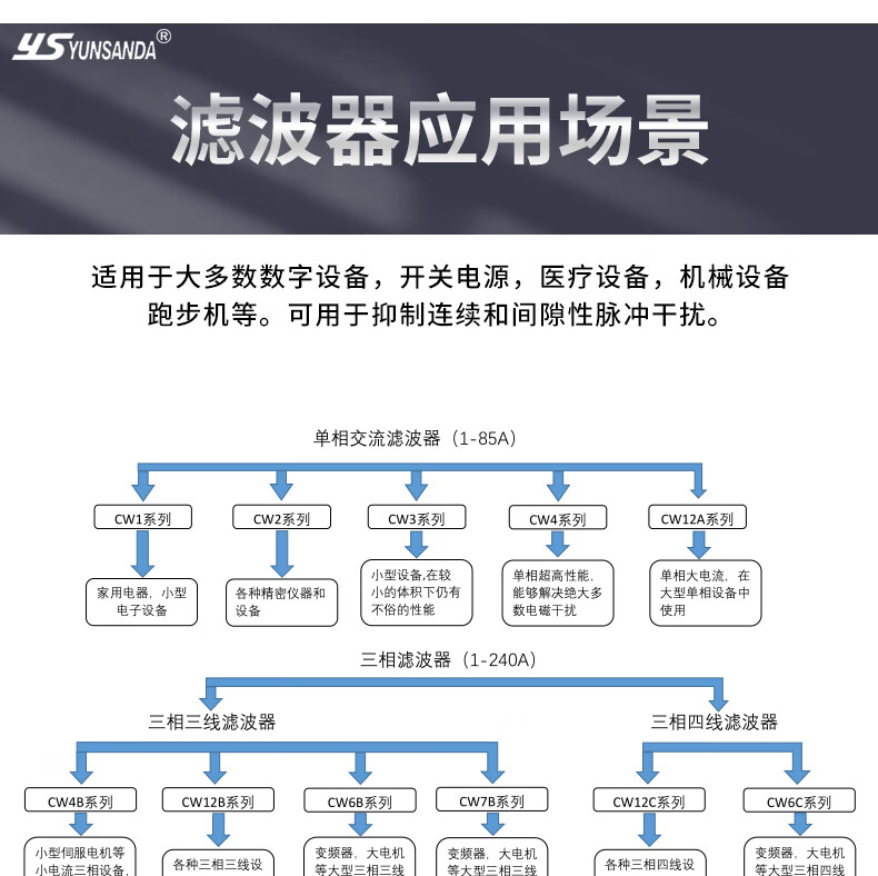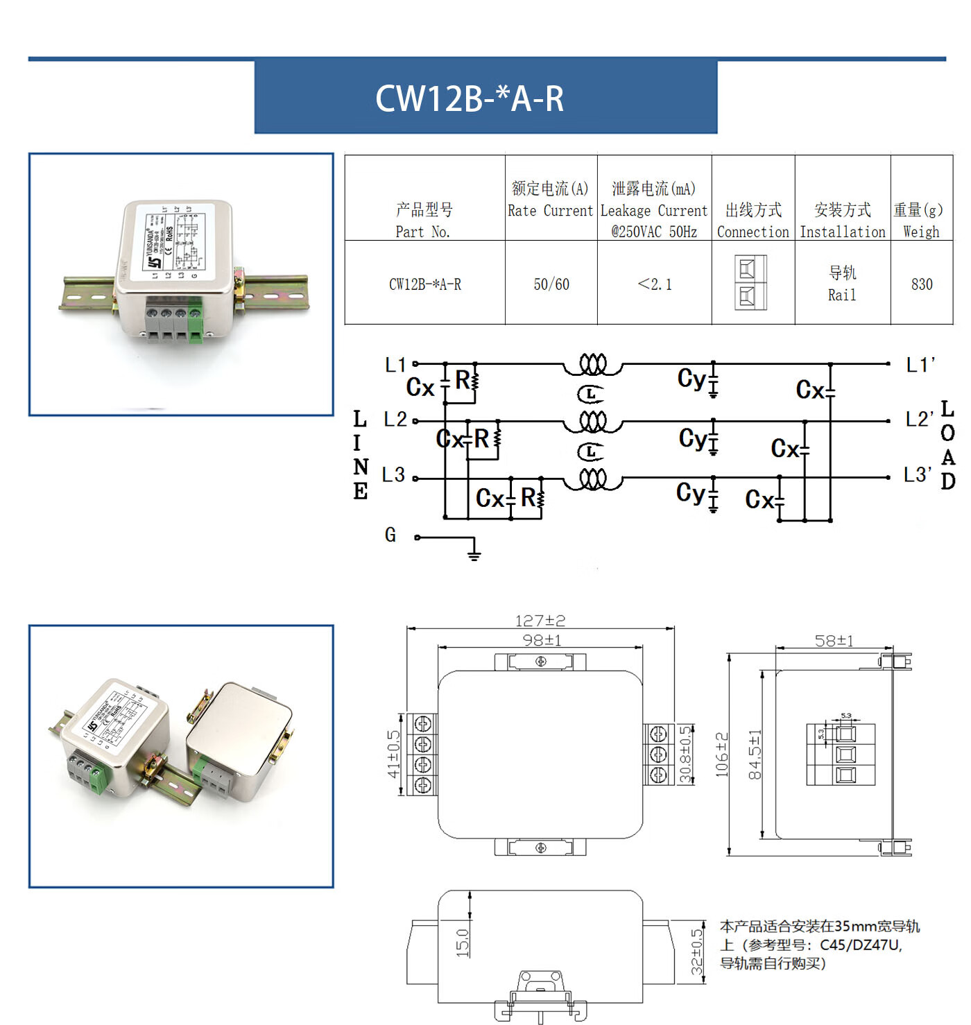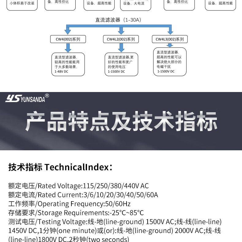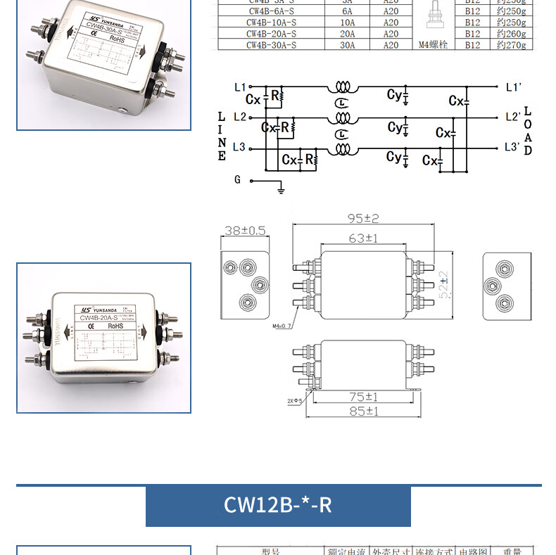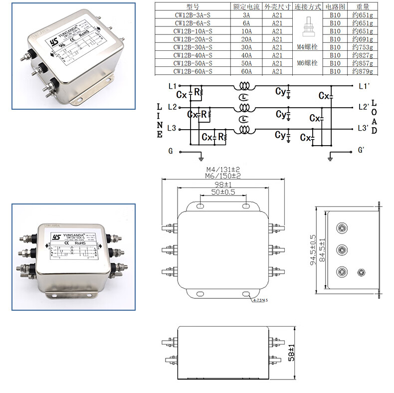 YUNSANDA three-phase three-wire terminal block guide rail type 380V power filter AC anti-interference CW12B-40A-R CW12B-40A-R guide rail installation
