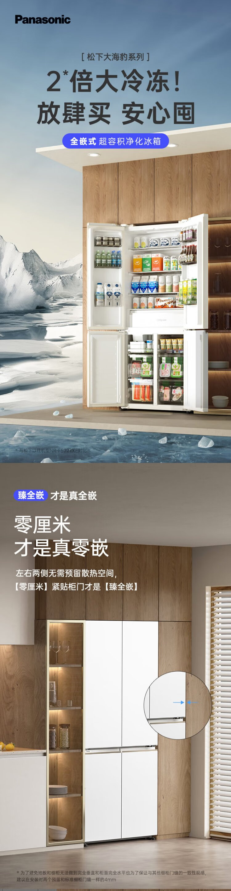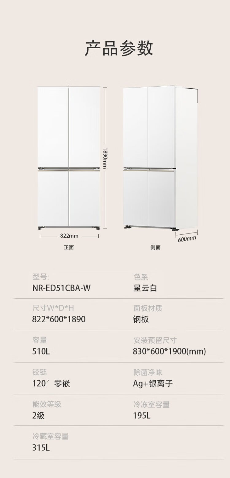 Panasonic 510-liter cross-door refrigerator, zero built-in 2 times larger freezer, self-cleaning automatic ice making NR-ED51CBA-W