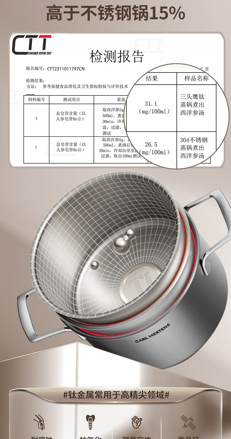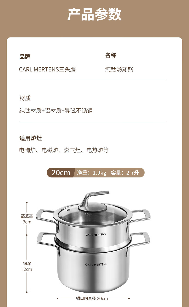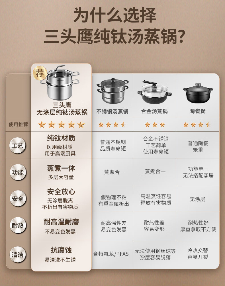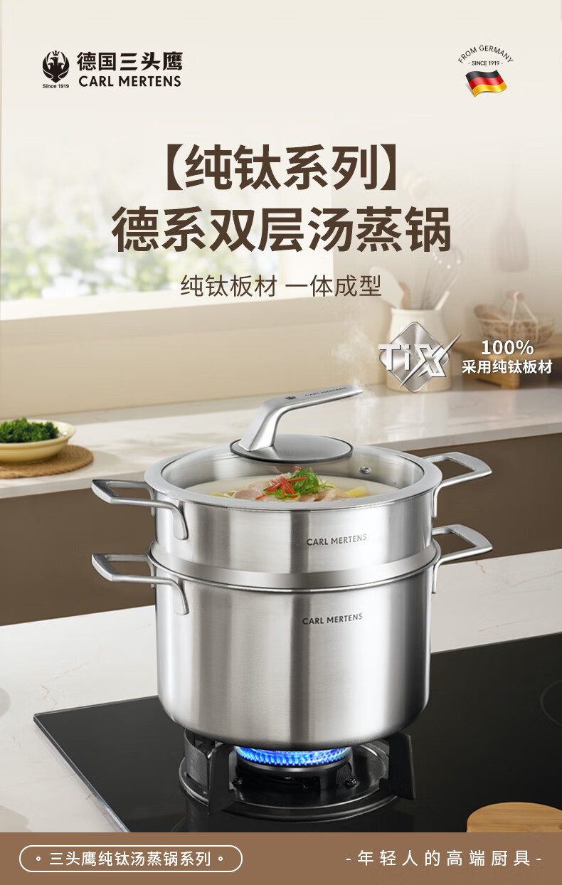 Three-headed eagle uncoated pure titanium steamer soup steaming stew multifunctional all-in-one household high temperature resistant special pot induction cooker universal pure titanium double layer soup steamer 24cm