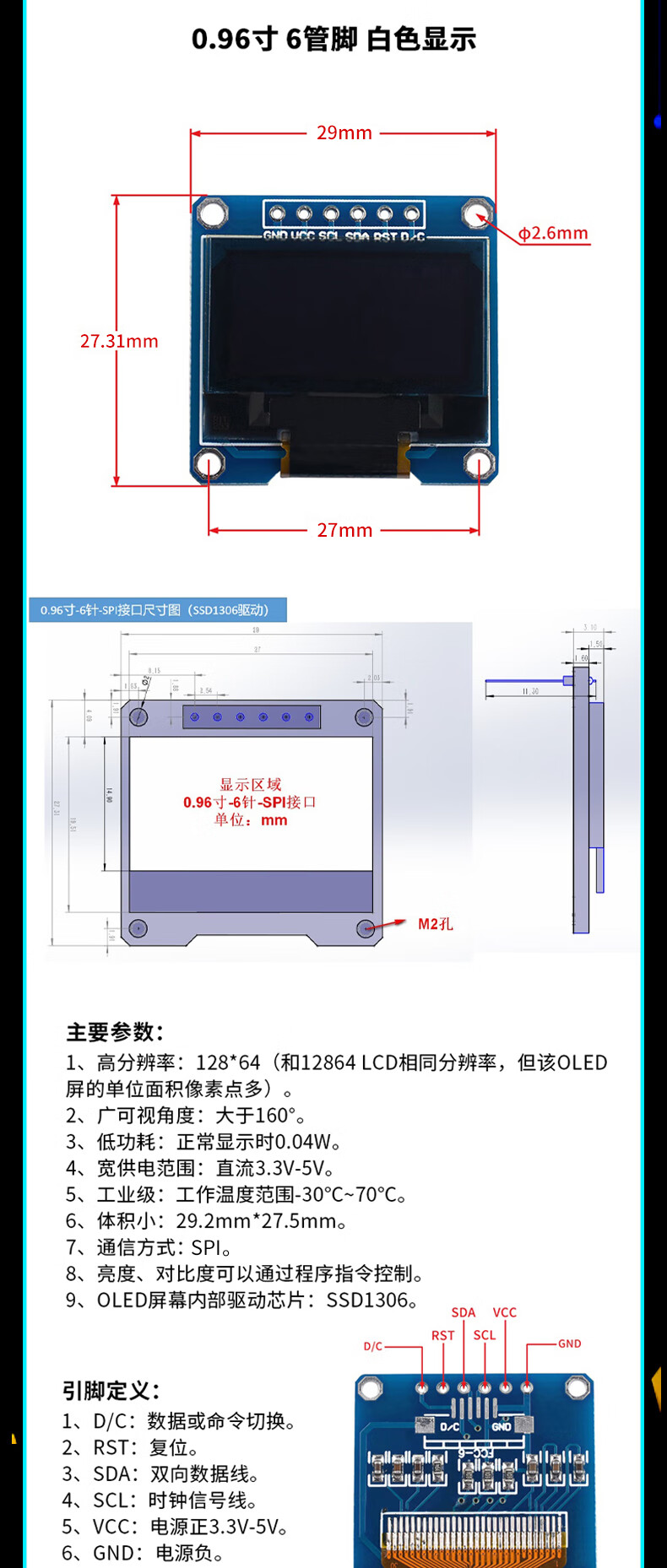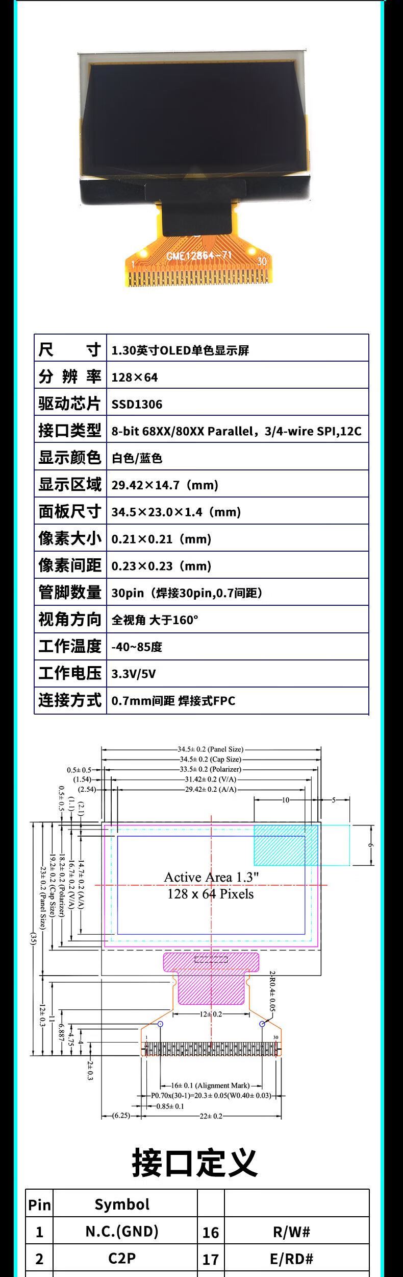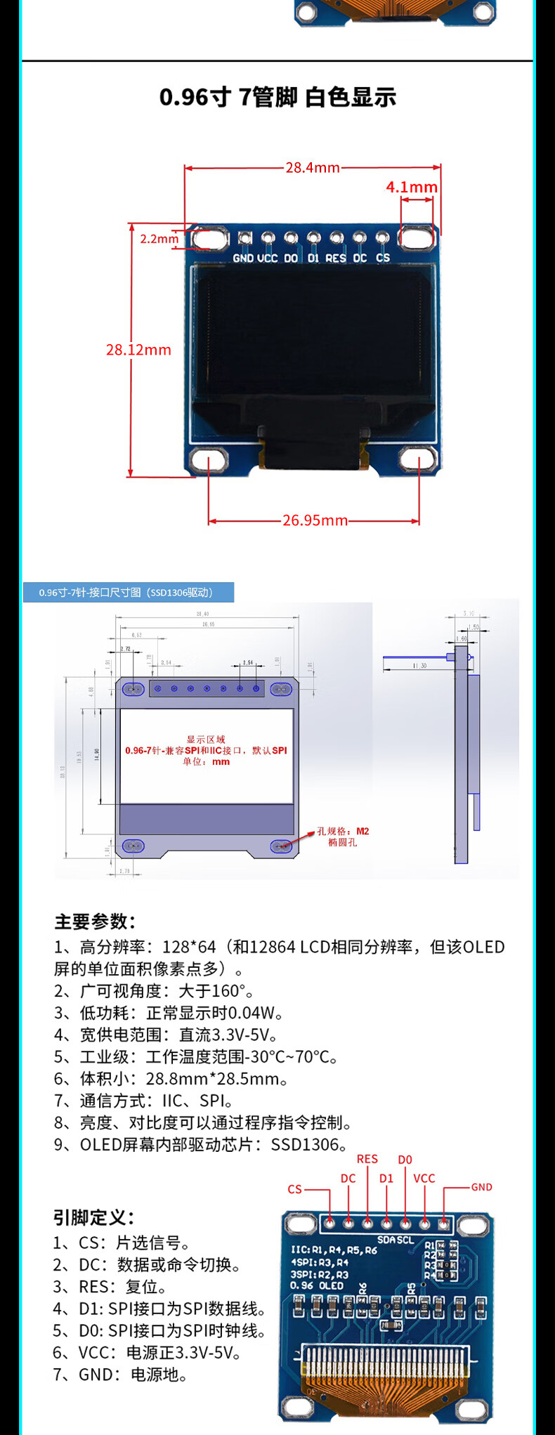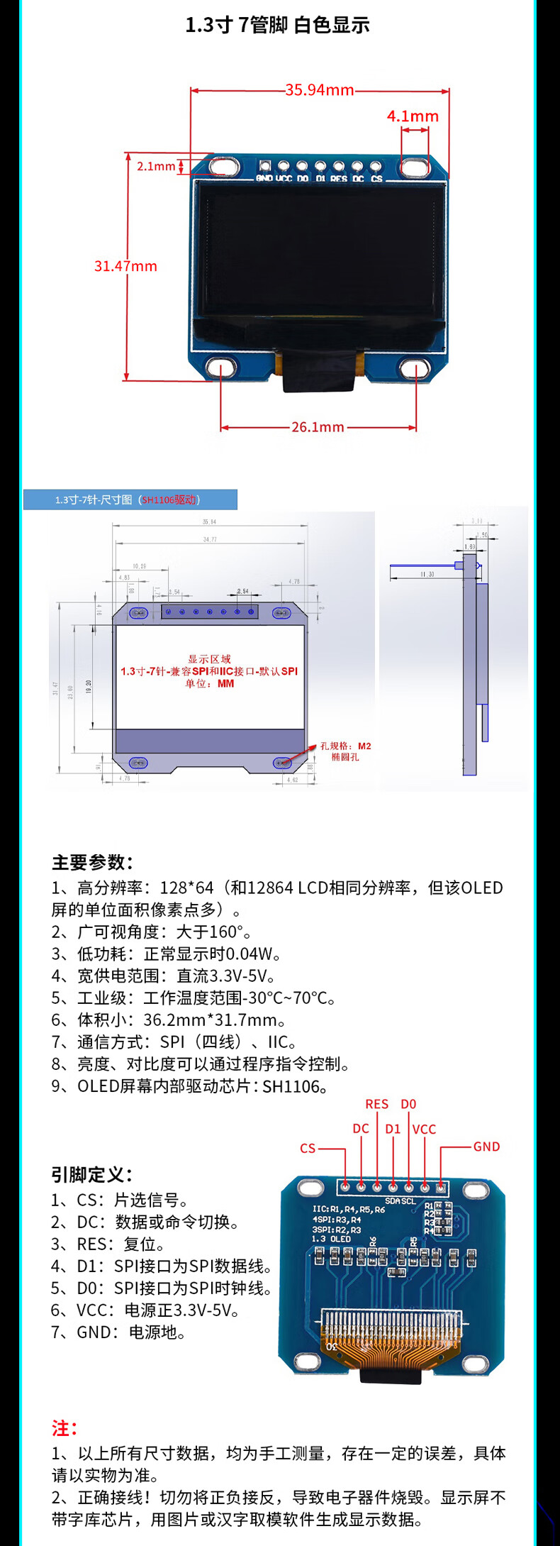 Green Shen 0.96-inch OLED display module 0.91 12864 screen 1.3-inch LCD screen 4/6/7-pin IIC/SPI 1.3-inch 7-pin white display