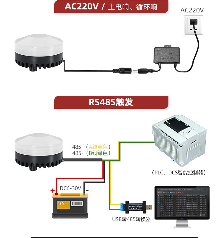Red, yellow and green sound and light alarm serial port modbus485 control three-color lights waterproof 12 voice warning YX75RYB screw type DC9V-30V RS485