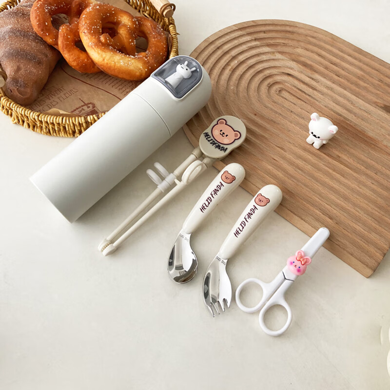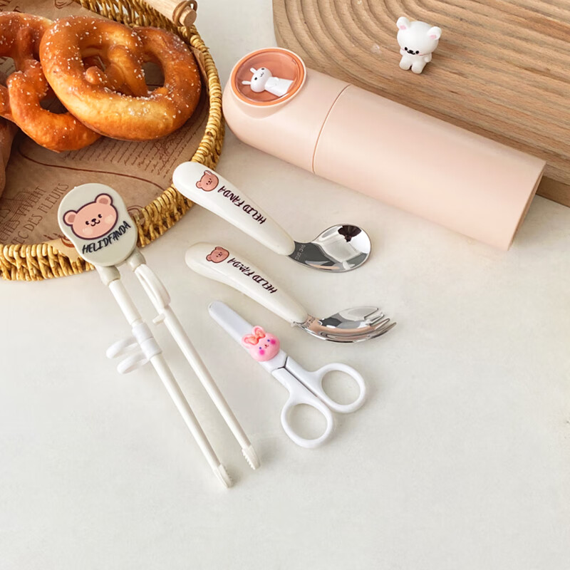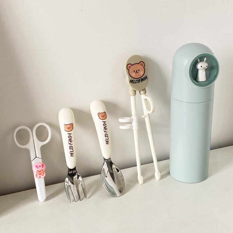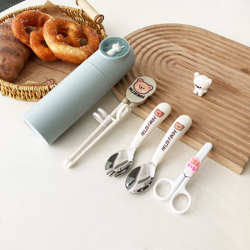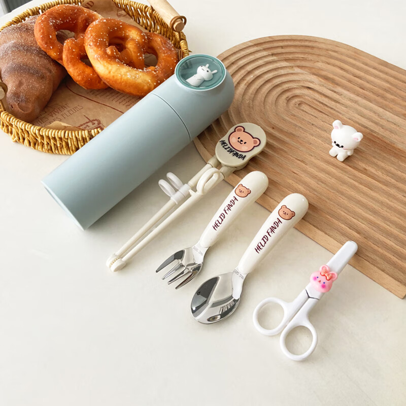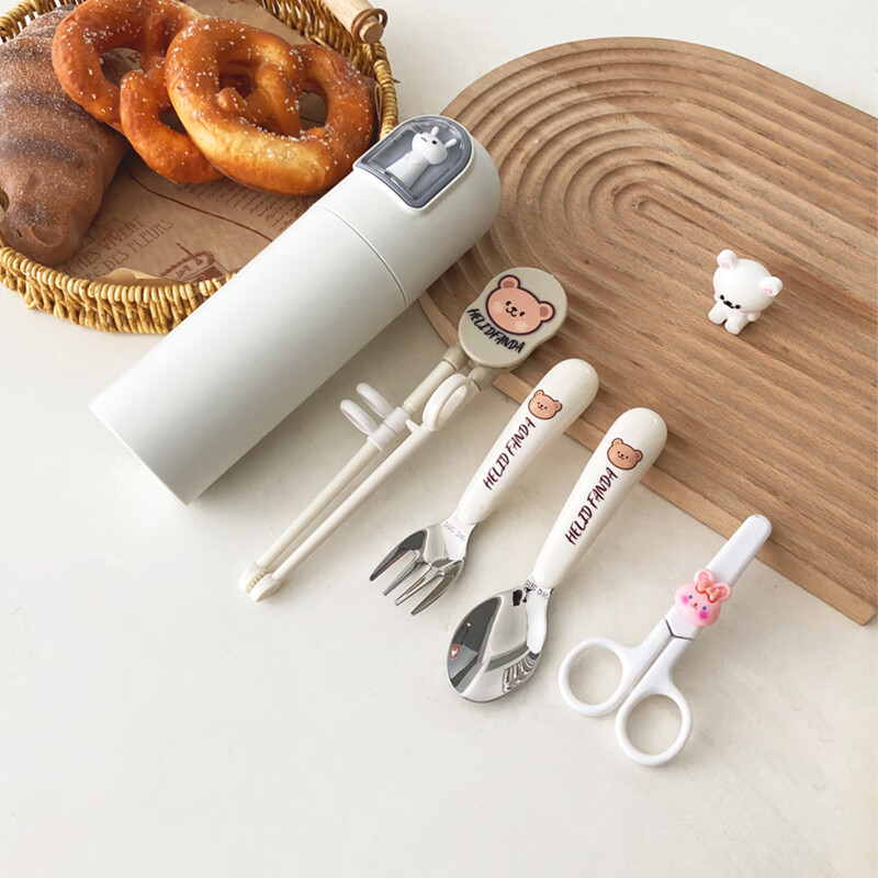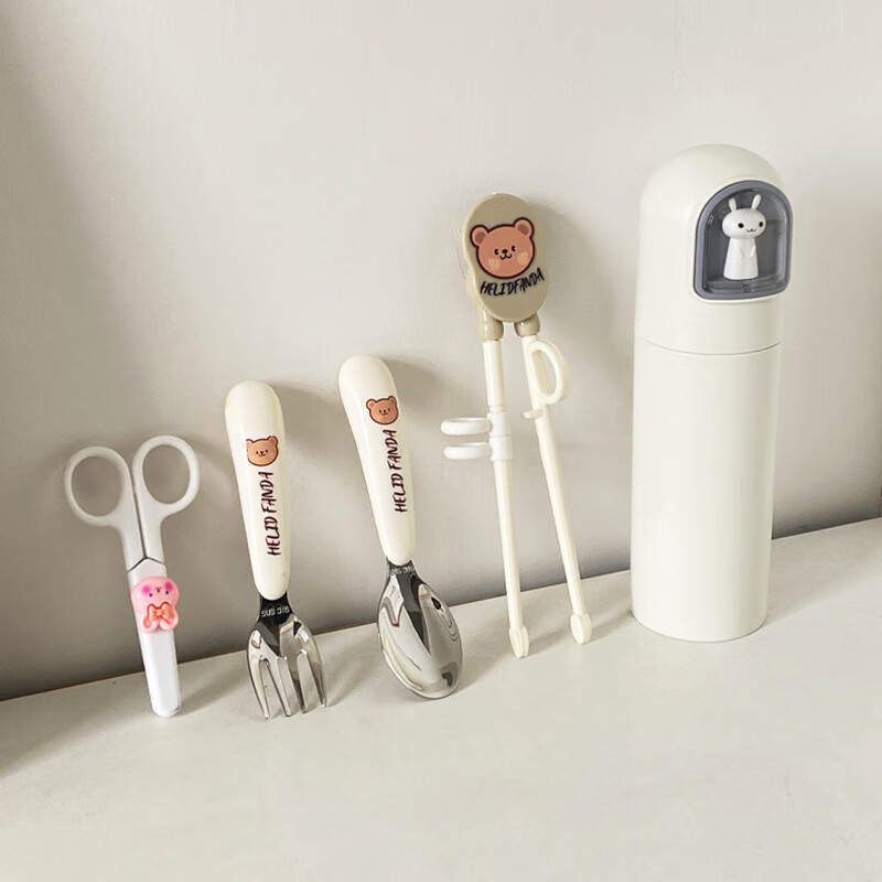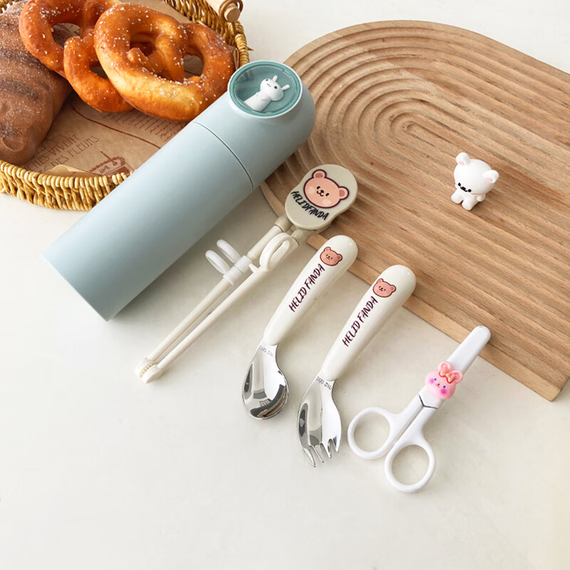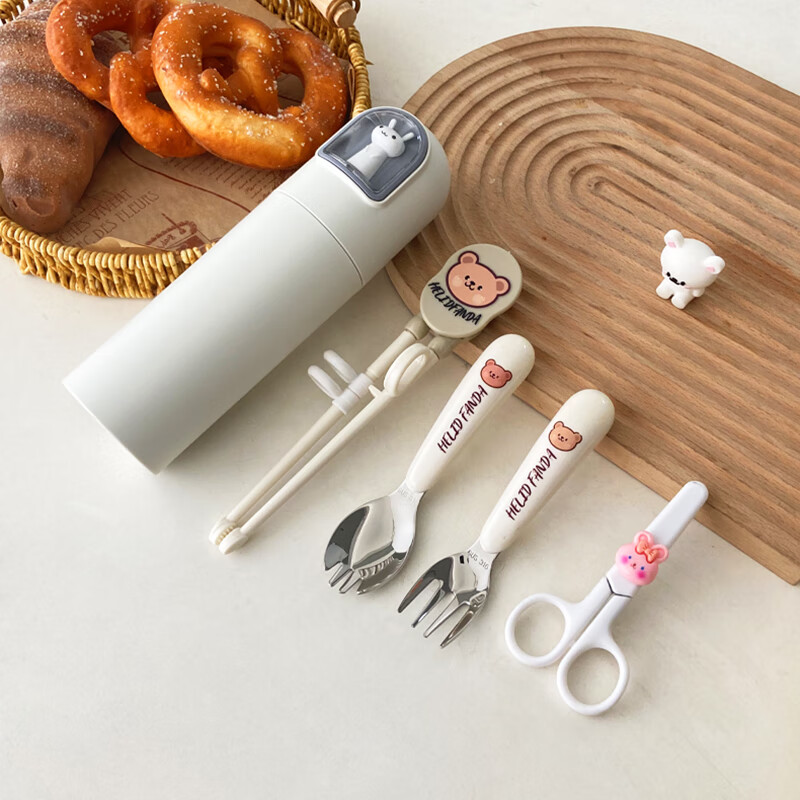 WORTHBUY 316 children's portable tableware stainless steel spoon, chopsticks and fork set training chopstick storage box cute tableware set off-white rabbit + 316 spoon + noodle fork + chopsticks + scissors 5 pieces