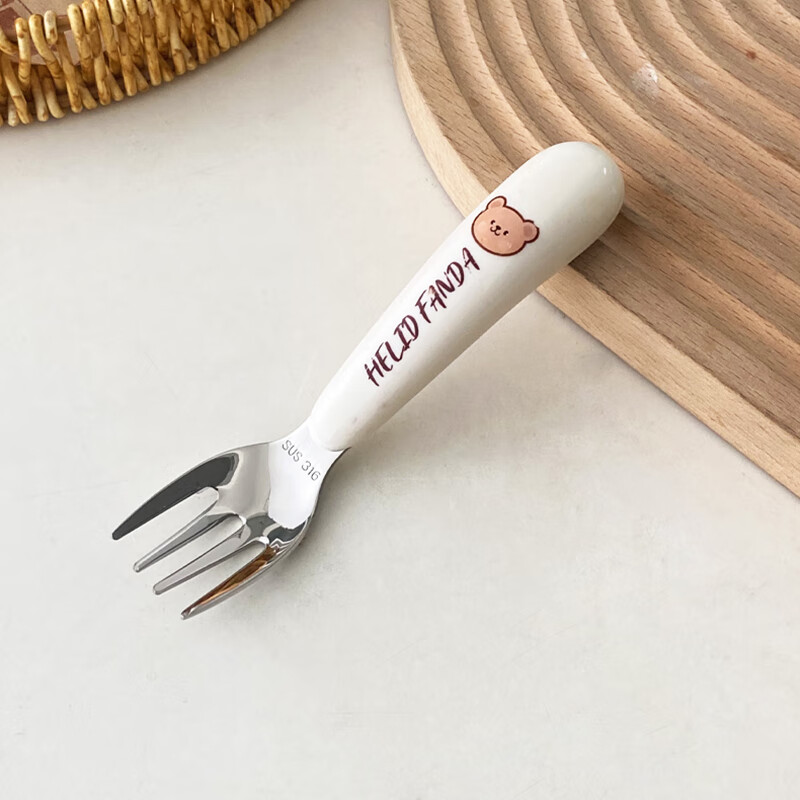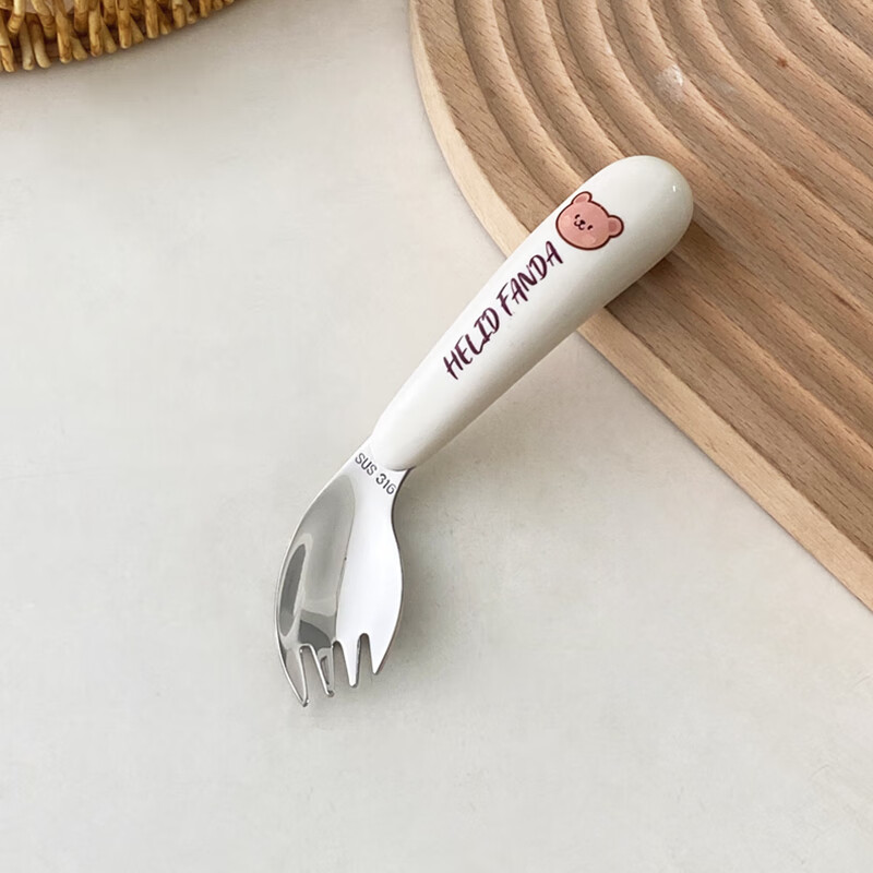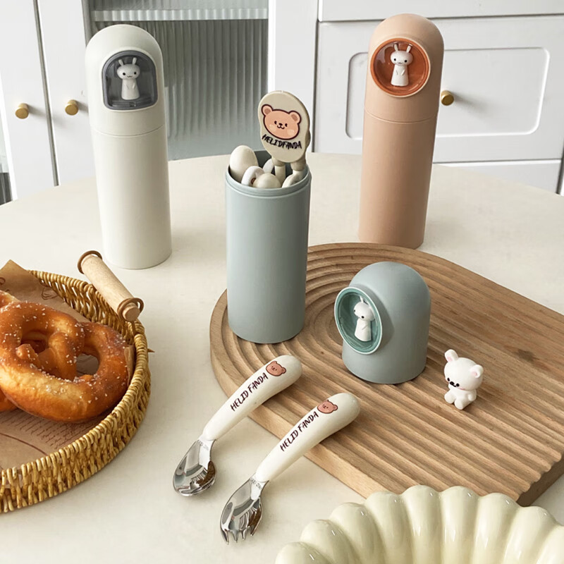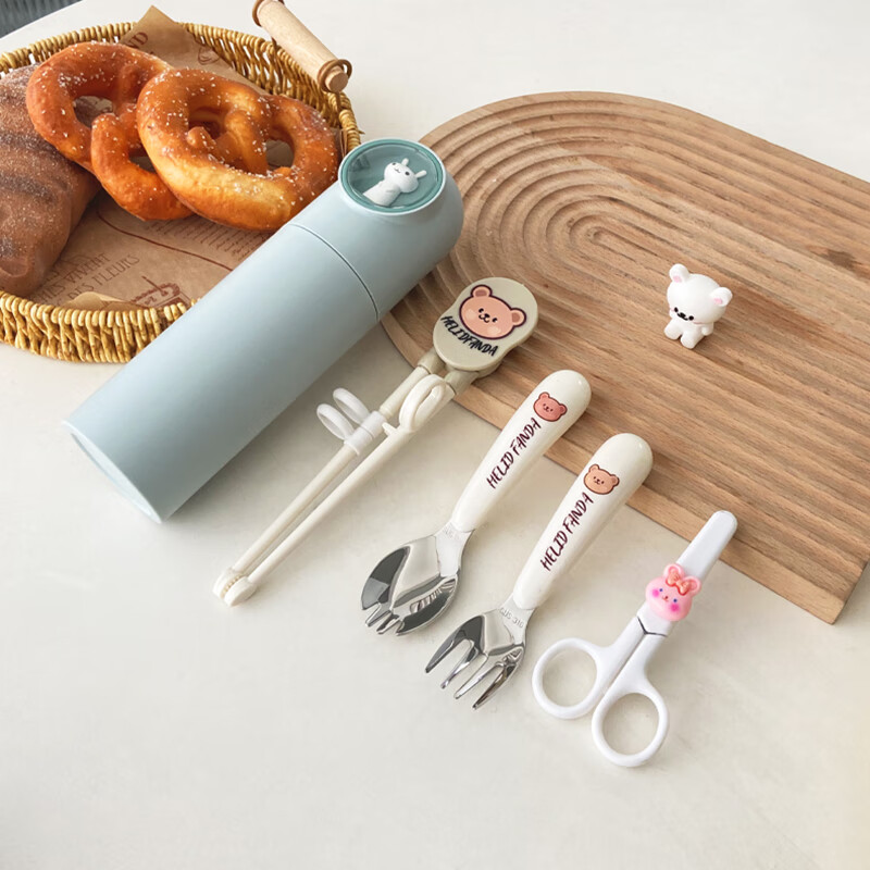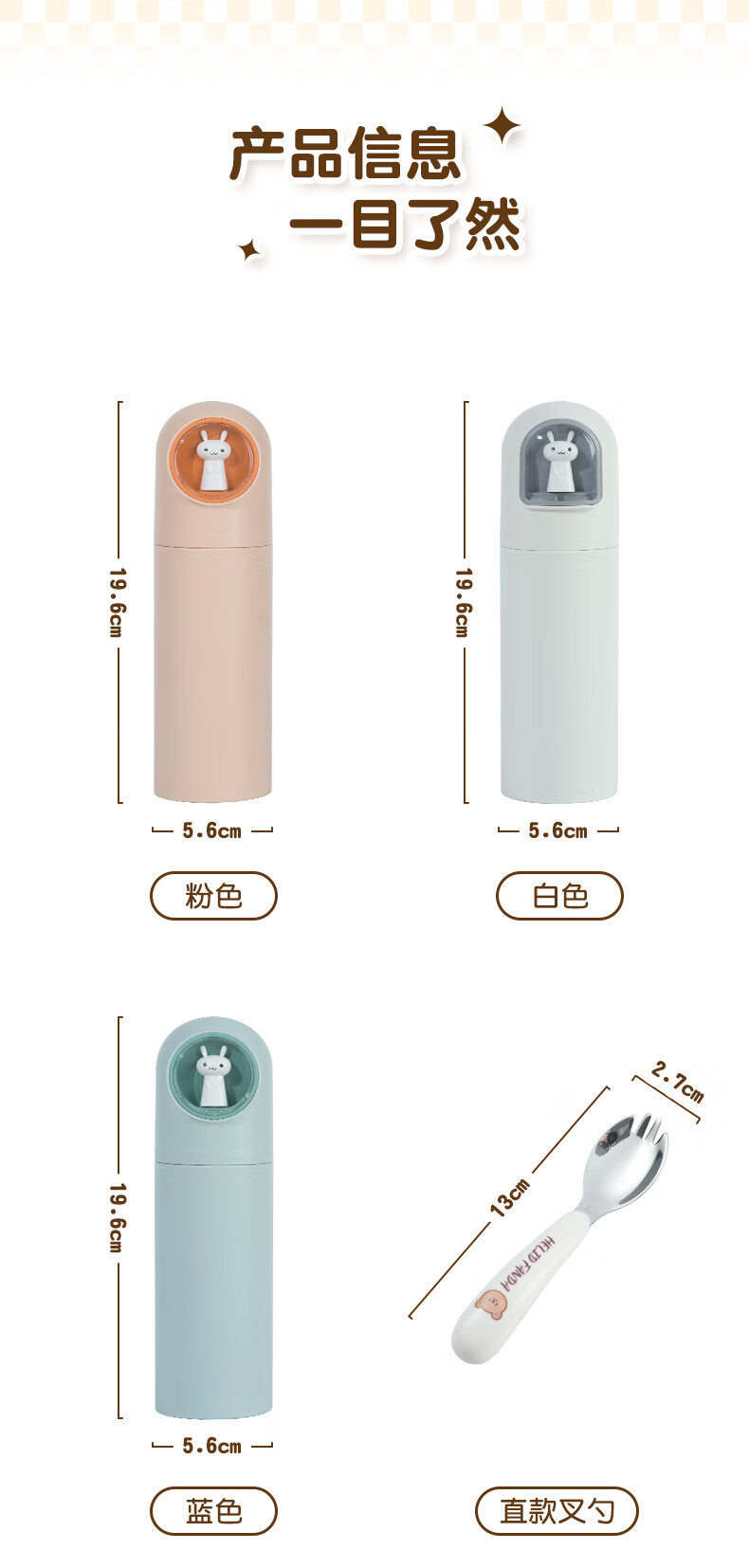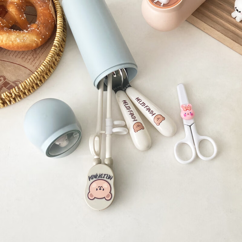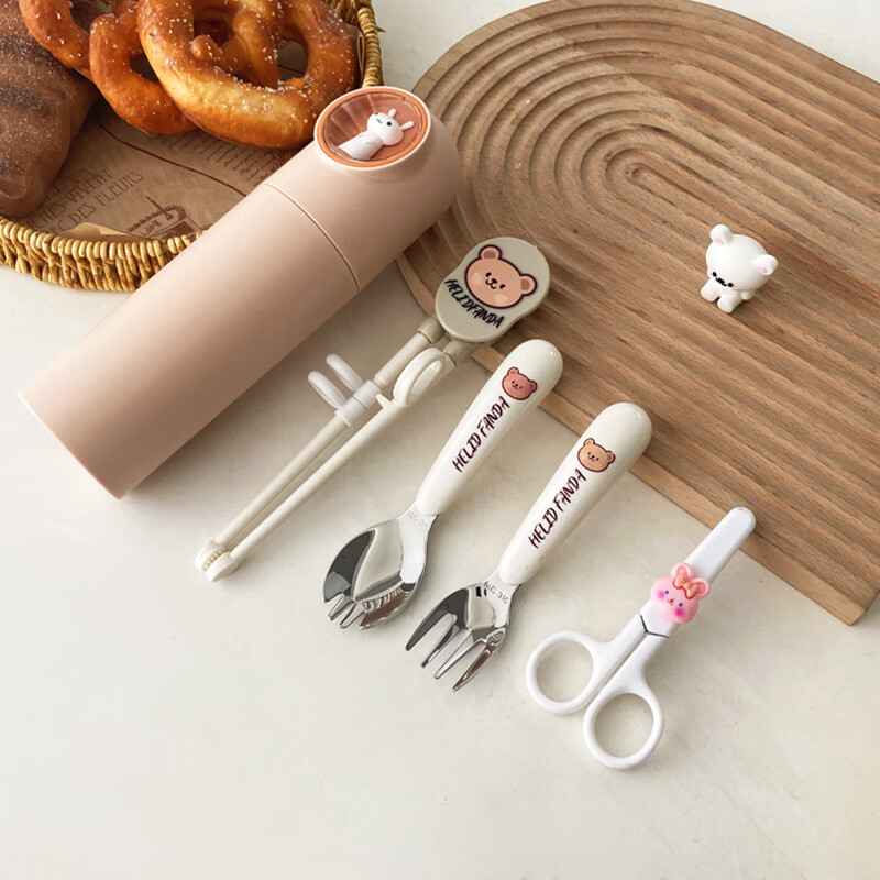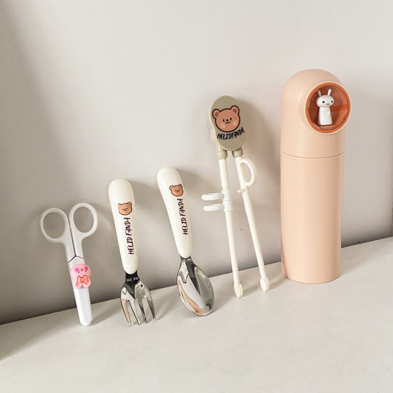 WORTHBUY 316 children's portable tableware stainless steel spoon, chopsticks and fork set training chopstick storage box cute tableware set off-white rabbit + 316 spoon + noodle fork + chopsticks + scissors 5 pieces