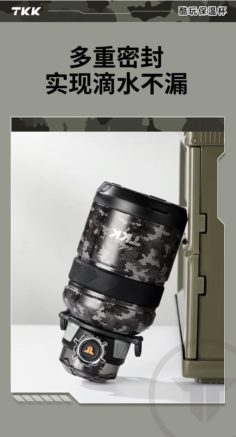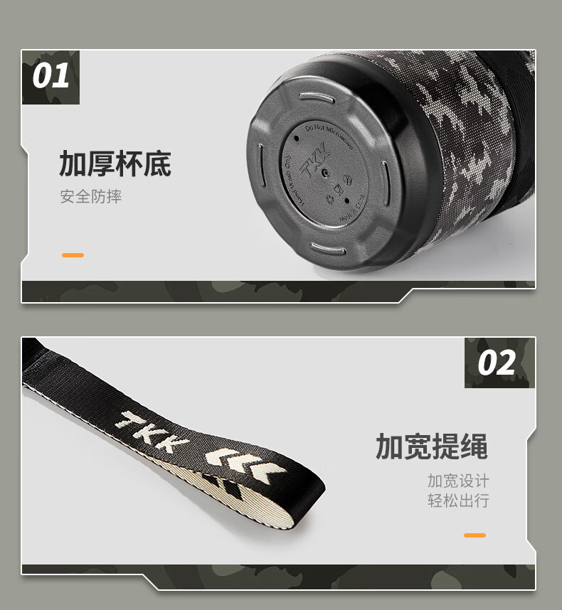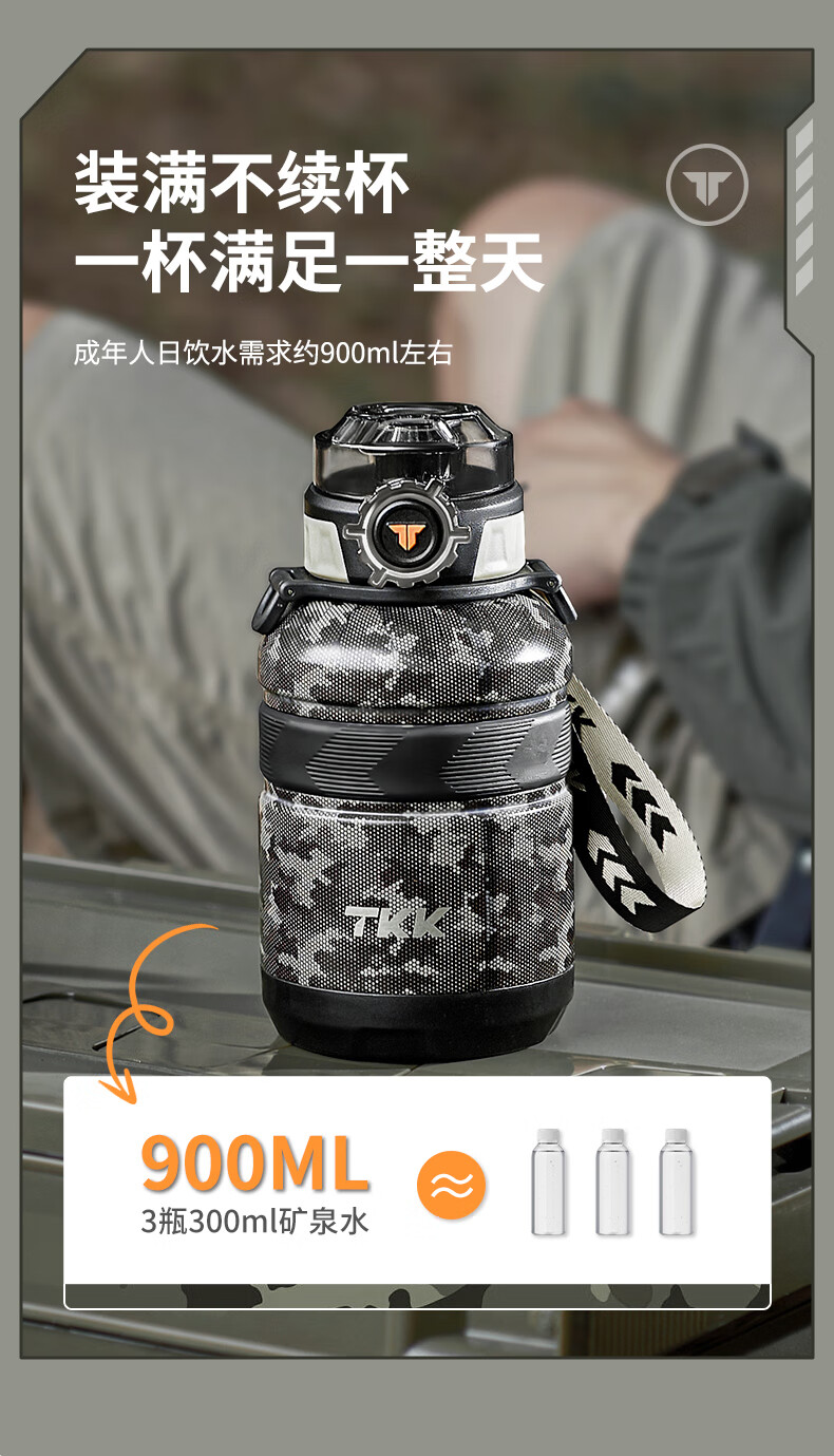 TKK insulated water cup for men, sports large-capacity 316 stainless steel outdoor military insulated ice-cold bottle, super orange + double drink + strap, long-lasting 900ml