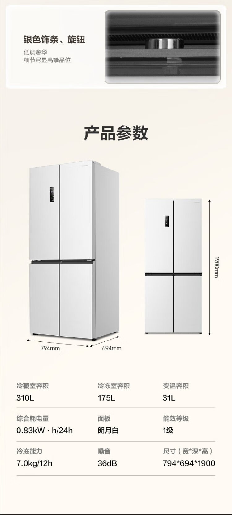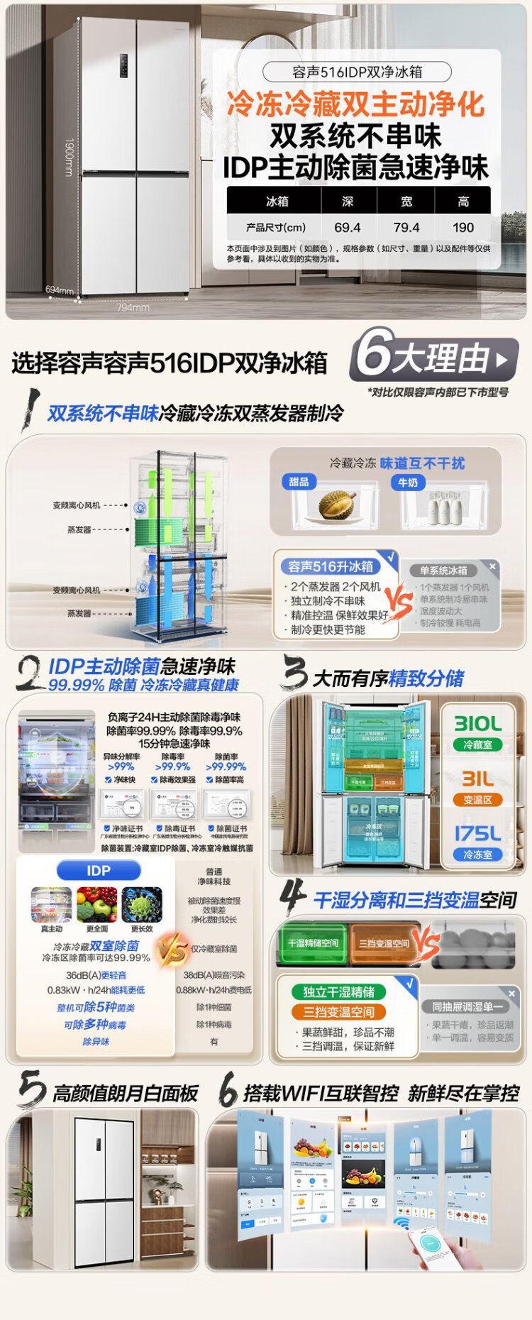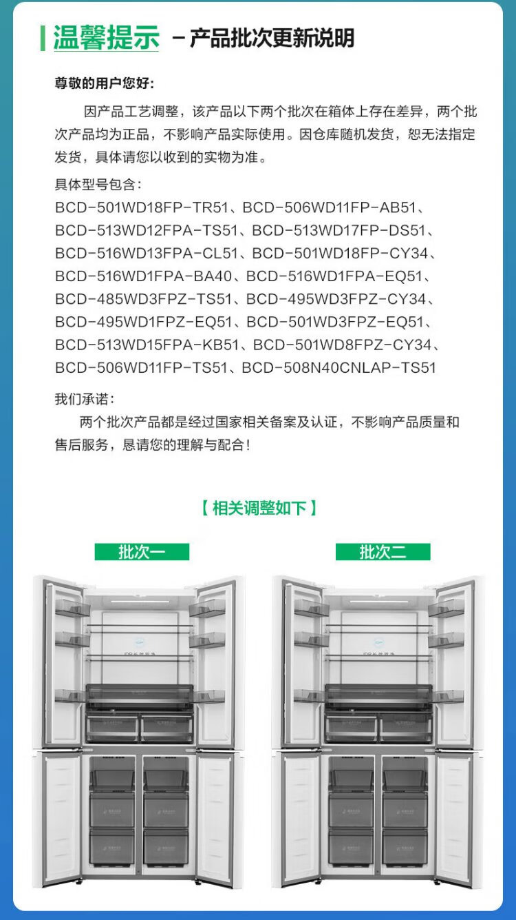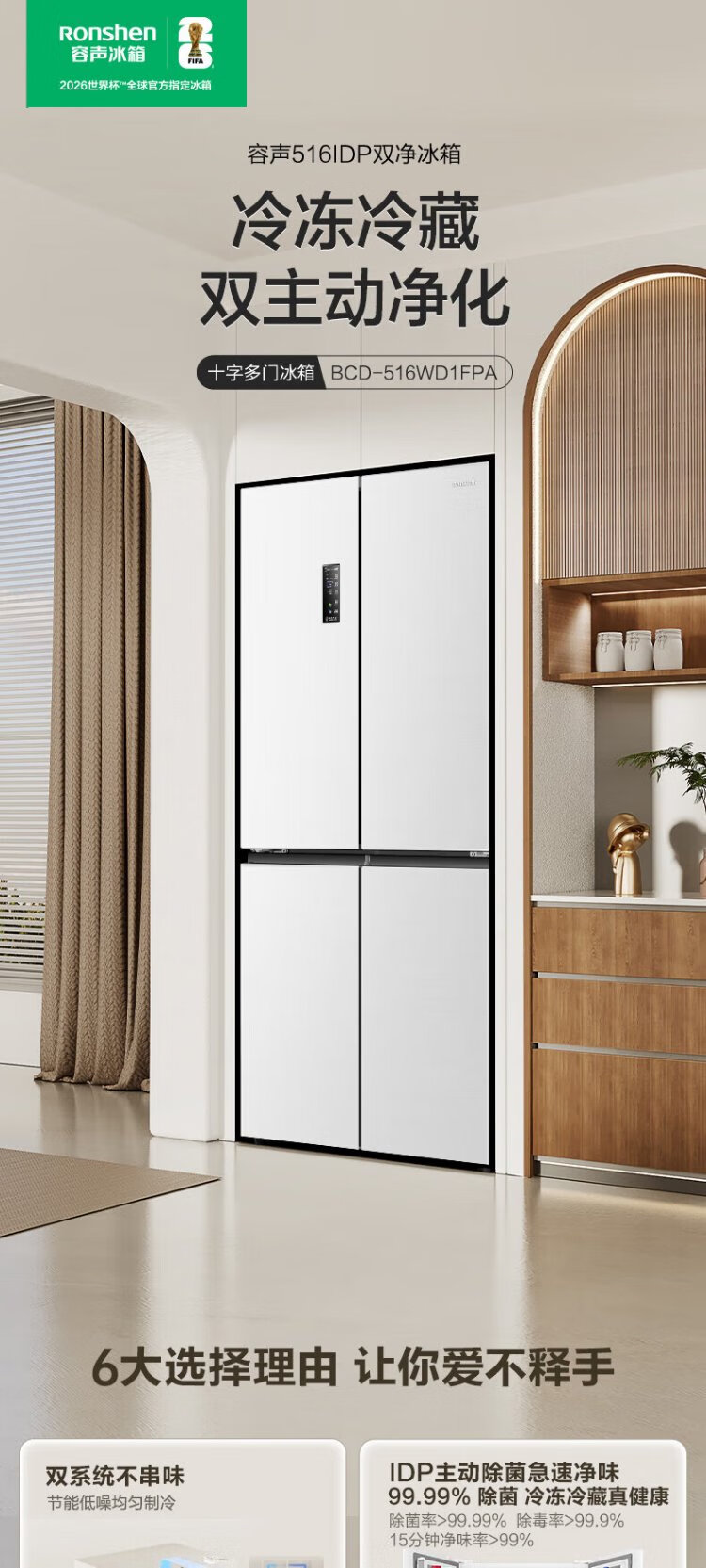 Rongsheng 516-liter dual-clean dual-system cross four-door refrigerator household first-class energy efficiency air-cooled frost-free large capacity BCD-516WD1FPA white national subsidy 526 cross model BCD-516WD1FPA white