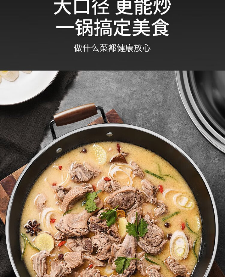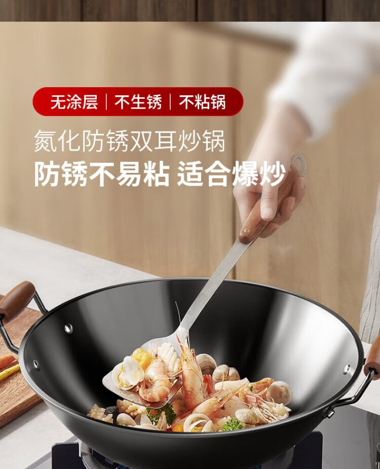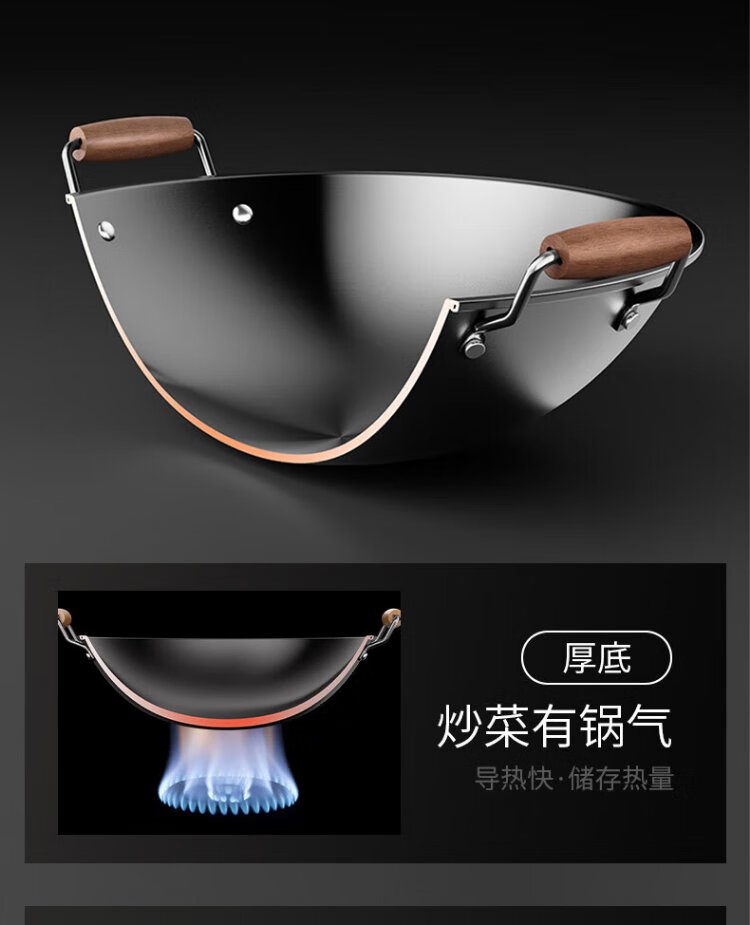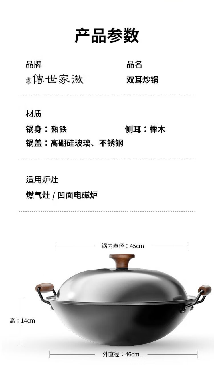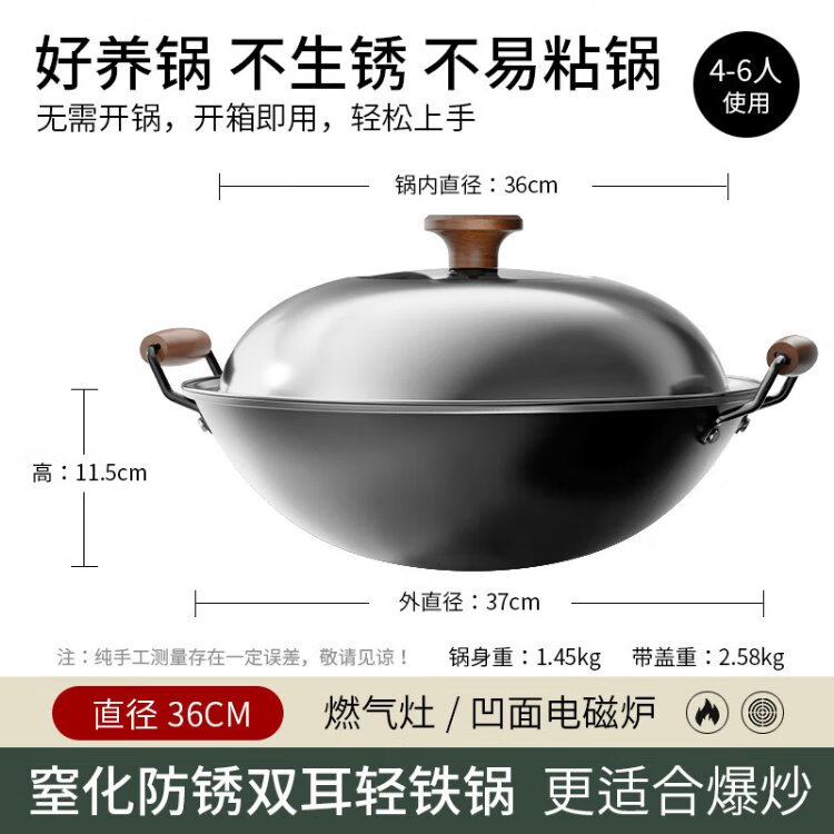 Heirloom family emblem iron pot double-eared wok uncoated cooking pot household old-fashioned wrought iron round bottom pot gas stove special enlarged and deepened 38cm round bottom + lid has opened the pot 38cm