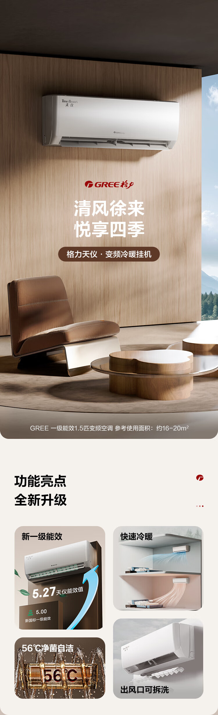Gree (GREE) air conditioner hanging Tianyi 1.5 HP / 1p New level of energy efficiency Frequency conversion for both heating and cooling Bacteria self-cleaning wall-mounted Home appliances trade-in National subsidy Tianyi First level energy efficiency 1.5 HP Applicable area is about 16-20