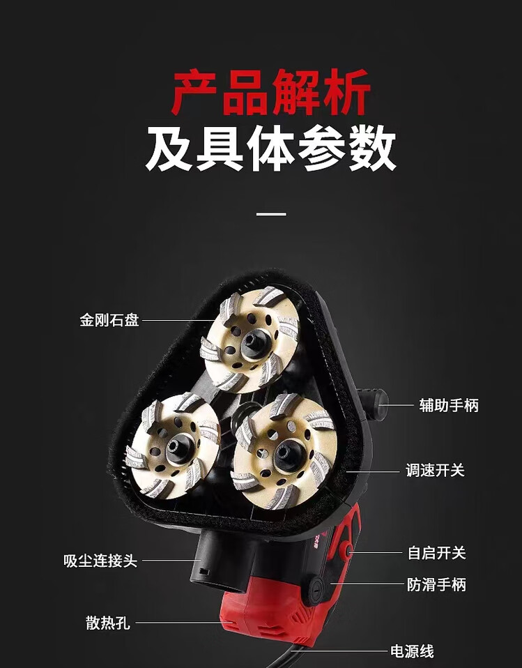 Lightspeed handheld three-head dust-free grinder floor grinder edge grinding concrete cement floor renovation terrazzo epoxy three-head grinder + handheld bracket + aluminum shell vacuum cleaner