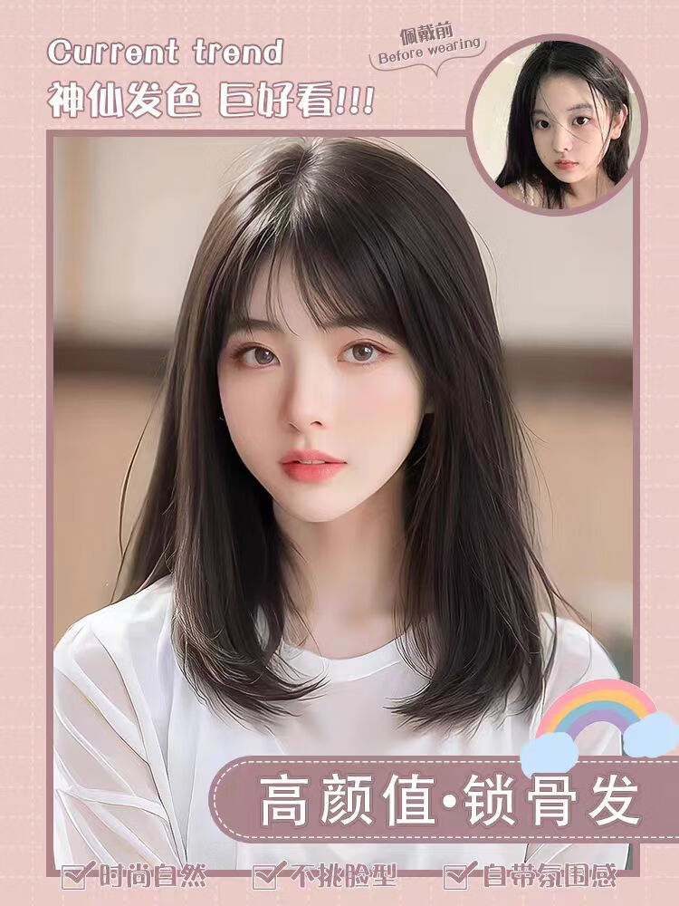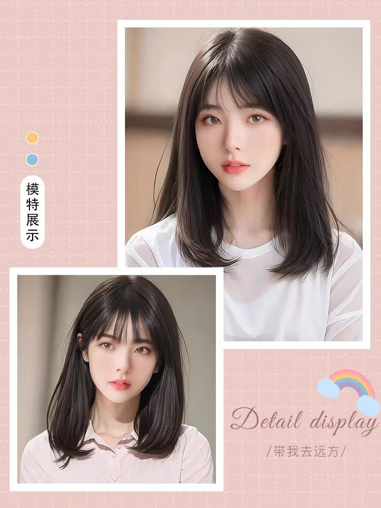 Sibes wig women's medium-long hair shoulder-length clavicle hair daily natural air bangs short hair simulated human hair full headband style natural black hair network hair card