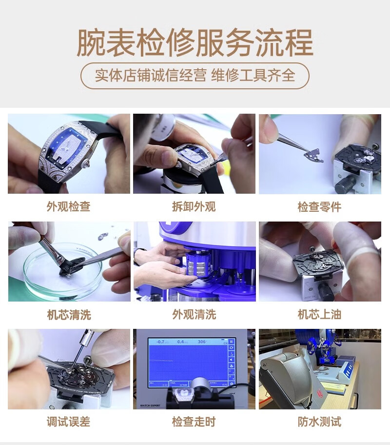 Watch repair, mechanical watch cleaning, oil maintenance, quartz watch glass crown replacement, Tissot strap battery refurbishment, luxury watch repair, appointment service, full service