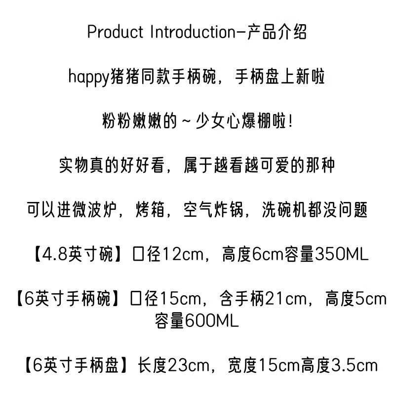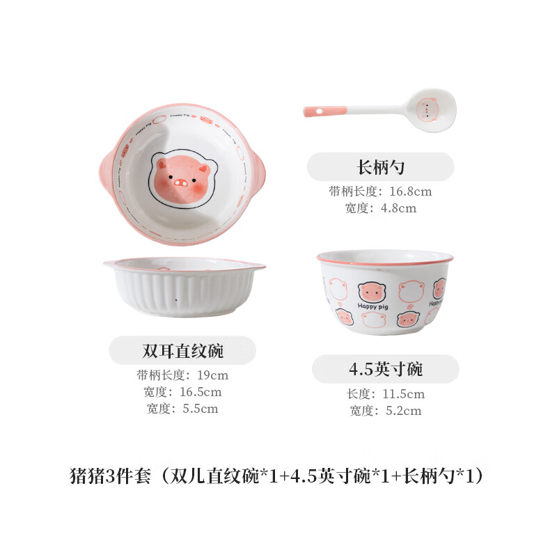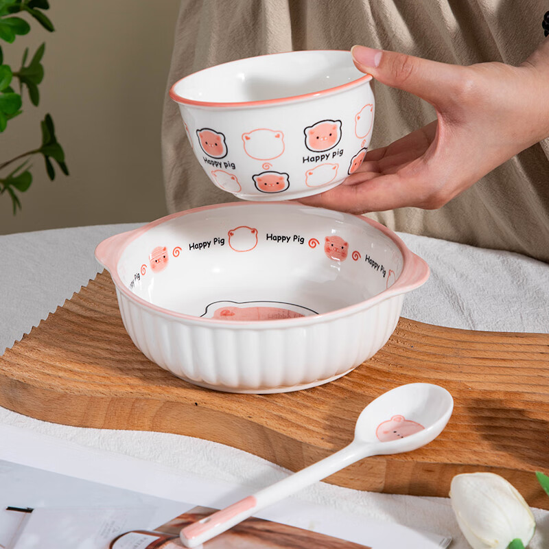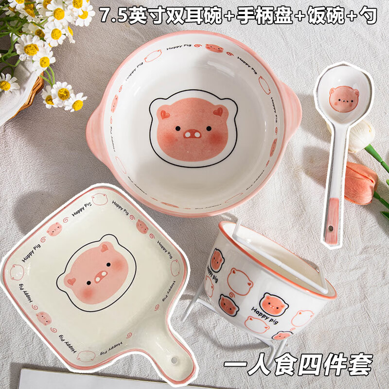 Midoriyaki Happy Pig One-Eat Cute Girly Tableware Hand-Handed Rice Bowl Baked Rice Bowl Ceramic Underglaze Colored Tableware Set 4 Pieces Cute Pig Handle Bowl + Handle Plate + Bowl + Spoon