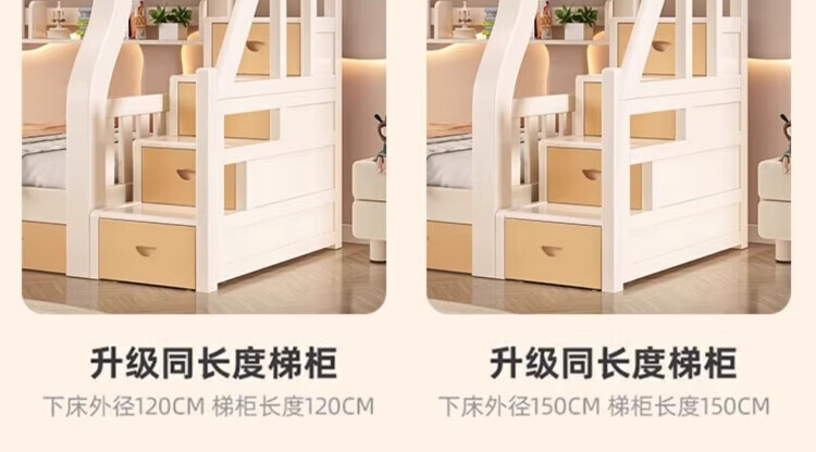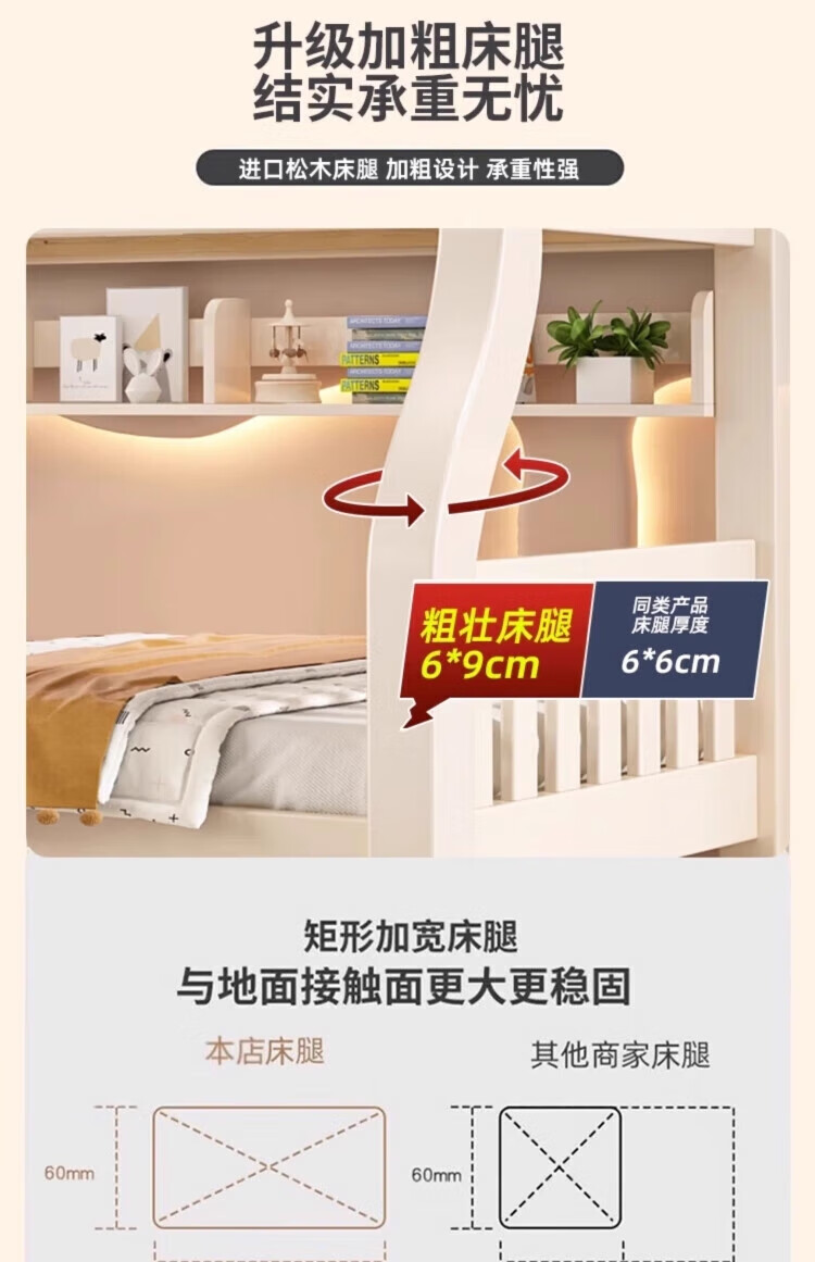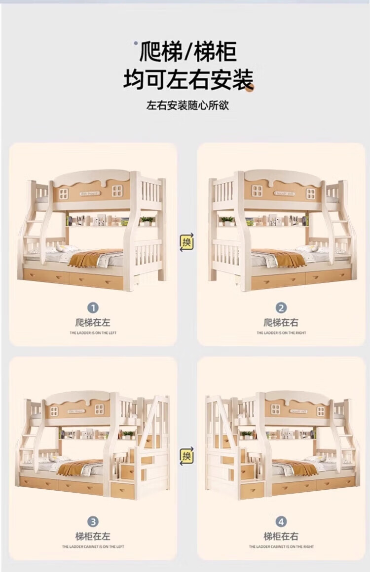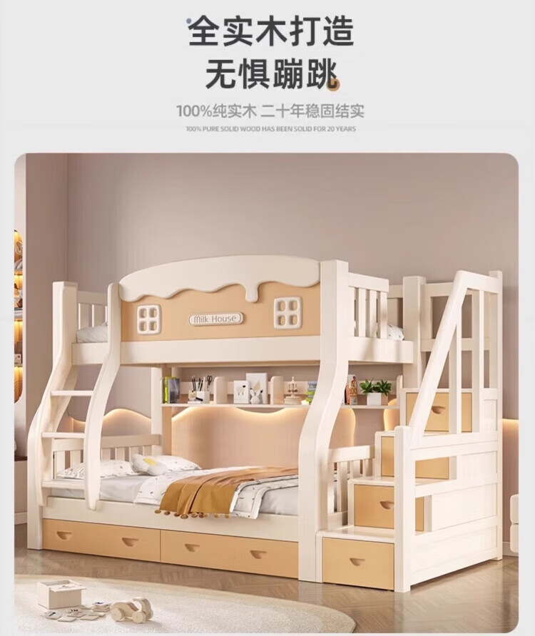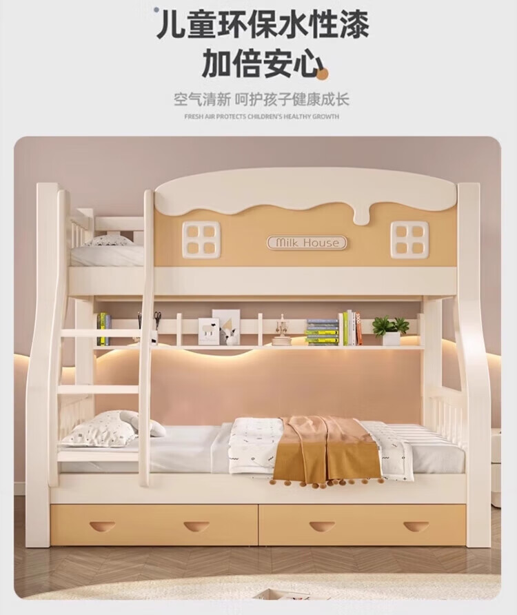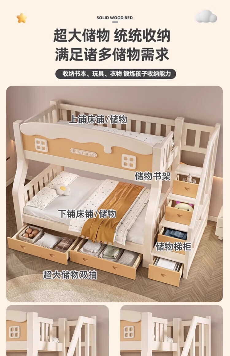 Leiyang all solid wood upper and lower bed, cream style cartoon bunk bed, small apartment multi-functional wooden bed double solid wood high and low bed, ladder cabinet upper 115 lower 135 bookshelf drawer mattress * 2 package installation