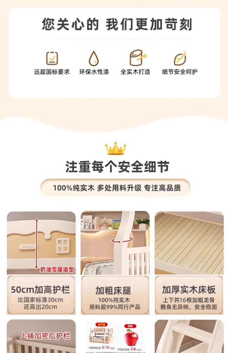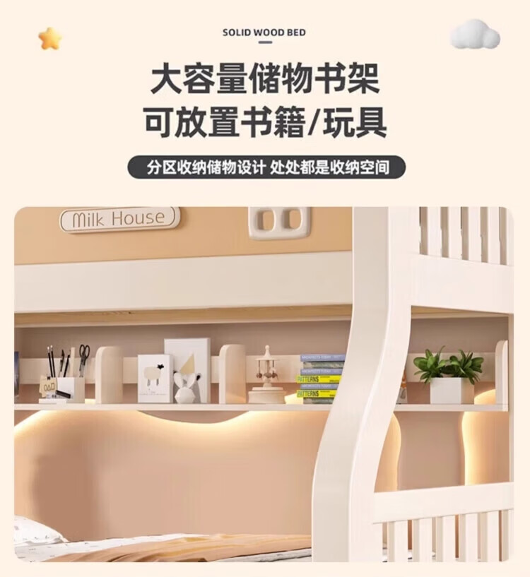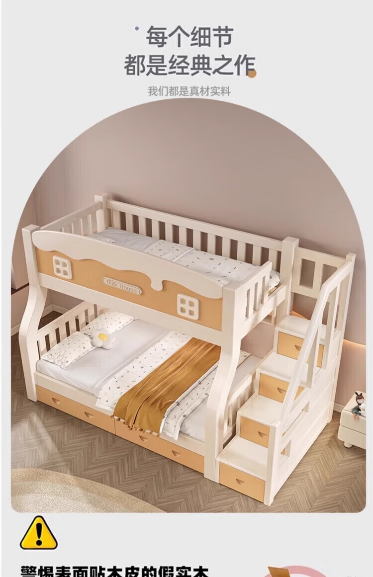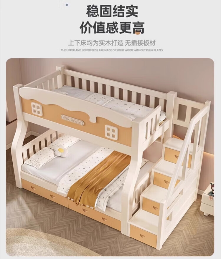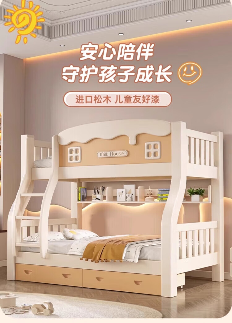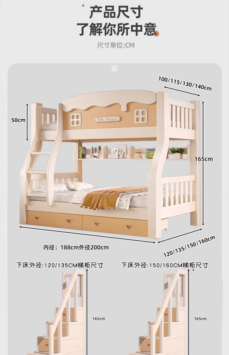 Leiyang all solid wood upper and lower bed, cream style cartoon bunk bed, small apartment multi-functional wooden bed double solid wood high and low bed, ladder cabinet upper 115 lower 135 bookshelf drawer mattress * 2 package installation