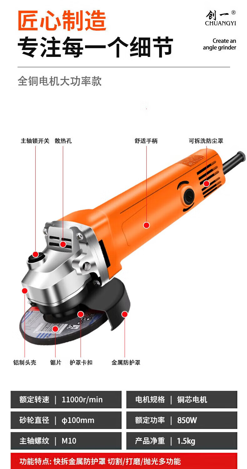Chuangyi Multifunctional Household Polishing Machine Hand Grinder Polishing Grinding Cutting Machine Hand Grinder Angle Grinder Fixed Speed Practical Package