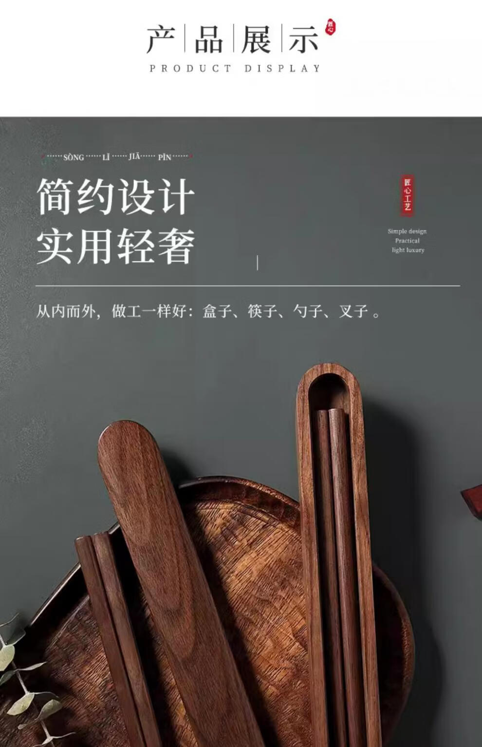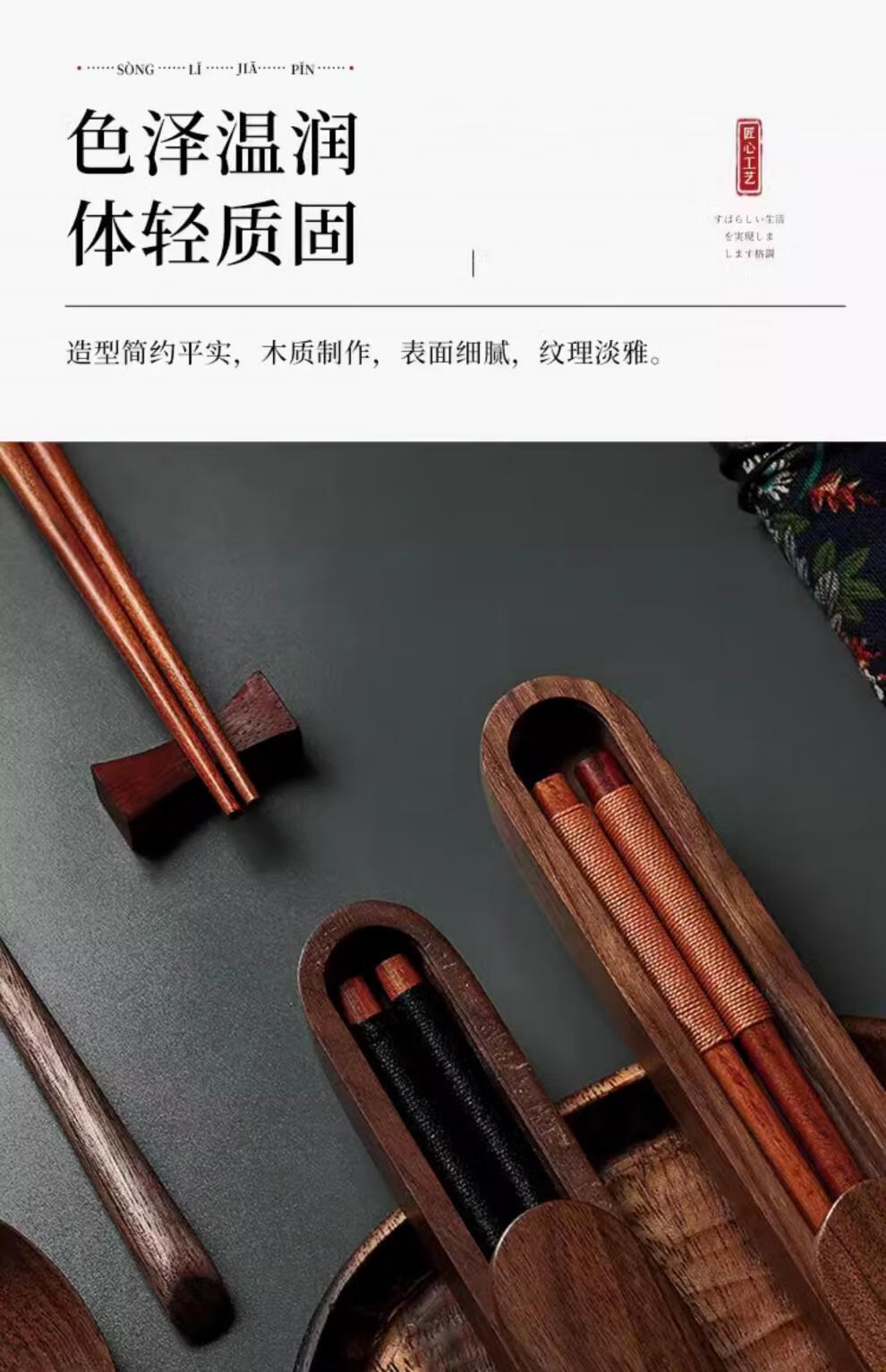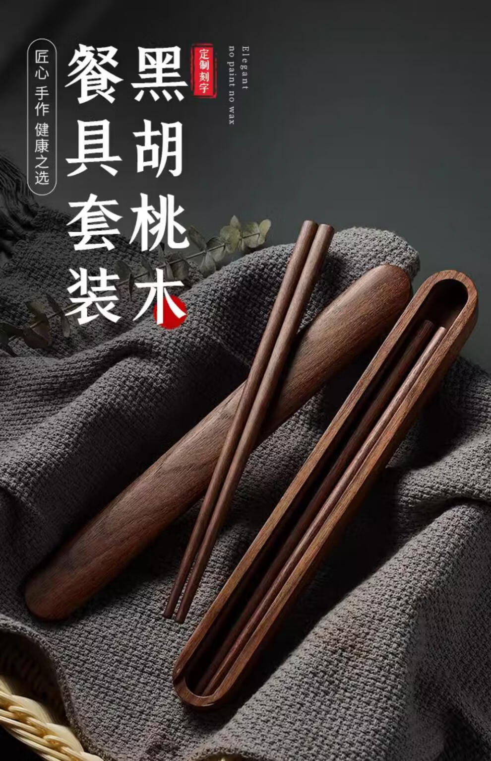ZISIZ walnut chopsticks and spoon set portable tableware three-piece set single solid wood chopstick storage box customized walnut chopsticks + spoon + fork + ethnic cloth bag