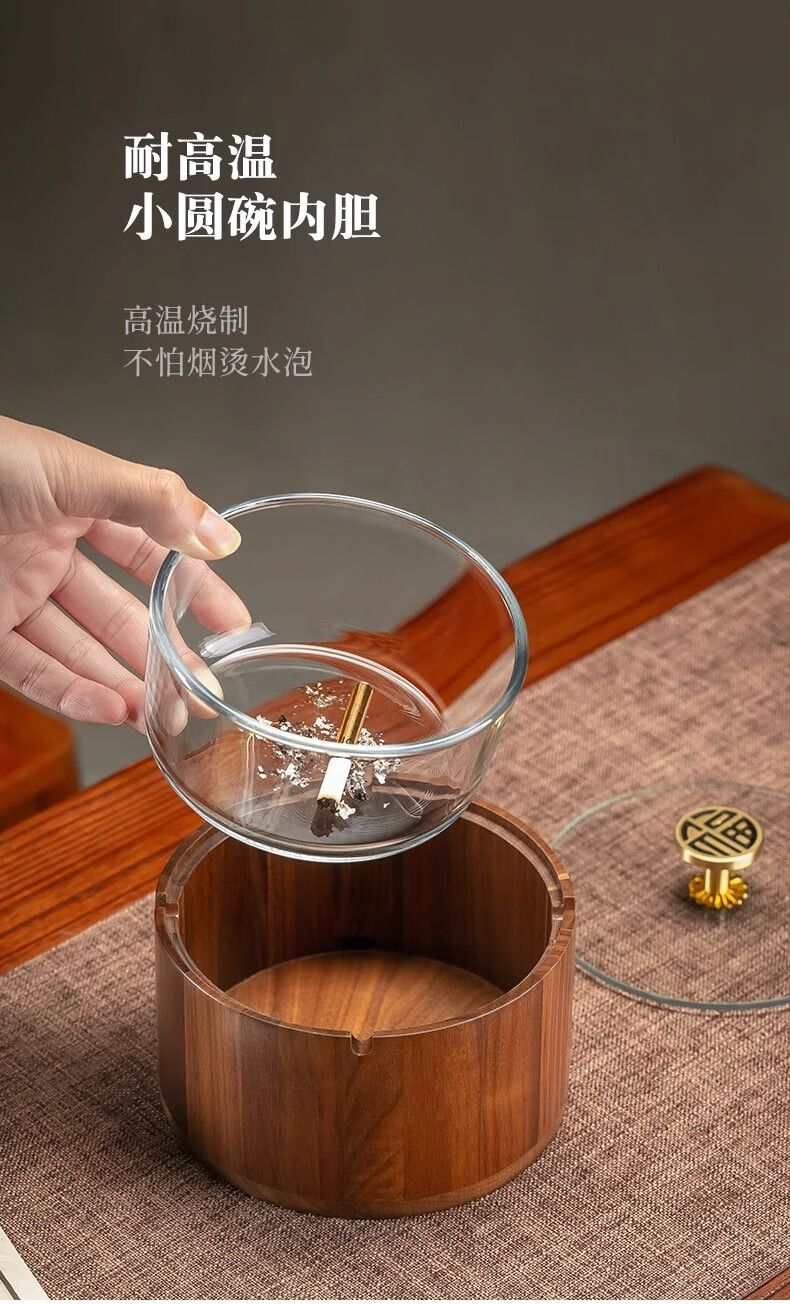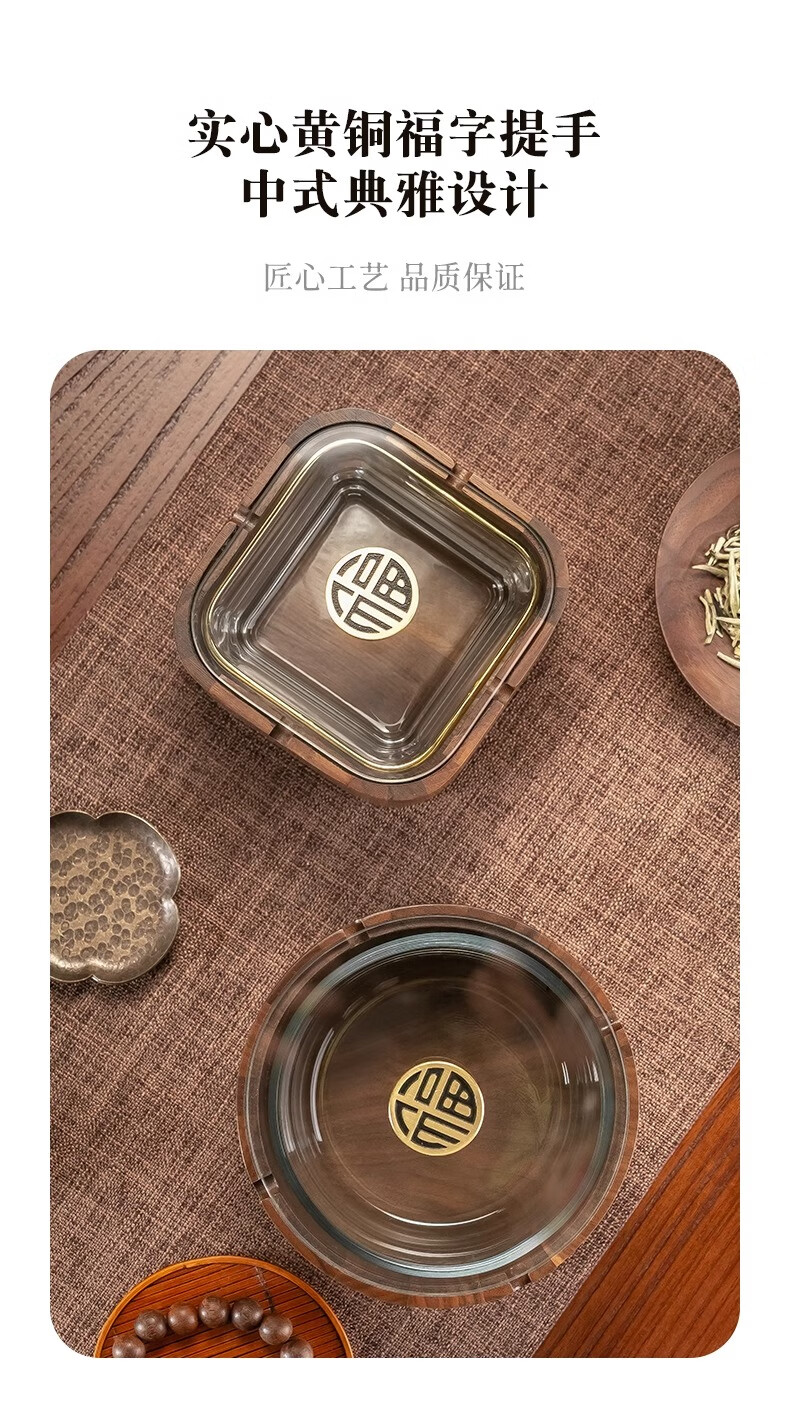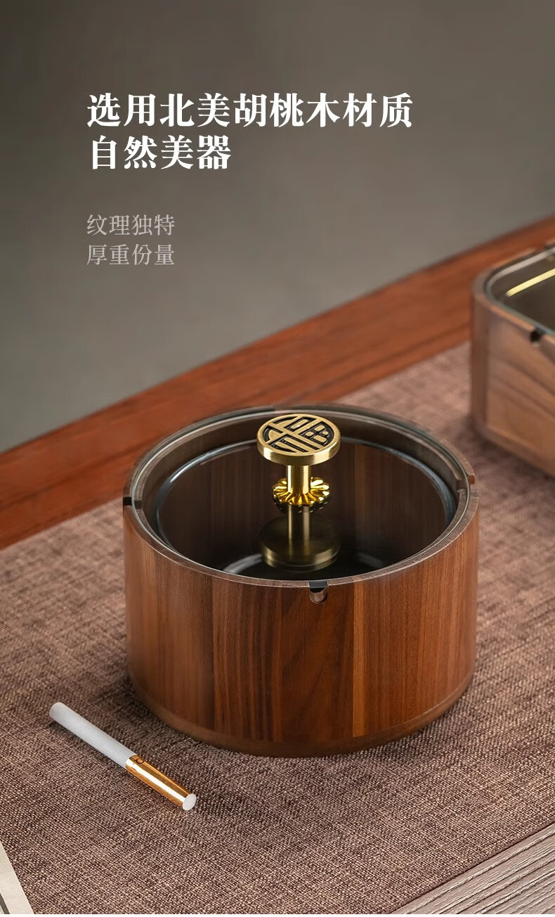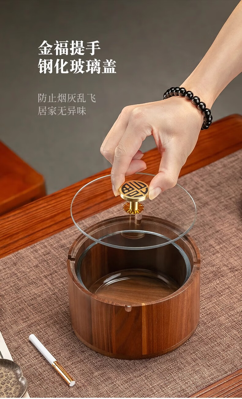 Genasi solid wood ashtray high-end anti-fly ash commercial office home living room hotel Chinese style ashtray with cover high-end round Jinfu brass handle glass liner
