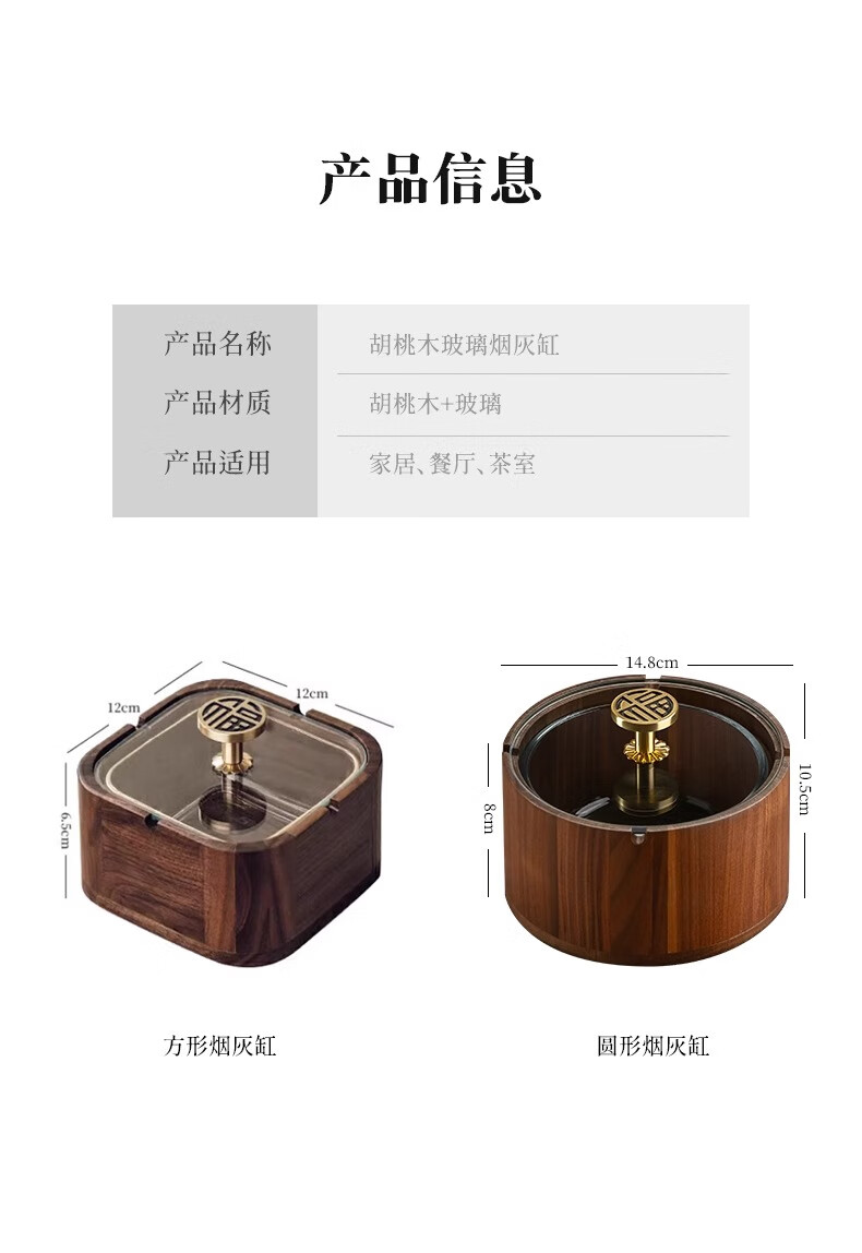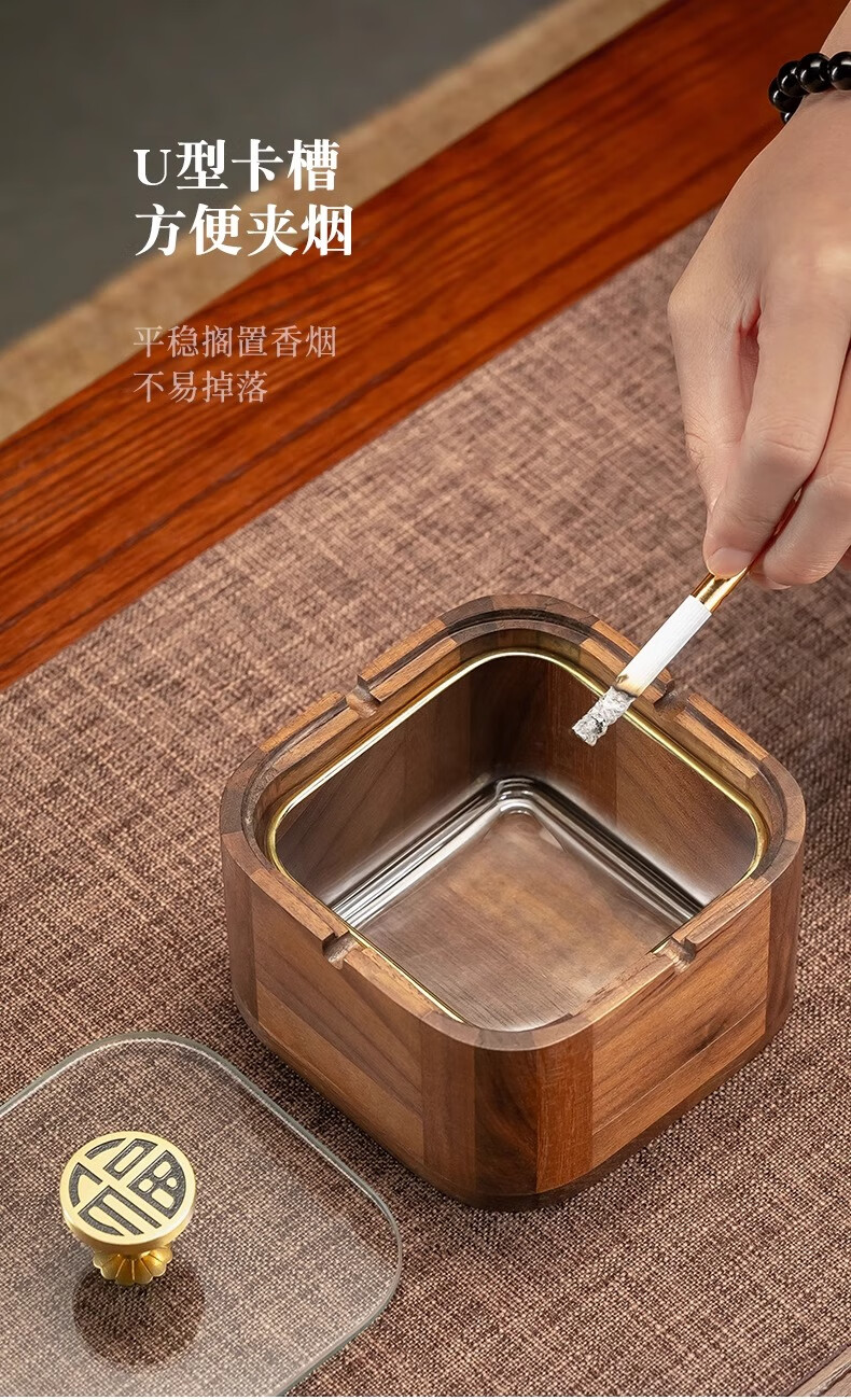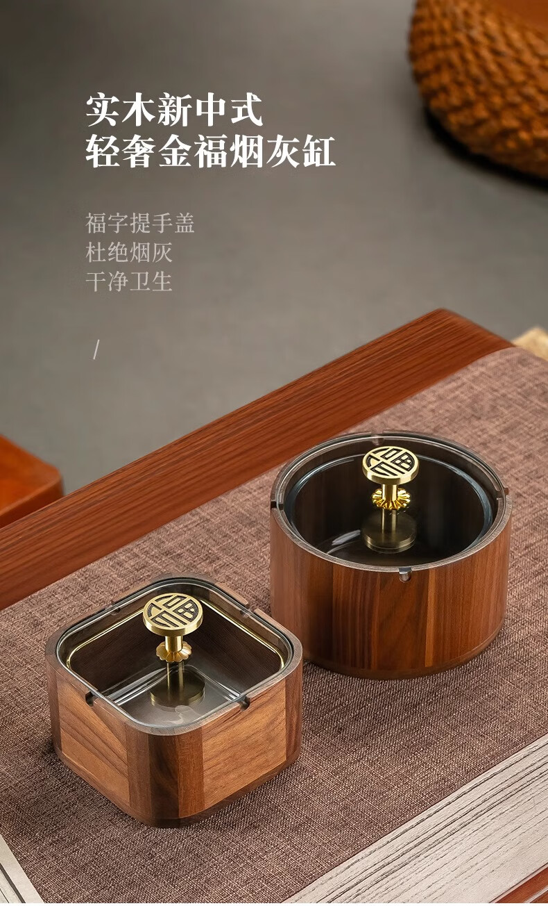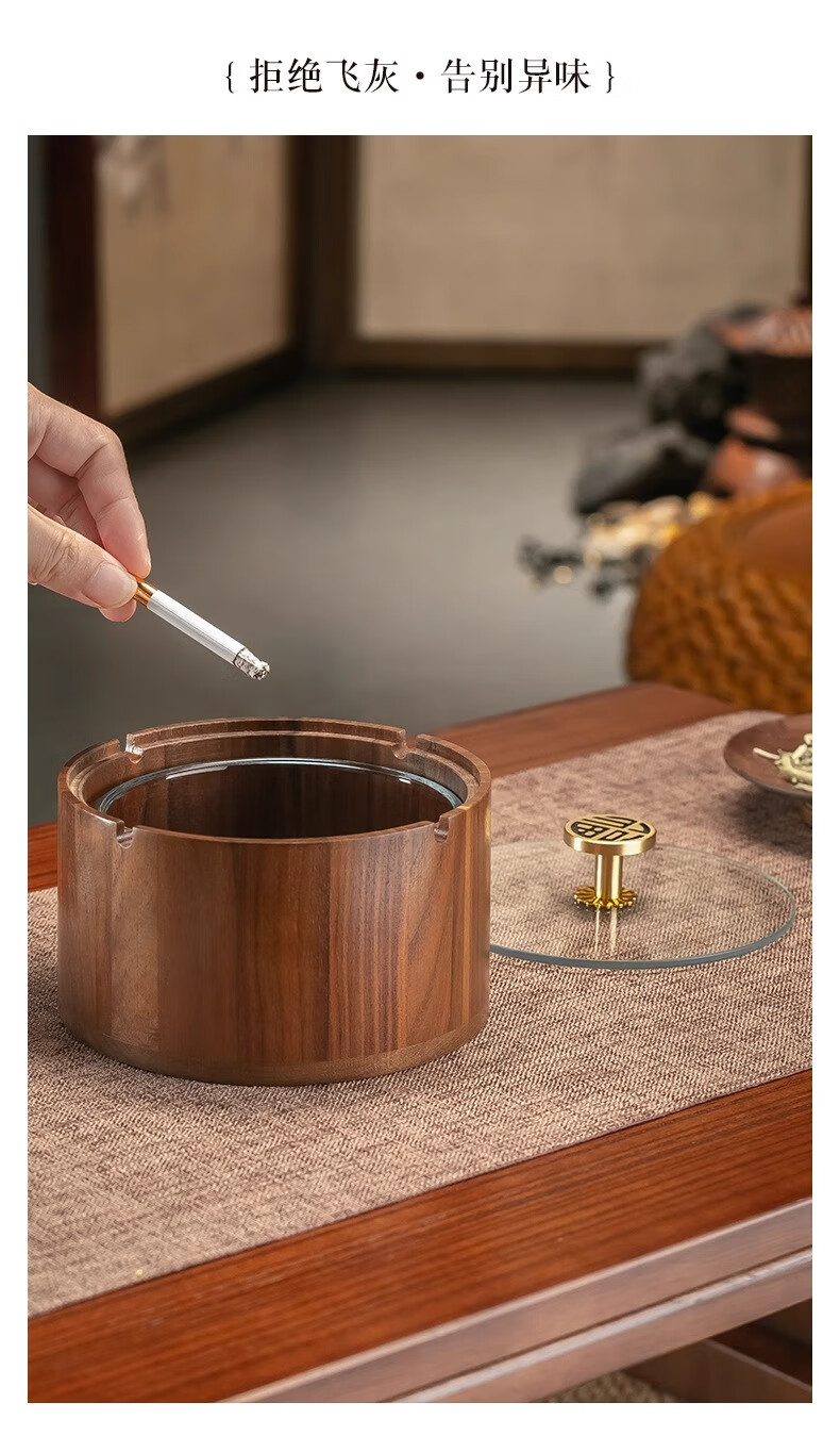 Genasi solid wood ashtray high-end anti-fly ash commercial office home living room hotel Chinese style ashtray with cover high-end round Jinfu brass handle glass liner