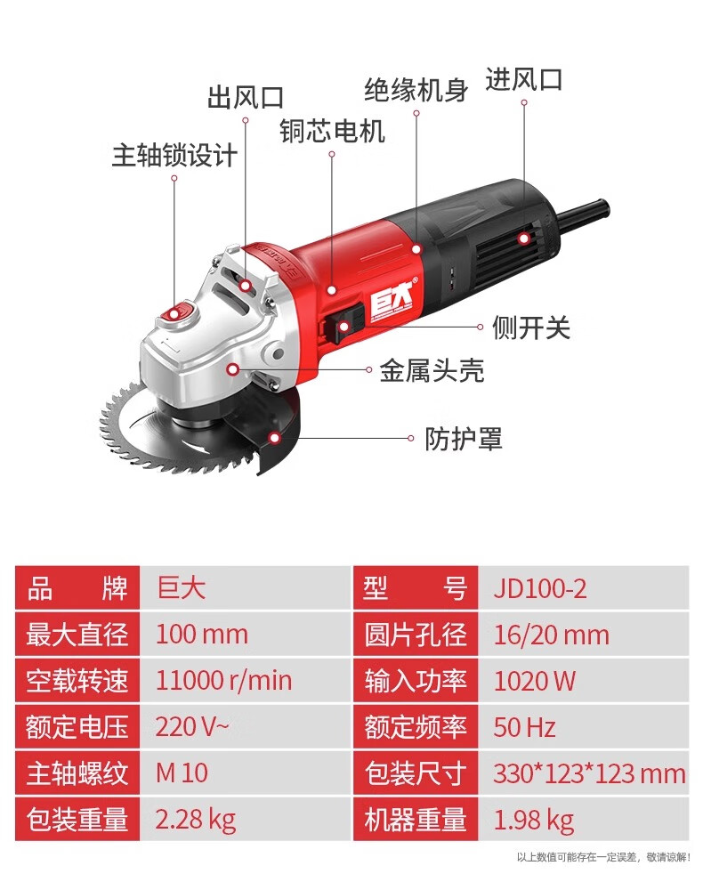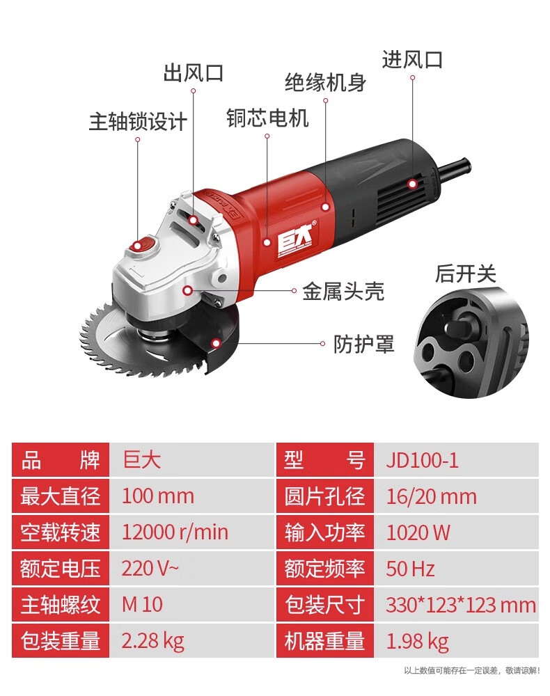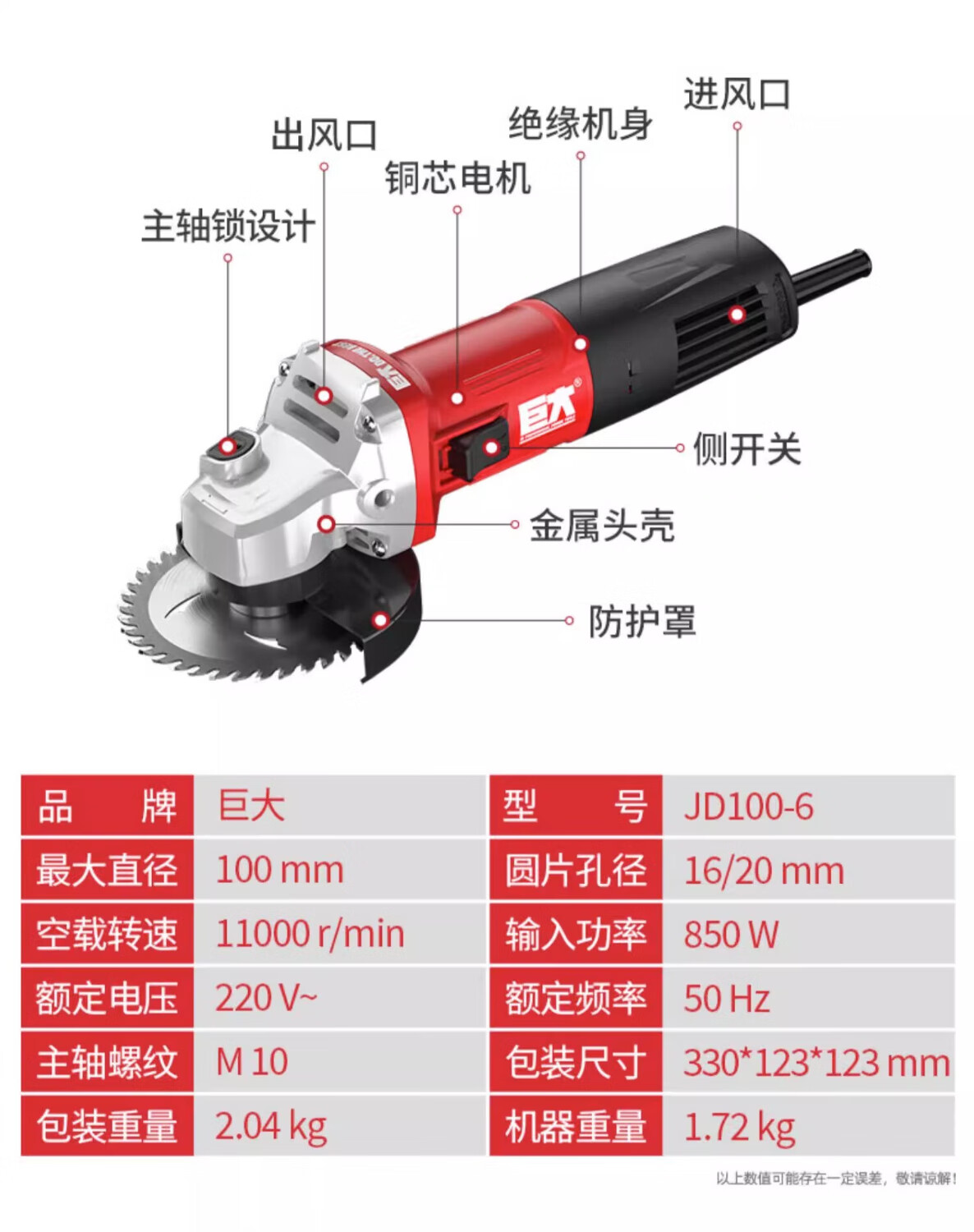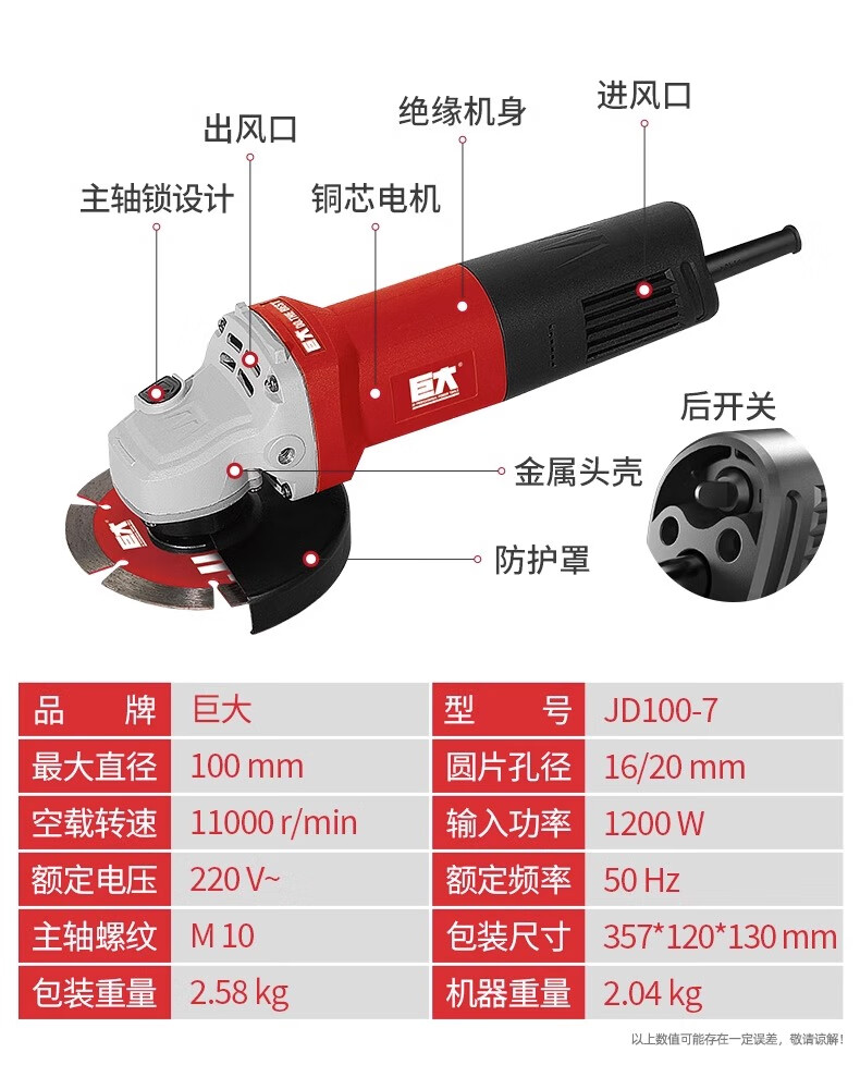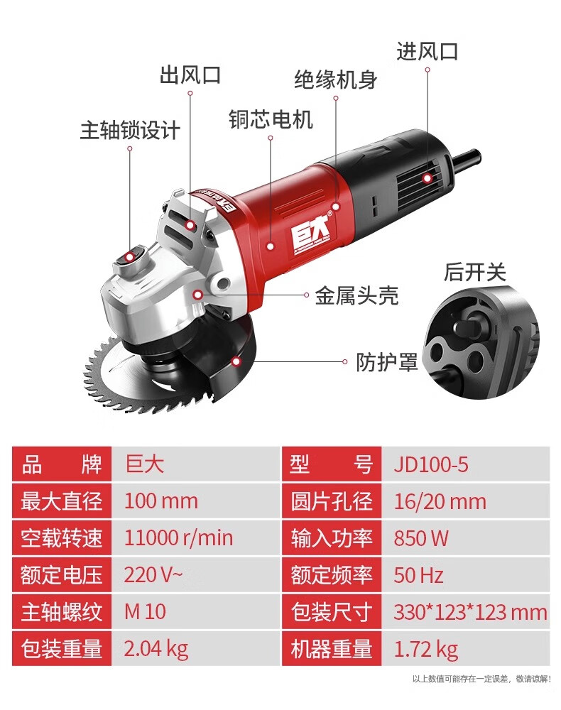 Huge industrial-grade angle grinder, home polishing, hand grinding, multi-function cutting machine, high-power grinder, grinder 1200W, factory standard AG1100-100A rear switch 1100W