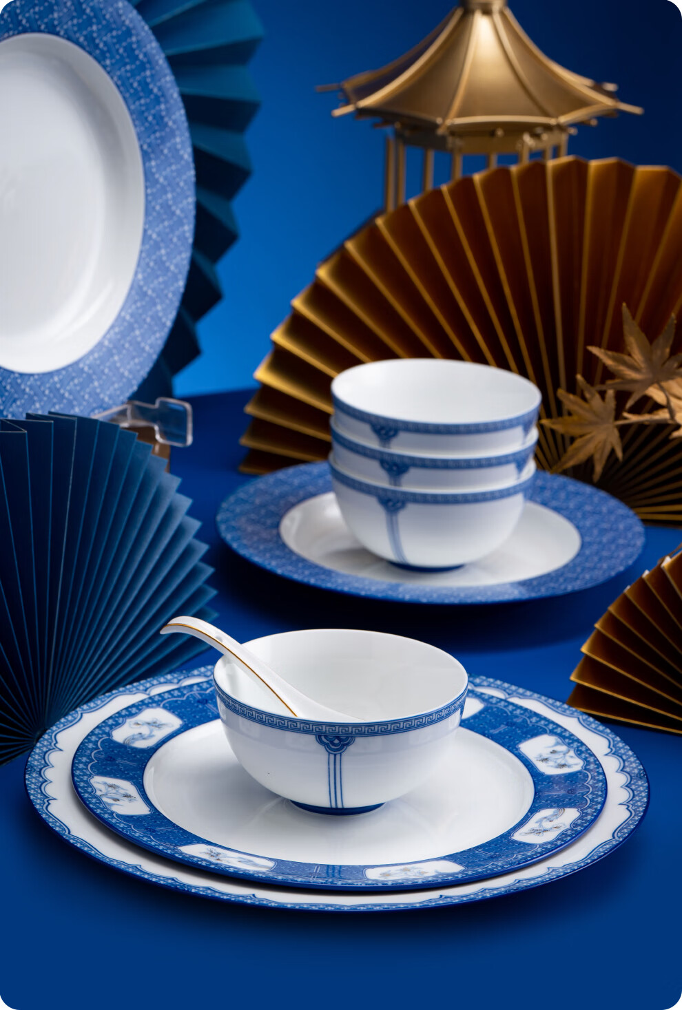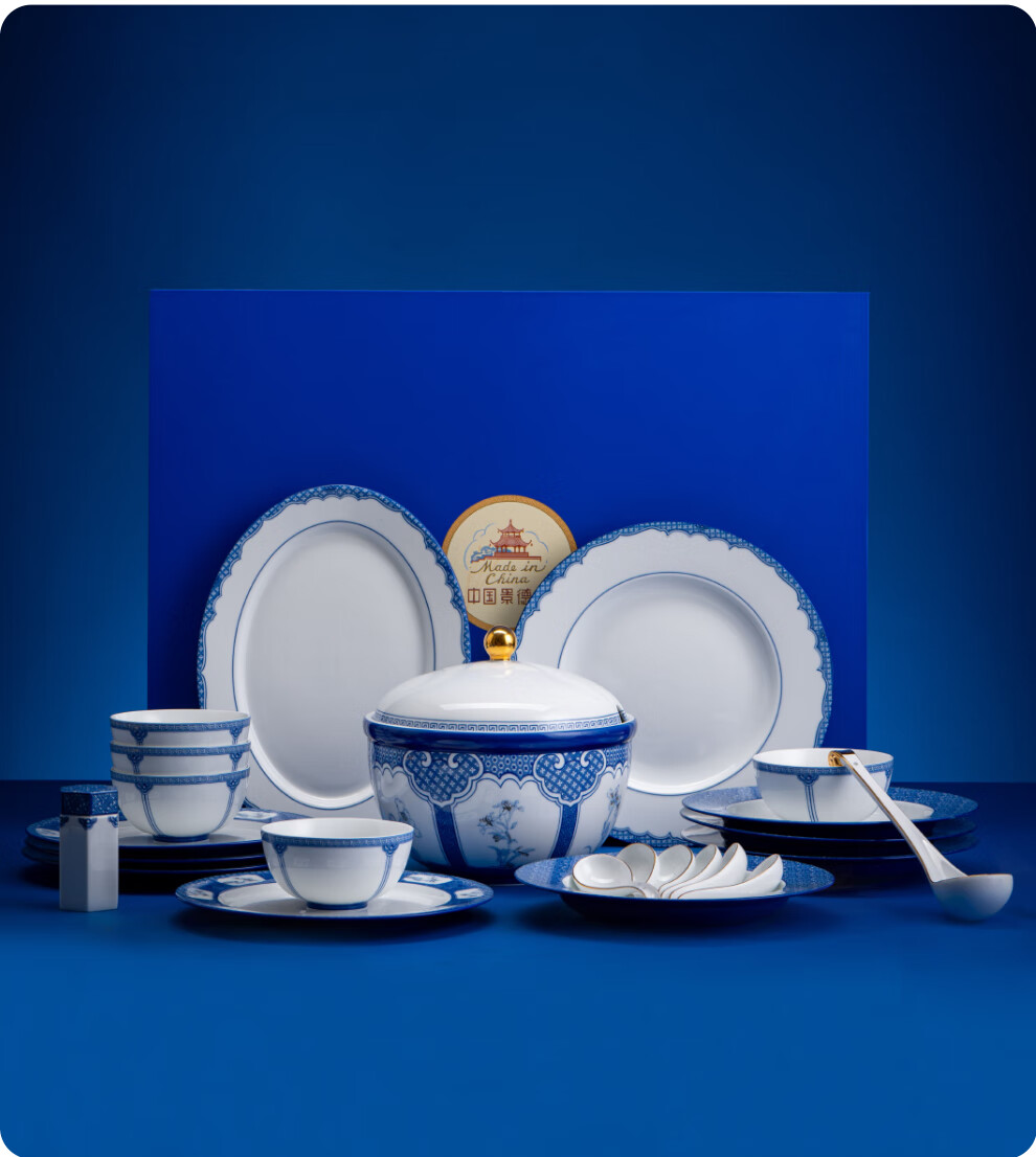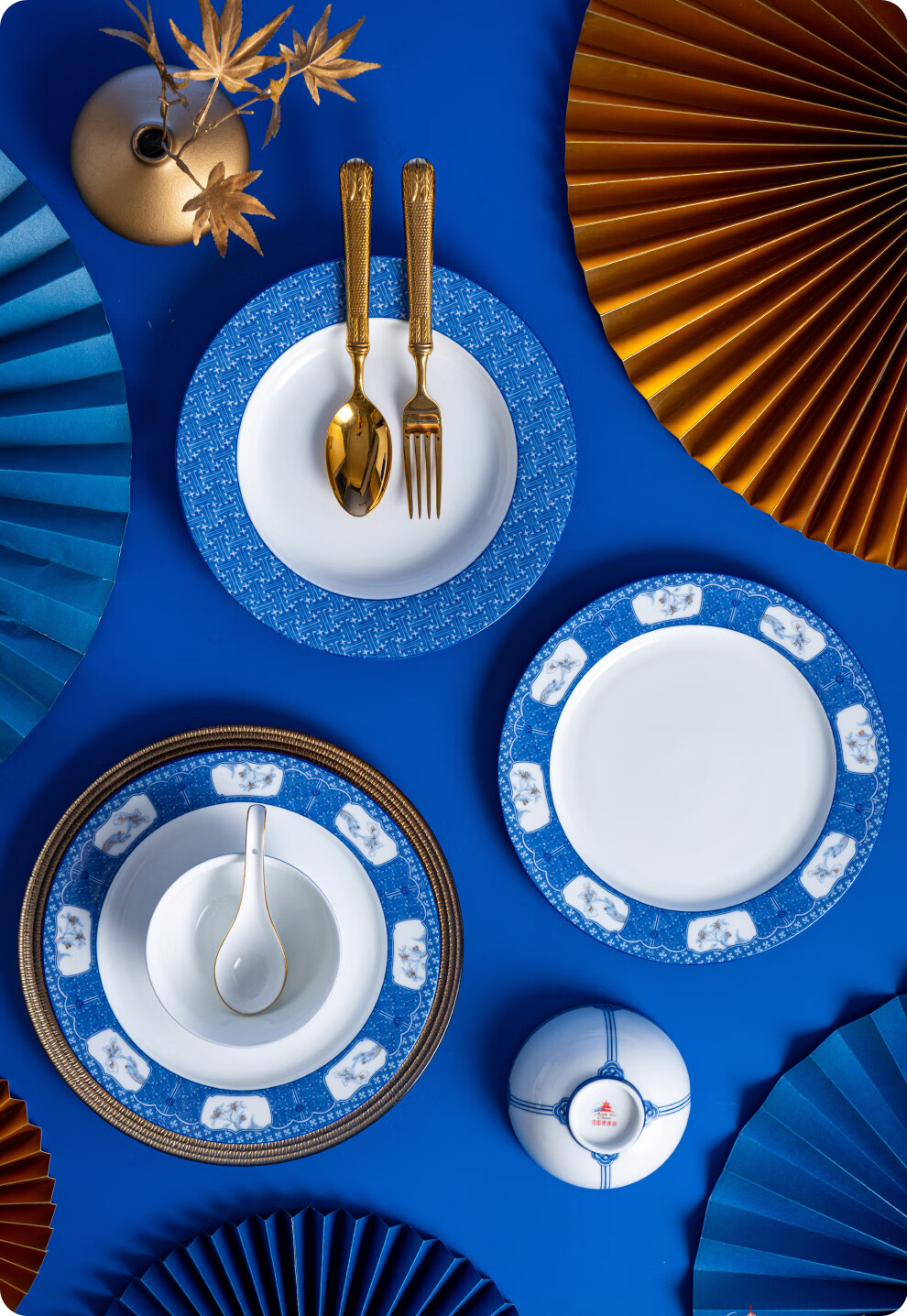 Jingdezhen ceramic glaze medium color blue and white Longzhu Pavilion household Chinese rice bowls and dishes high-end tableware set holiday gift box gift box Splendid blue and white medium tableware 25 pieces