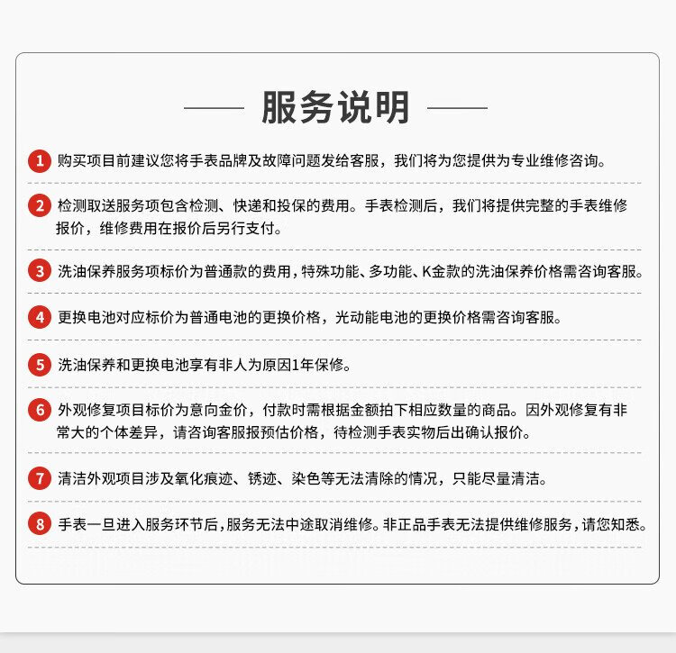 Watch repair and maintenance service, repair and repair by mail, special shot link, special for complex models, please contact customer service for details, 1 yuan special shot