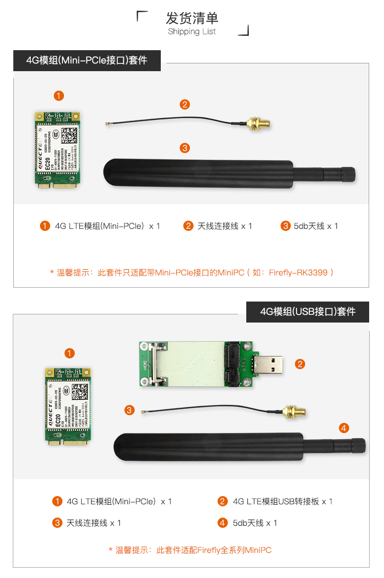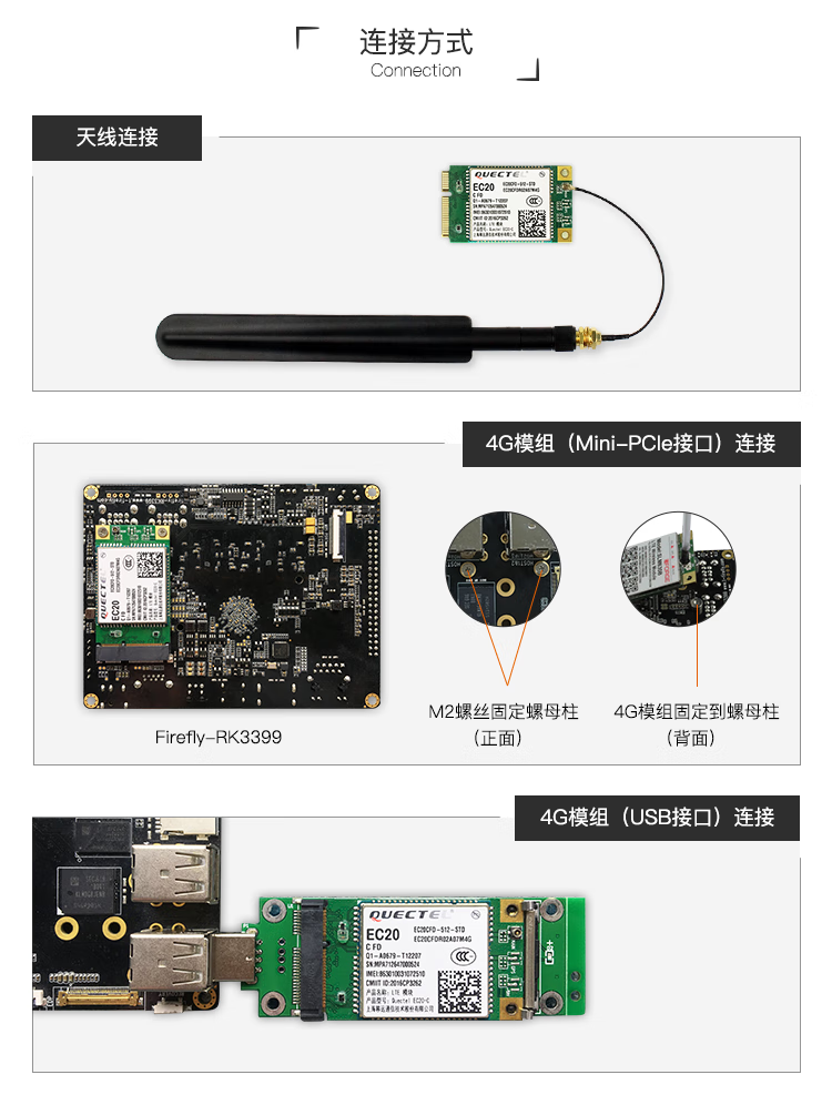 EC20 4G LTE module is compatible with RK3399/RK3288/RK3128 and other motherboards as standard (miniPCIe interface)