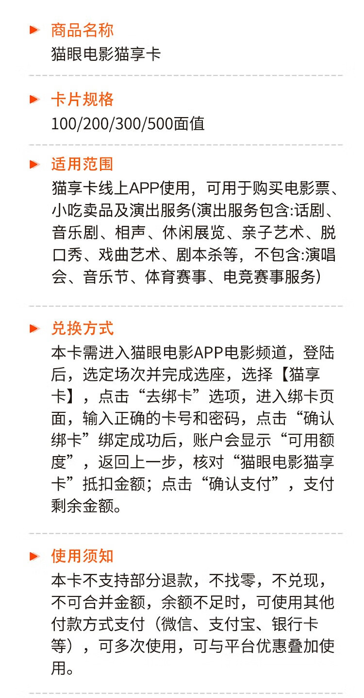 Beware of bill fraud. Maoyan Movie Maoxiang Card has a face value of 100-500. Card secrets. Returns and exchanges are not supported. Maoxiang Card has a face value of 100.