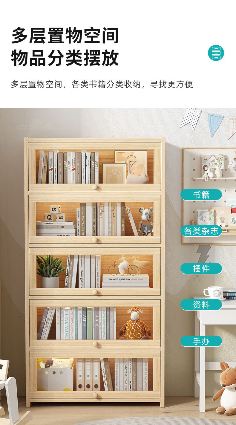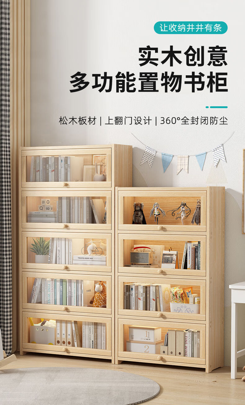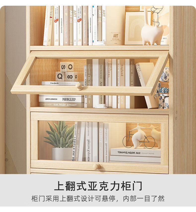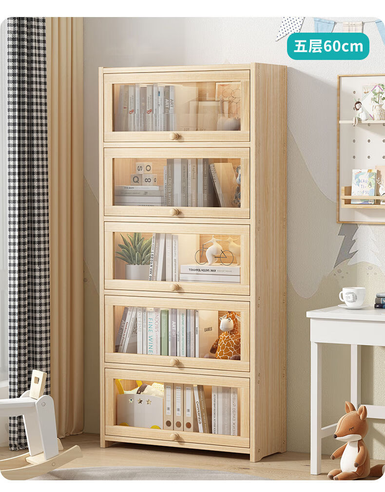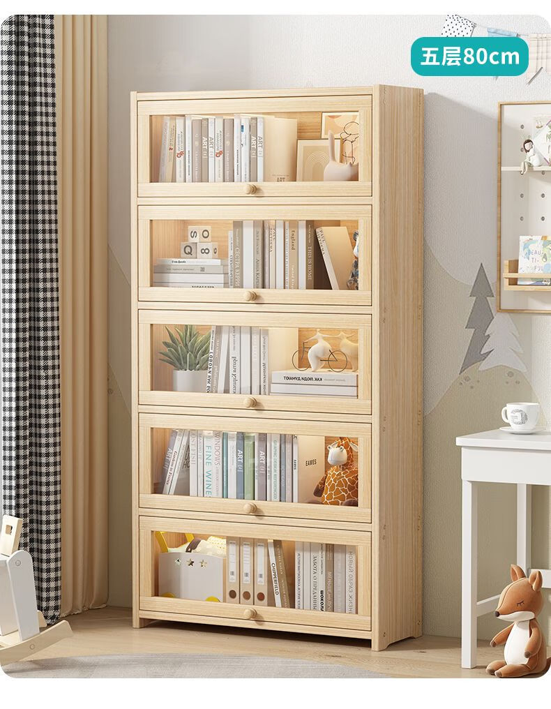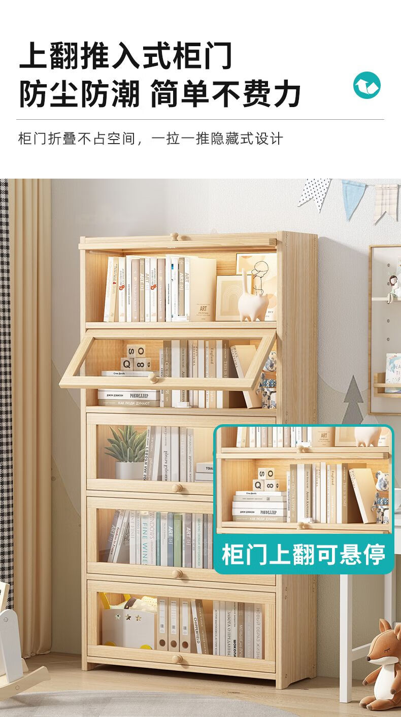 Moridi pine bookcase with flip-up transparent door student book storage cabinet multi-layer floor-to-ceiling solid wood bookshelf toy storage cabinet unpainted pine healthy solid wood bookcase five-layer 80 long flip door design