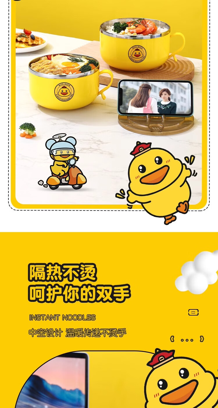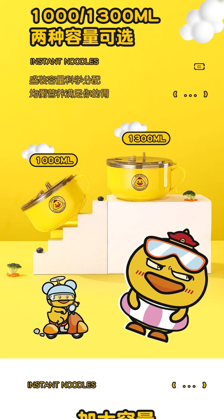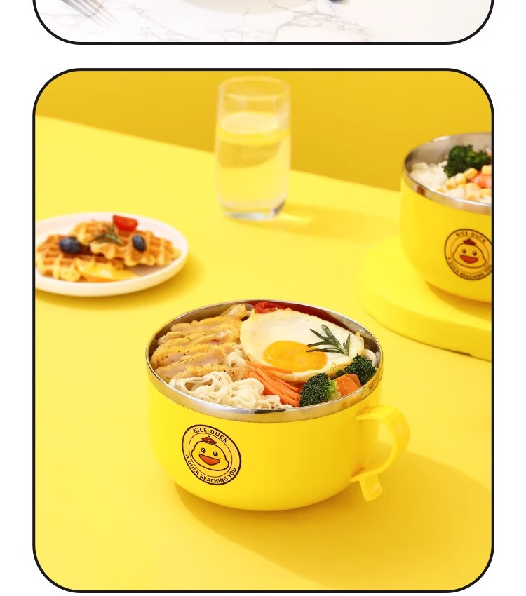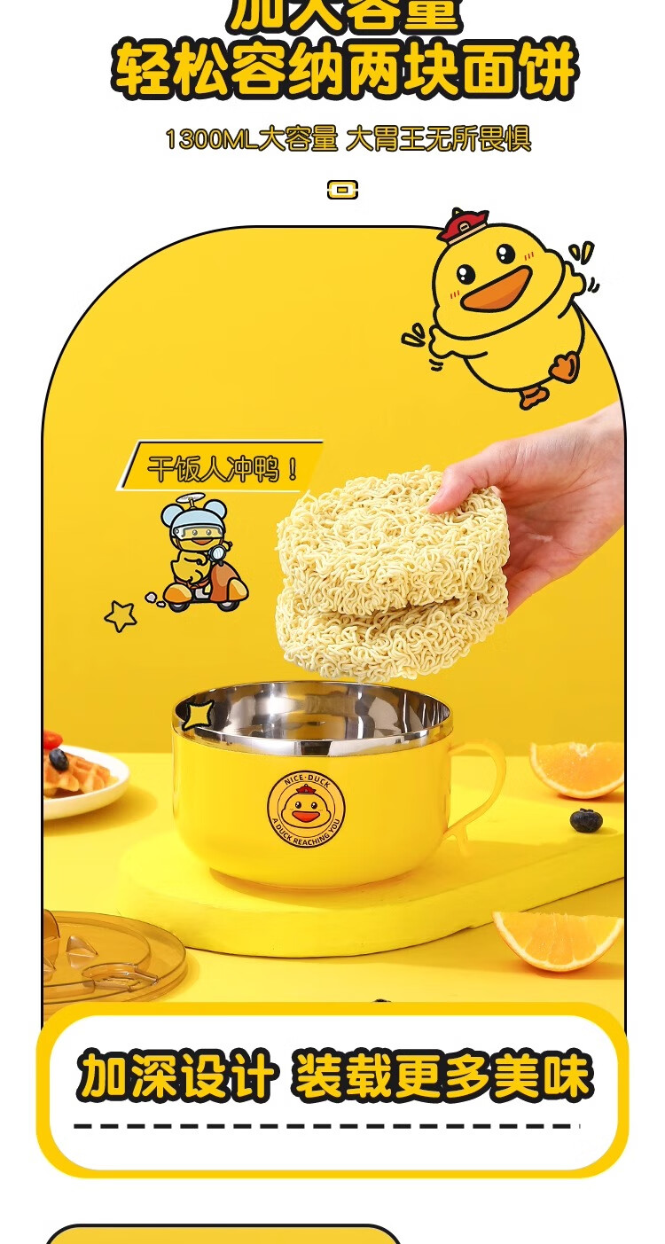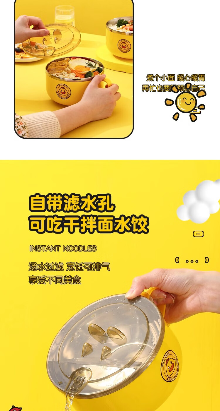 Exquisite and cute yellow duck instant noodle bowl stainless steel lunch box rice bowl filtered water student dormitory instant noodle bowl gift little yellow duck 1000ML (small noodle cake)