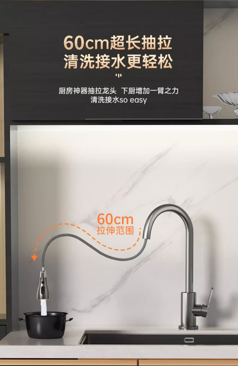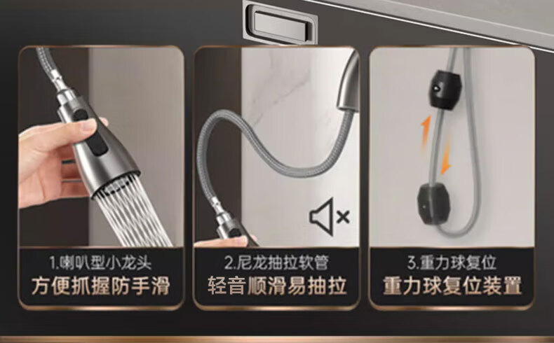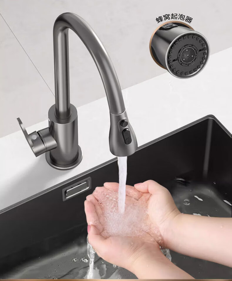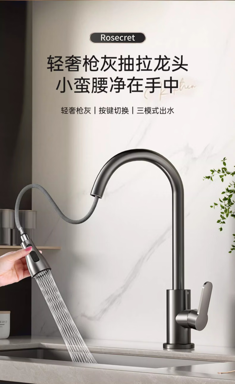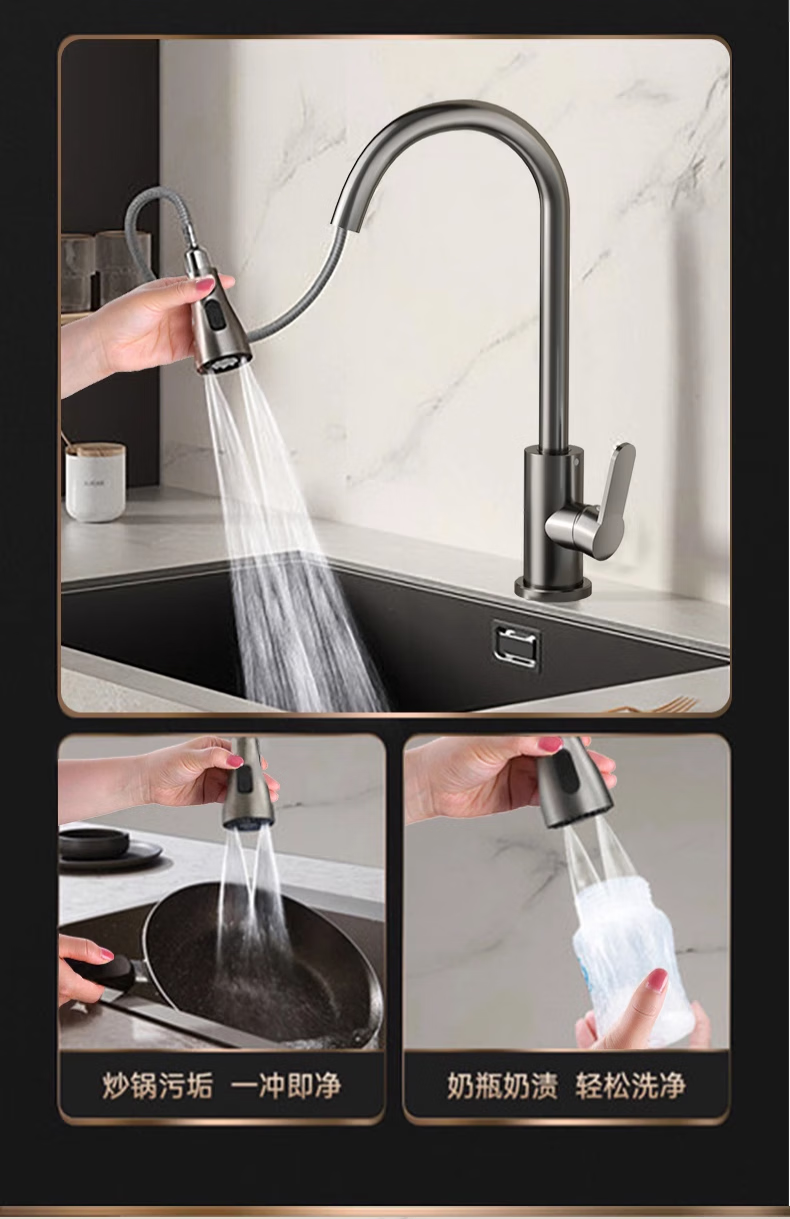 Rosecret Germany kitchen faucet pull-out all-copper main body sink sink dishwashing pool hot and cold faucet three-speed balcony laundry pool faucet gun gray universal kitchen sink dual temperature pressurized anti-splash water丨80CM water inlet pipe*2