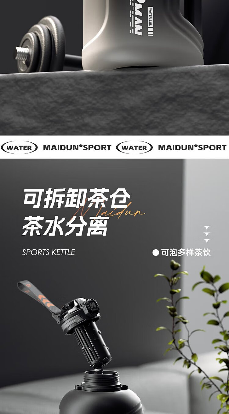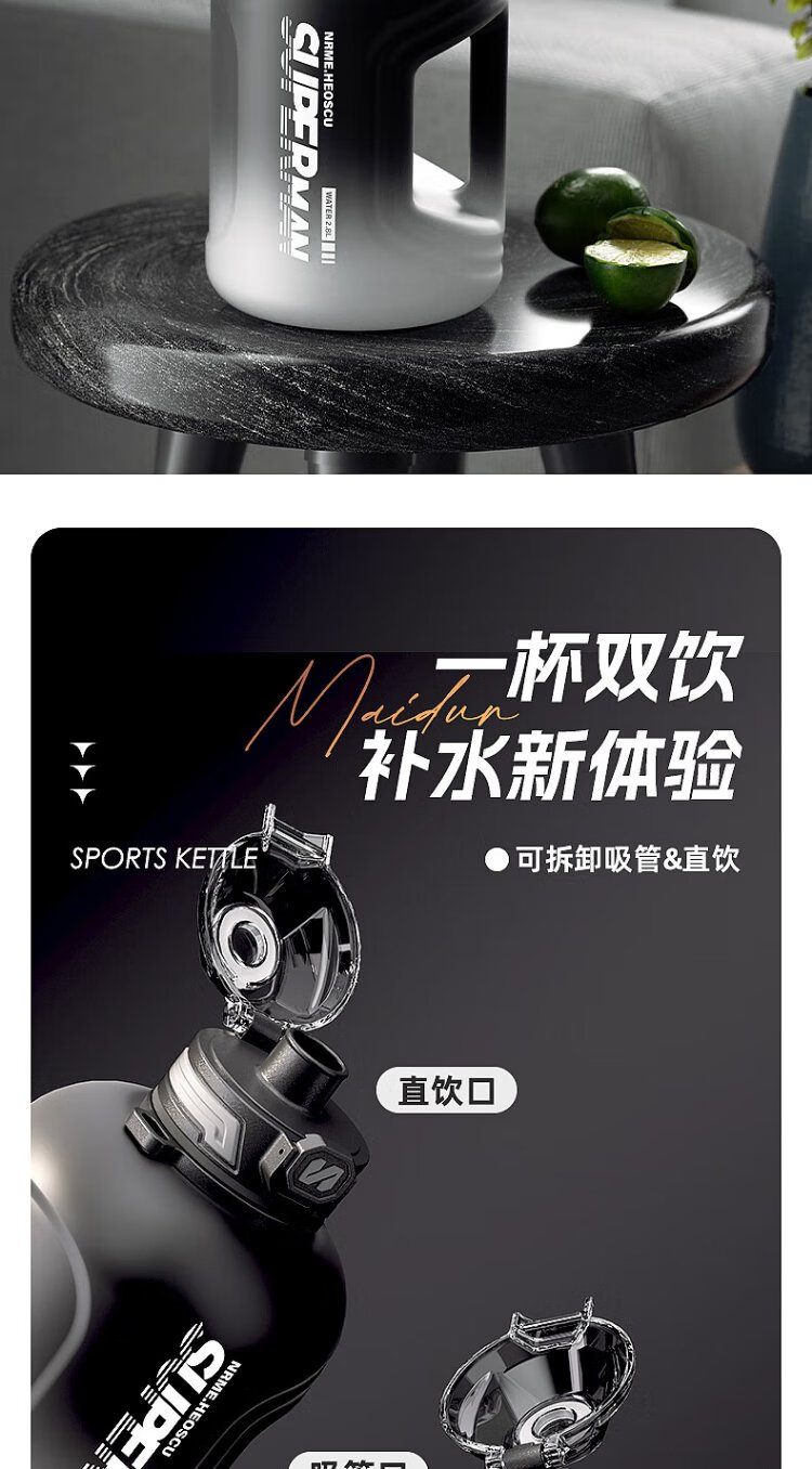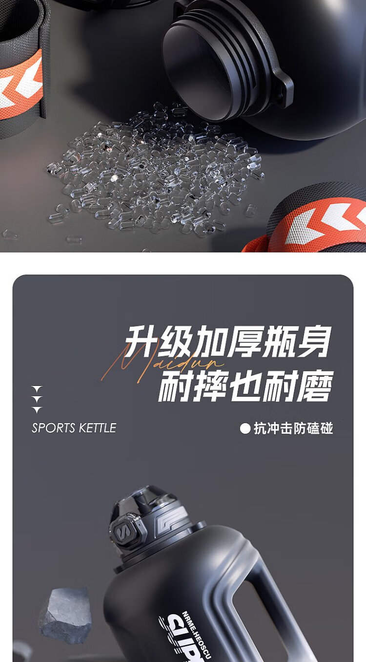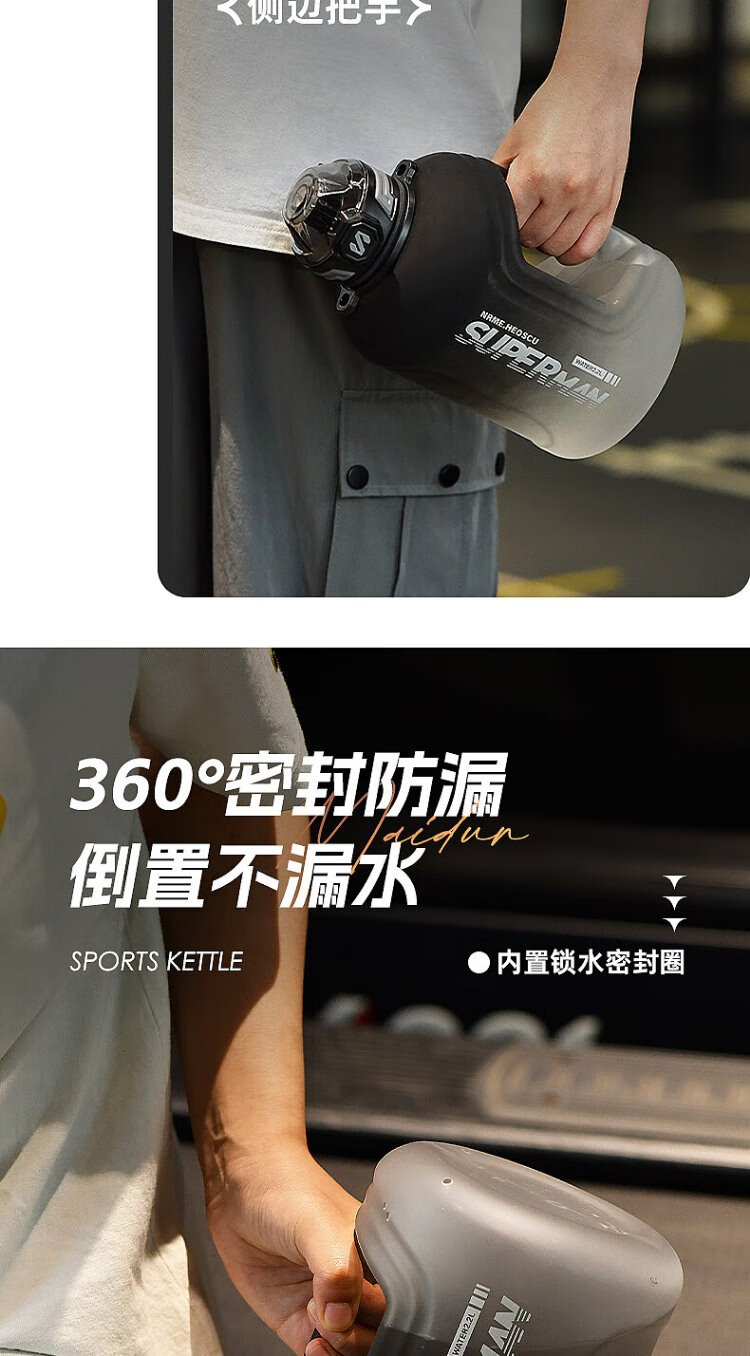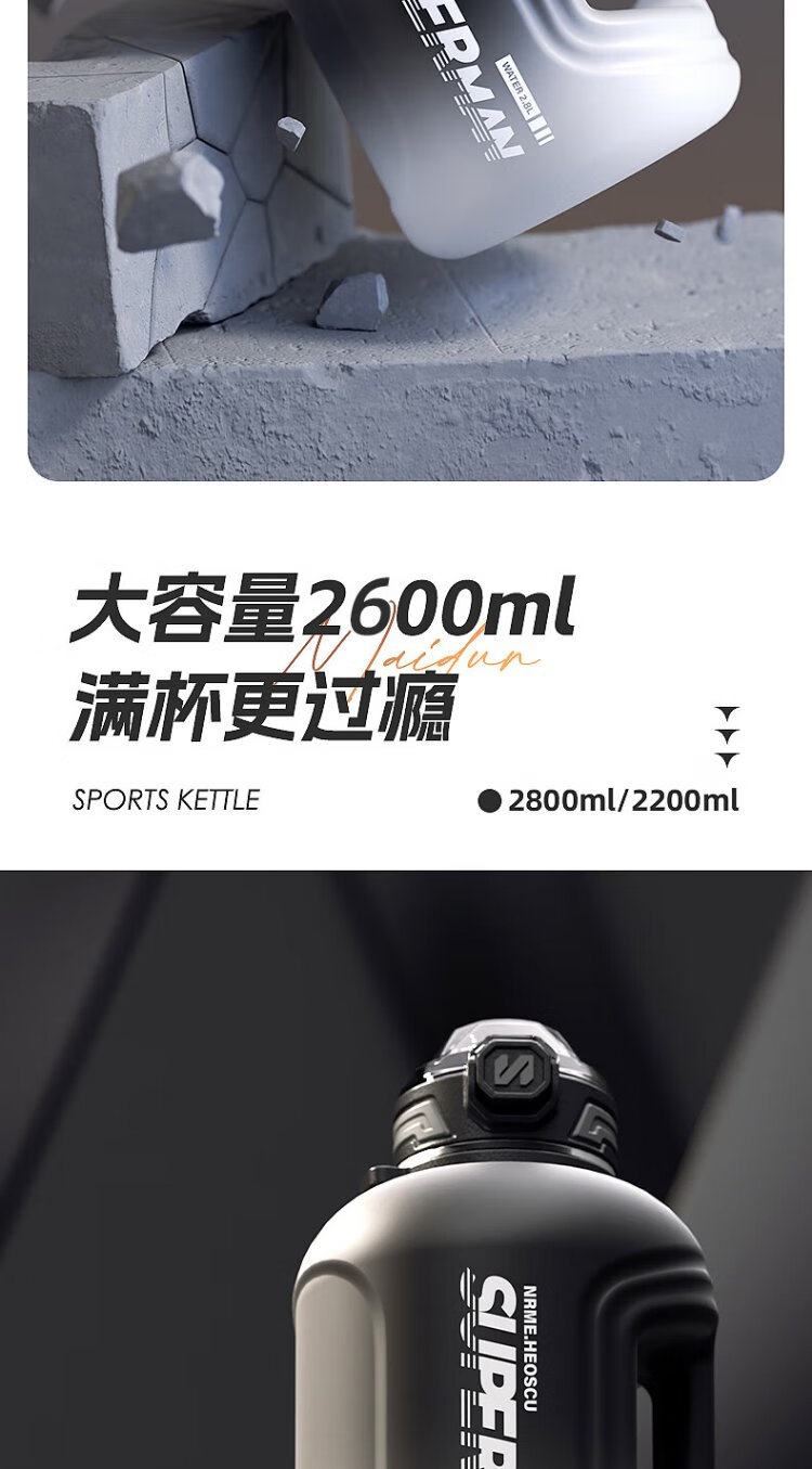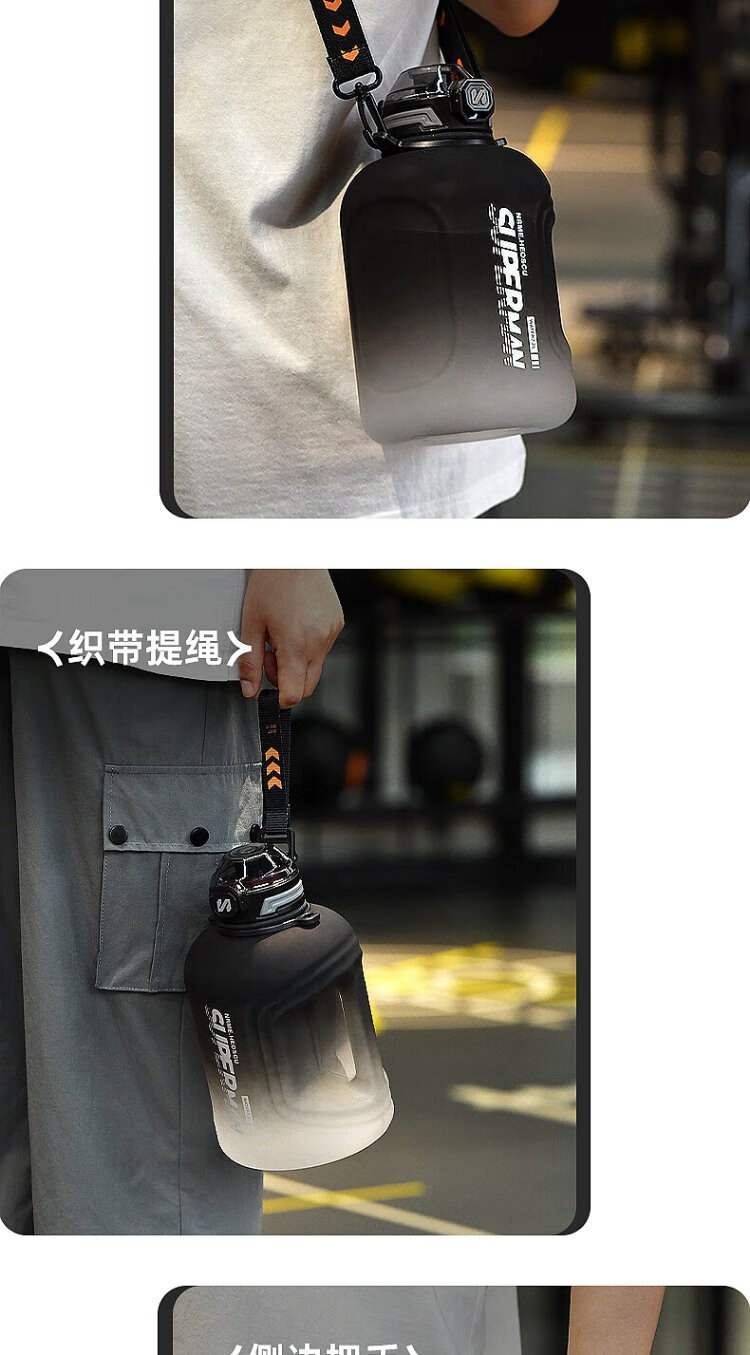 NRMEi Ton Cup Ton Bucket Sports Water Cup Extra Large Capacity Men's Fitness Tritan Tea Water Separation High Temperature Resistant Kettle Cup New Rope Strap/Double Drink-Grey 2200ml