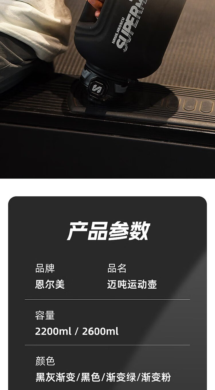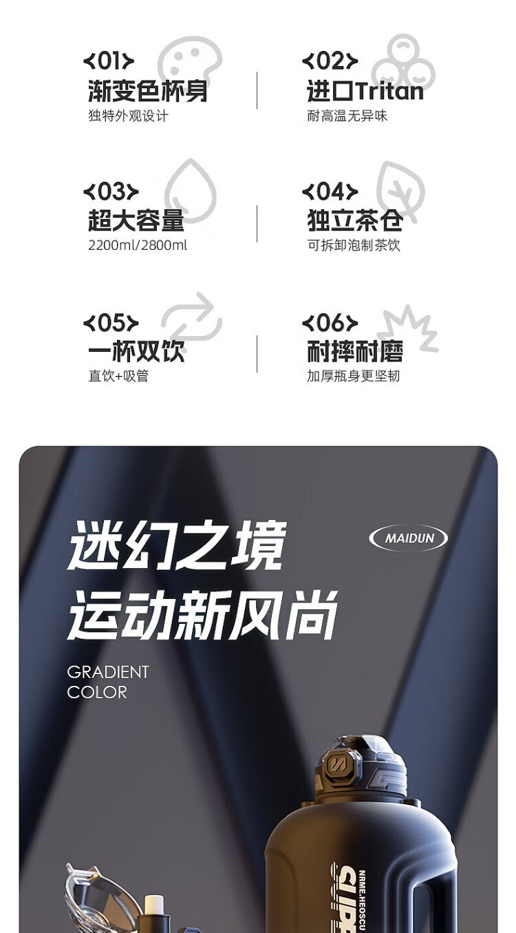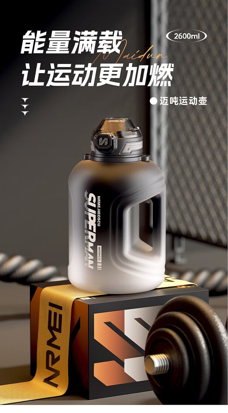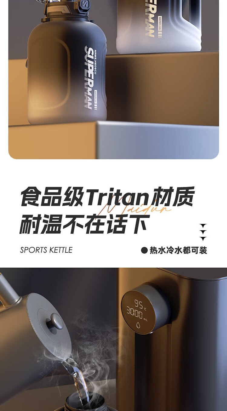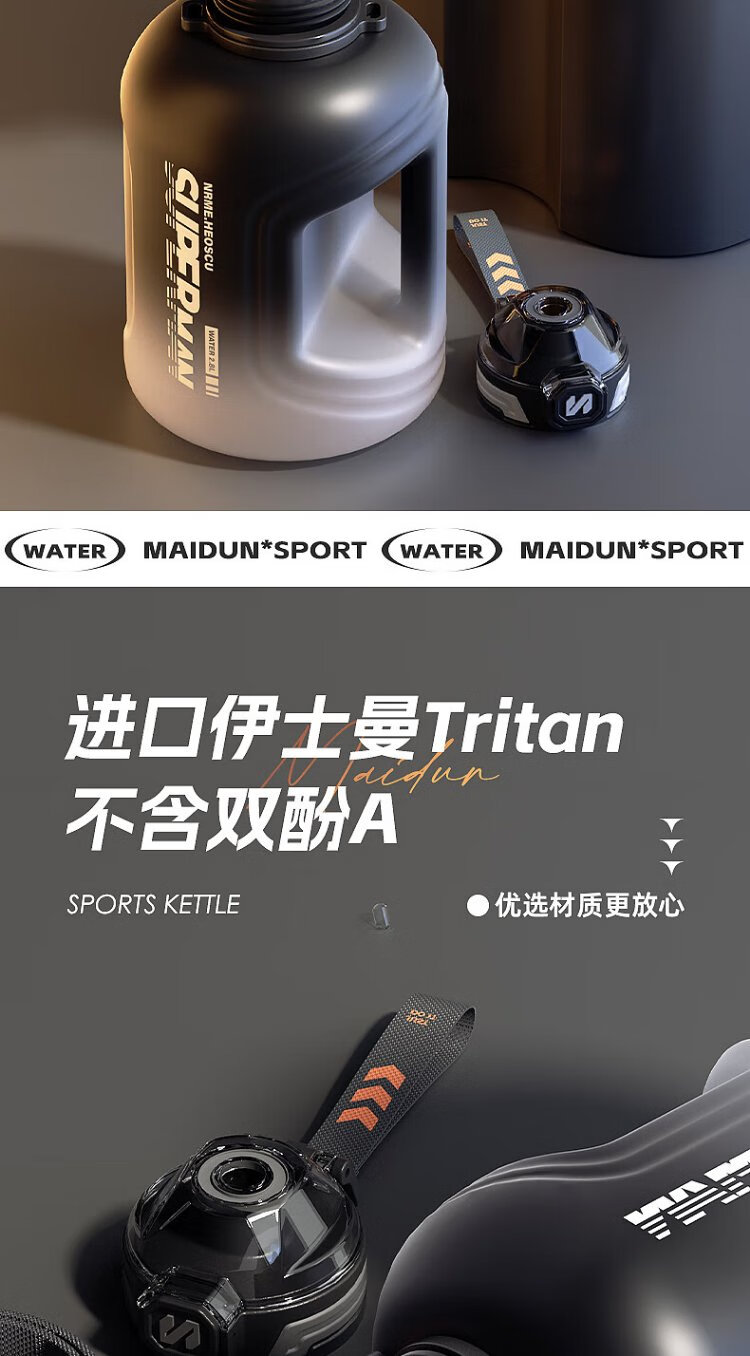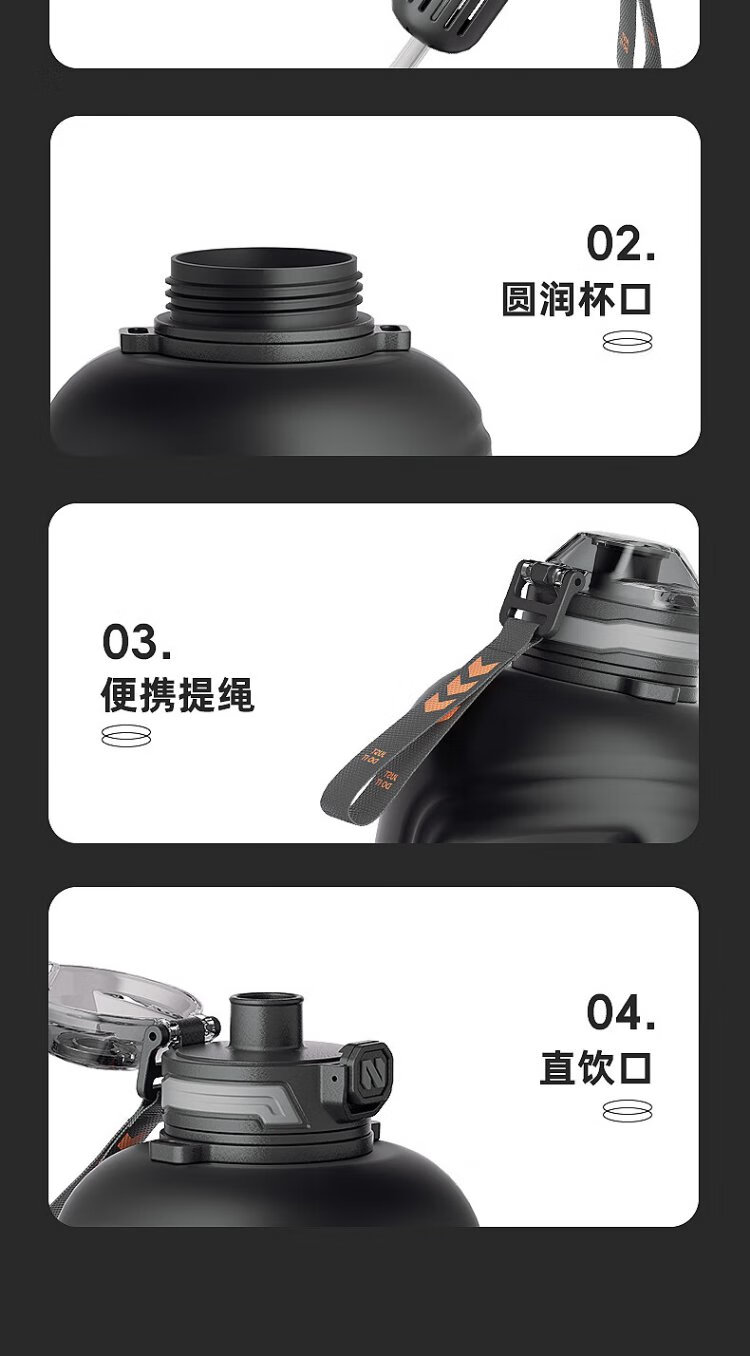 NRMEi Ton Cup Ton Bucket Sports Water Cup Extra Large Capacity Men's Fitness Tritan Tea Water Separation High Temperature Resistant Kettle Cup New Rope Strap/Double Drink-Grey 2200ml