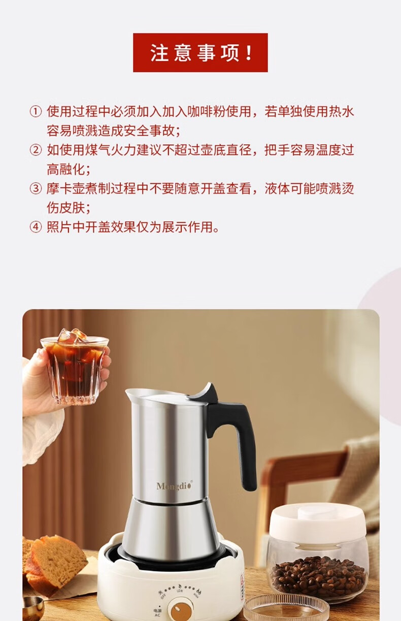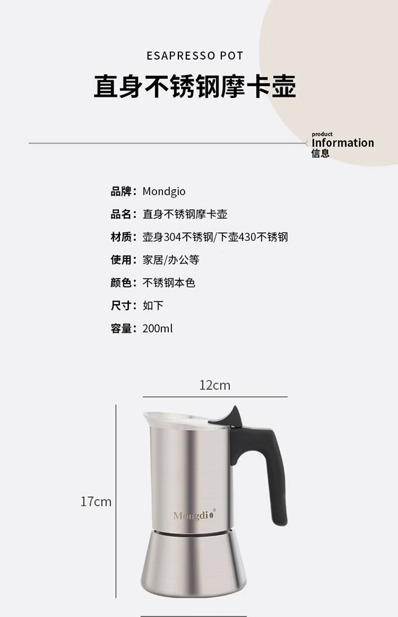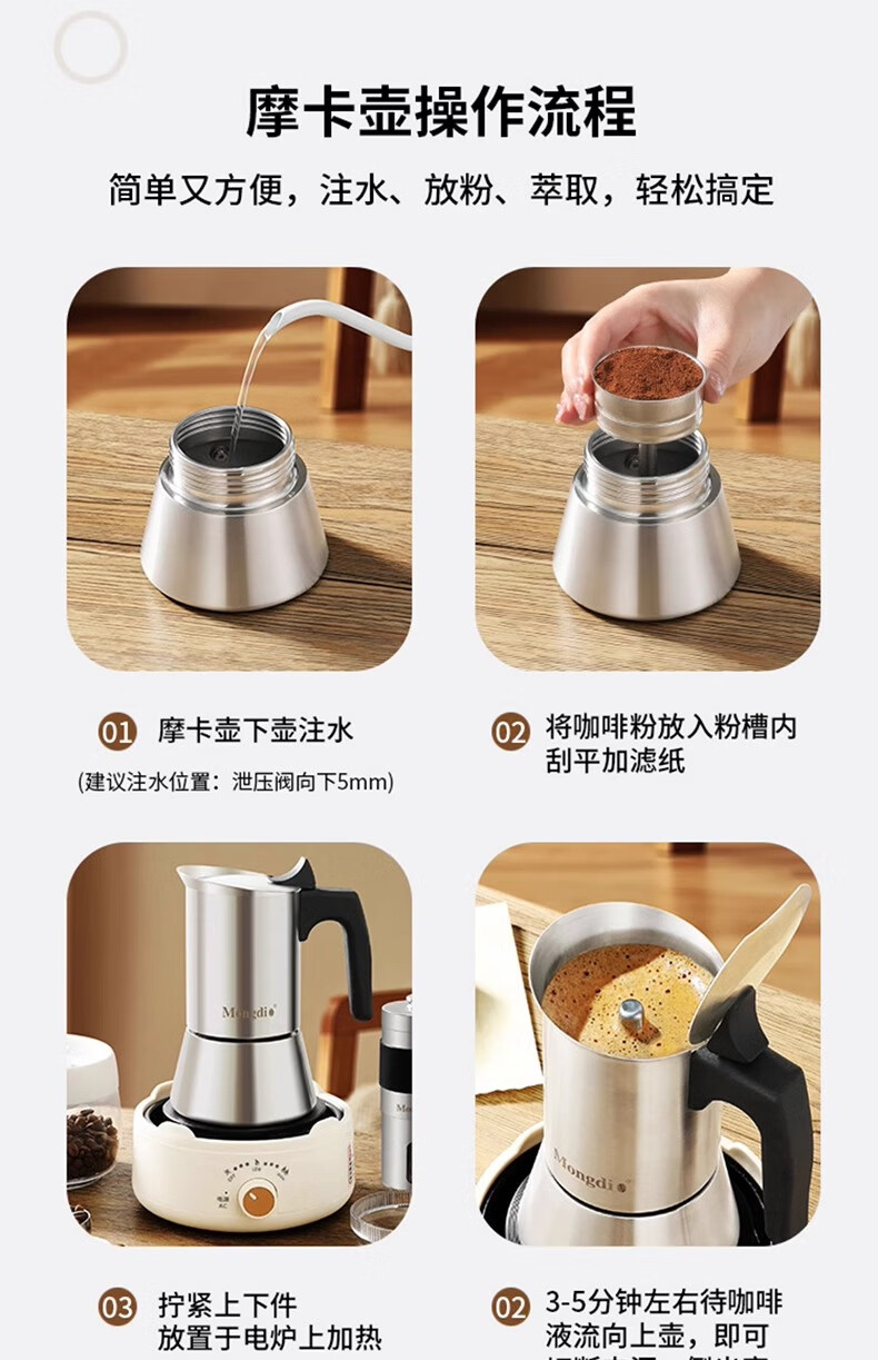 MONDINO stainless steel Moka pot espresso machine household small coffee brewing espresso extraction pot hand-brewed coffee set 2-piece set stainless steel Moka pot 100ml