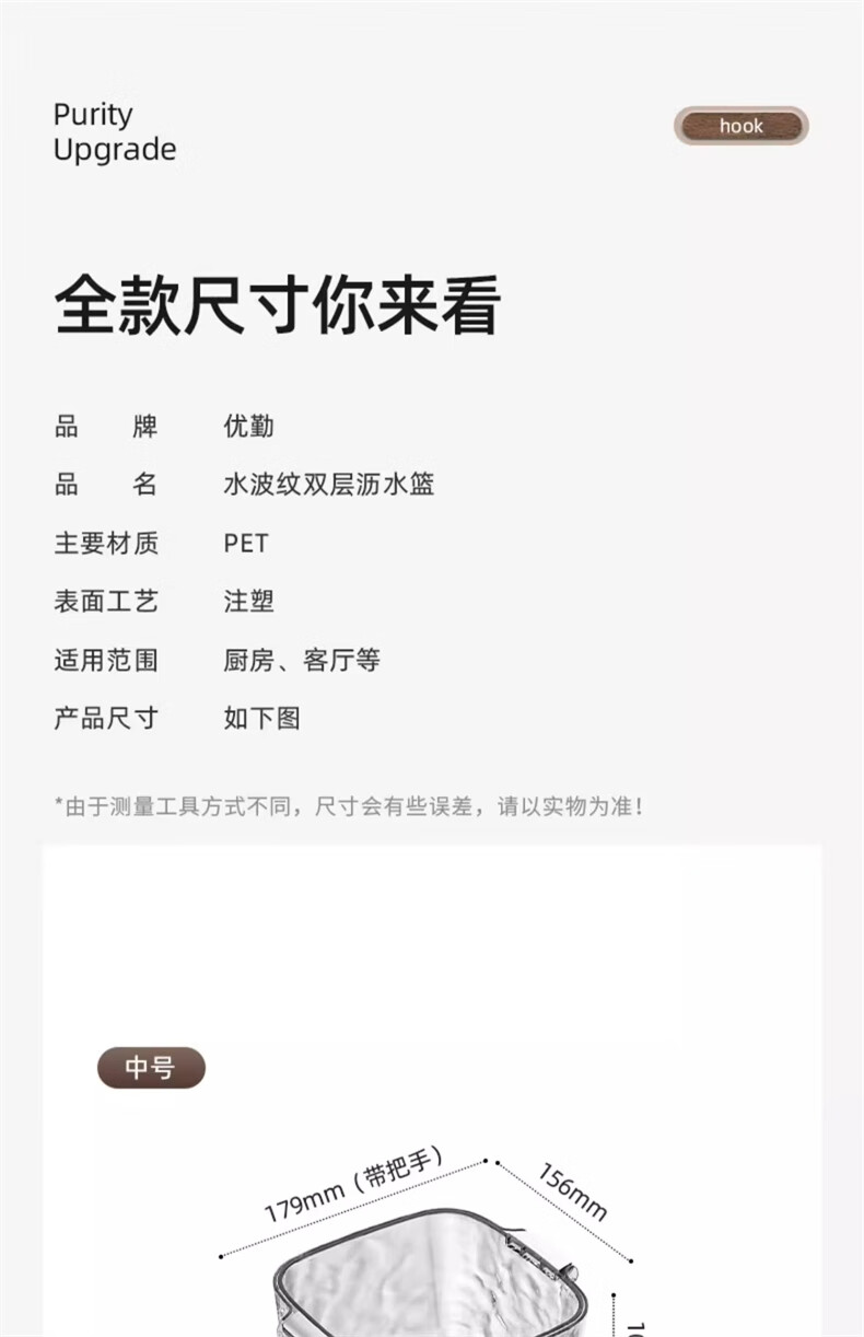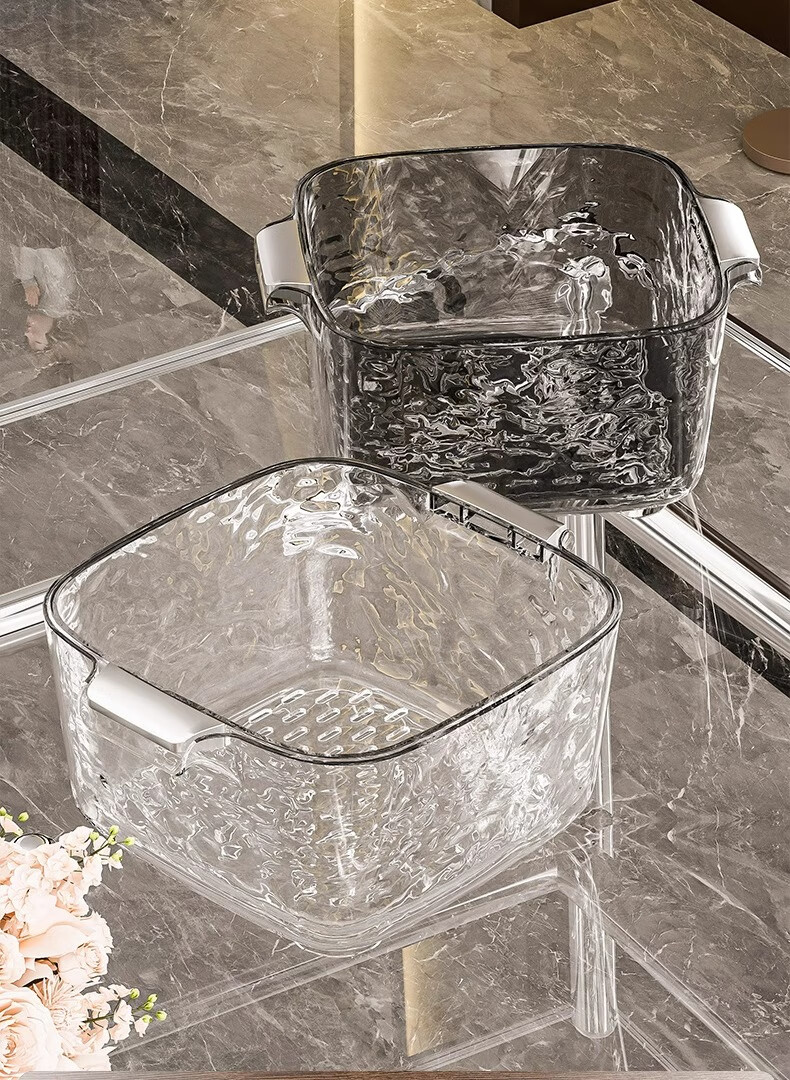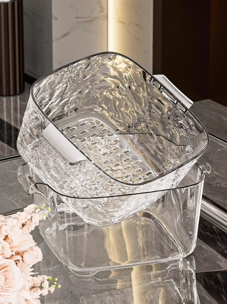 YOUQIN double-layered vegetable sink drain basket, high-looking multi-functional kitchen new fruit plate, light luxury high-end living room vegetable basket, transparent white medium size, water rippled double layer