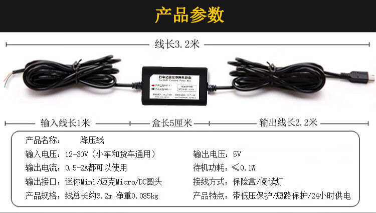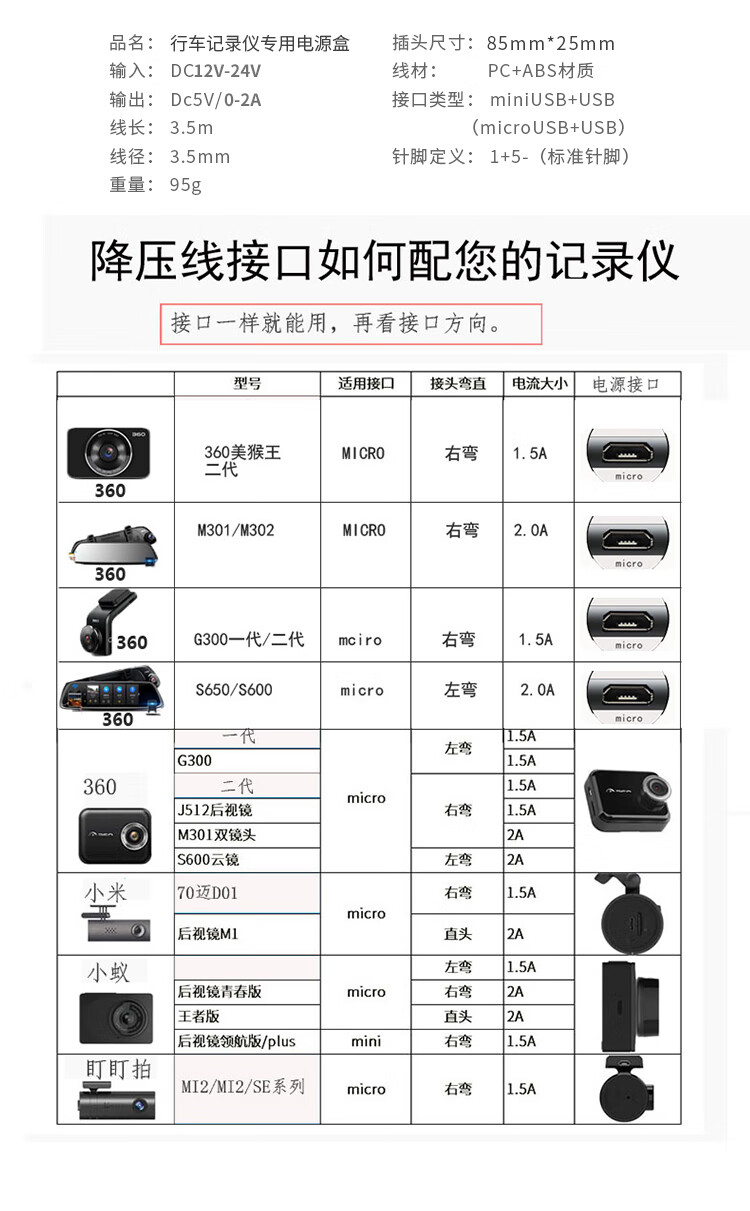 Driving recorder step-down cable, universal stare-and-pai 360 Lingdu Jidu special power cable, hidden line car charger, step-down cable, MINI left bend