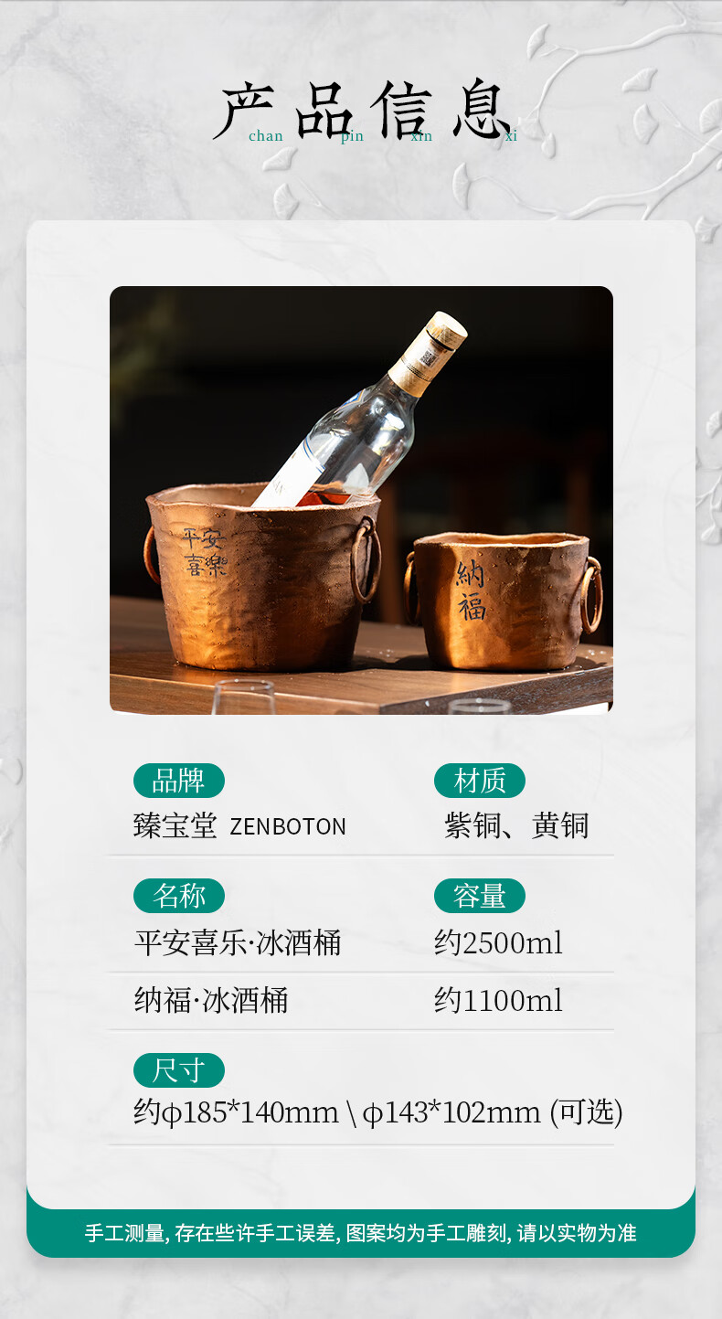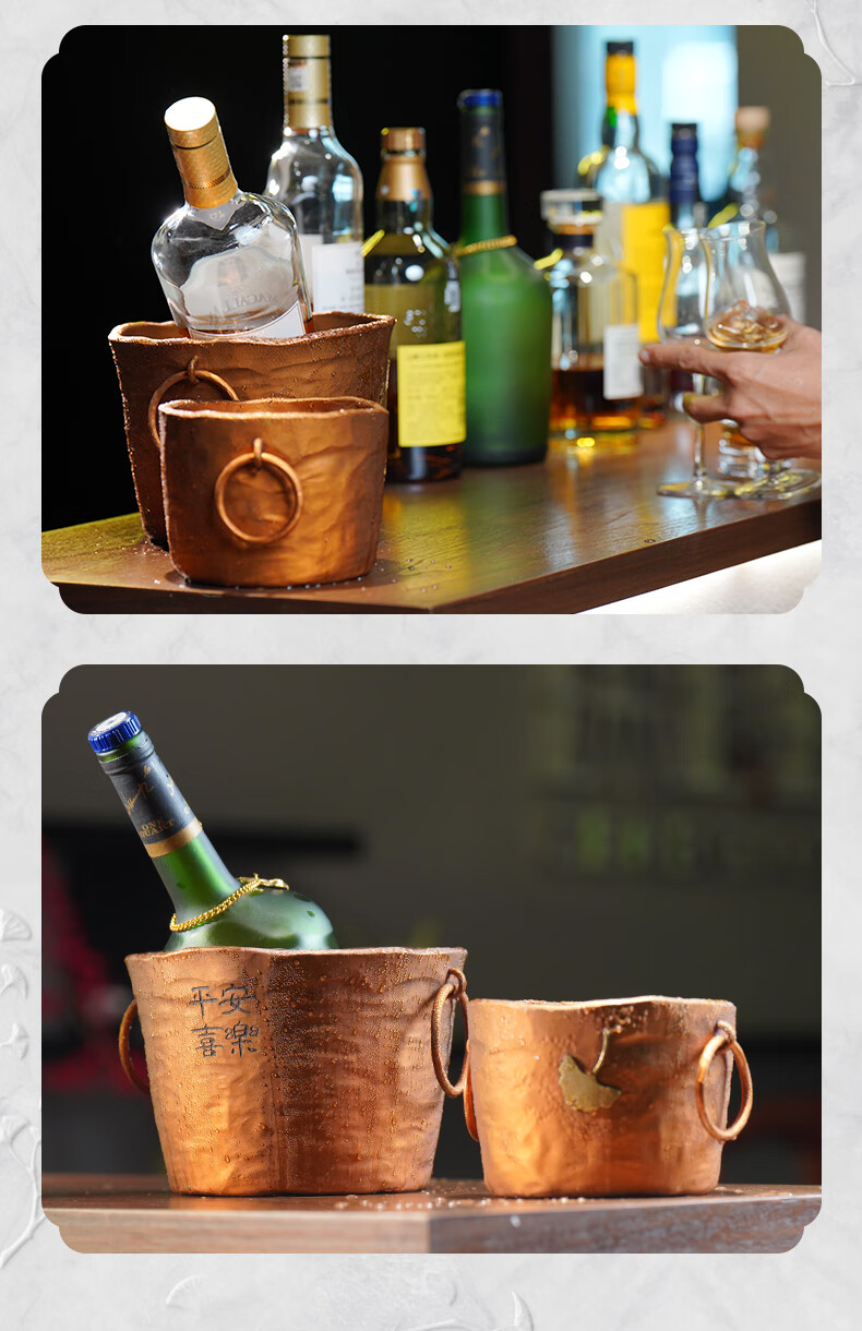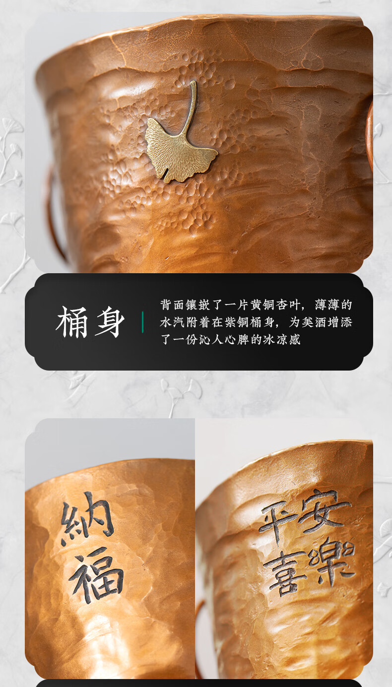 Zhenbaotang all-copper wine barrel creative wineware handmade inlaid with ginkgo leaf hammer pattern ice bucket household champagne beer ice bucket decoration Ping'an Xile wine barrel (capacity about 2500ml)