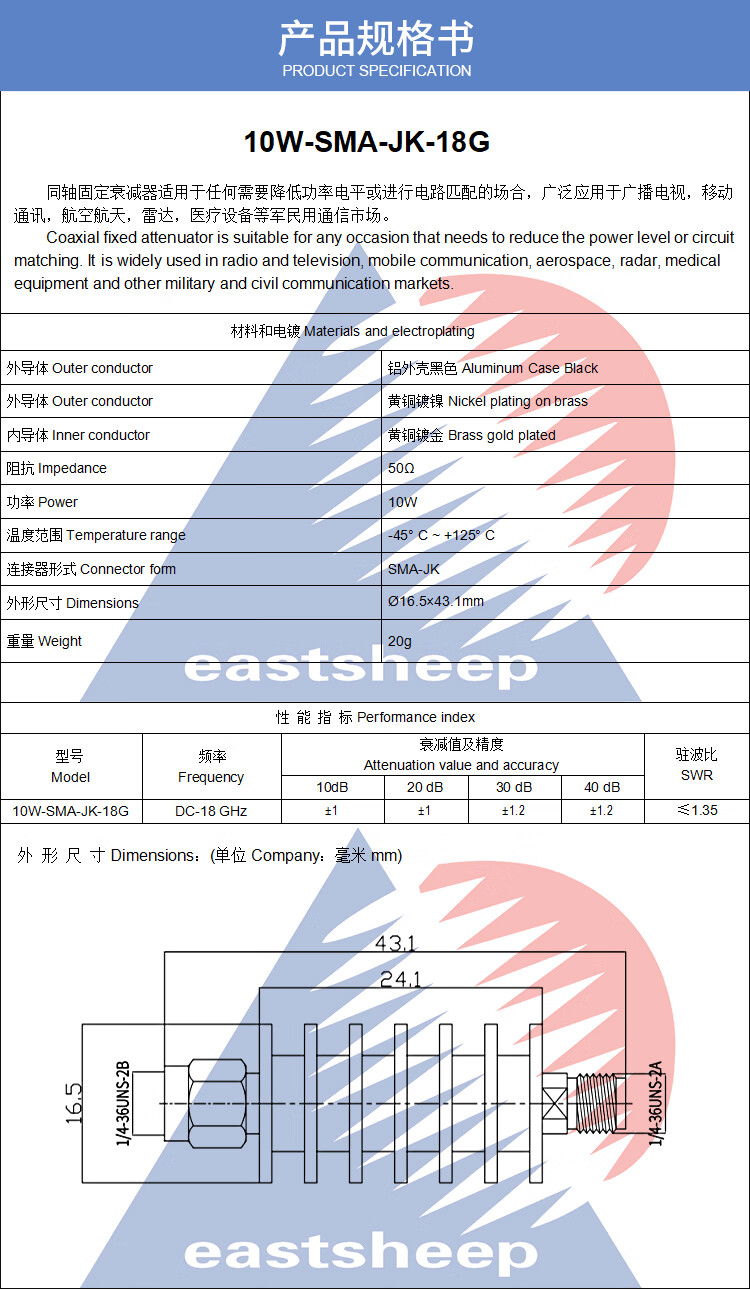 Dongfang Xupu 10W attenuator SMA type attenuator SMA-JK male and female head 10/20/30DB DC-18G 10DB