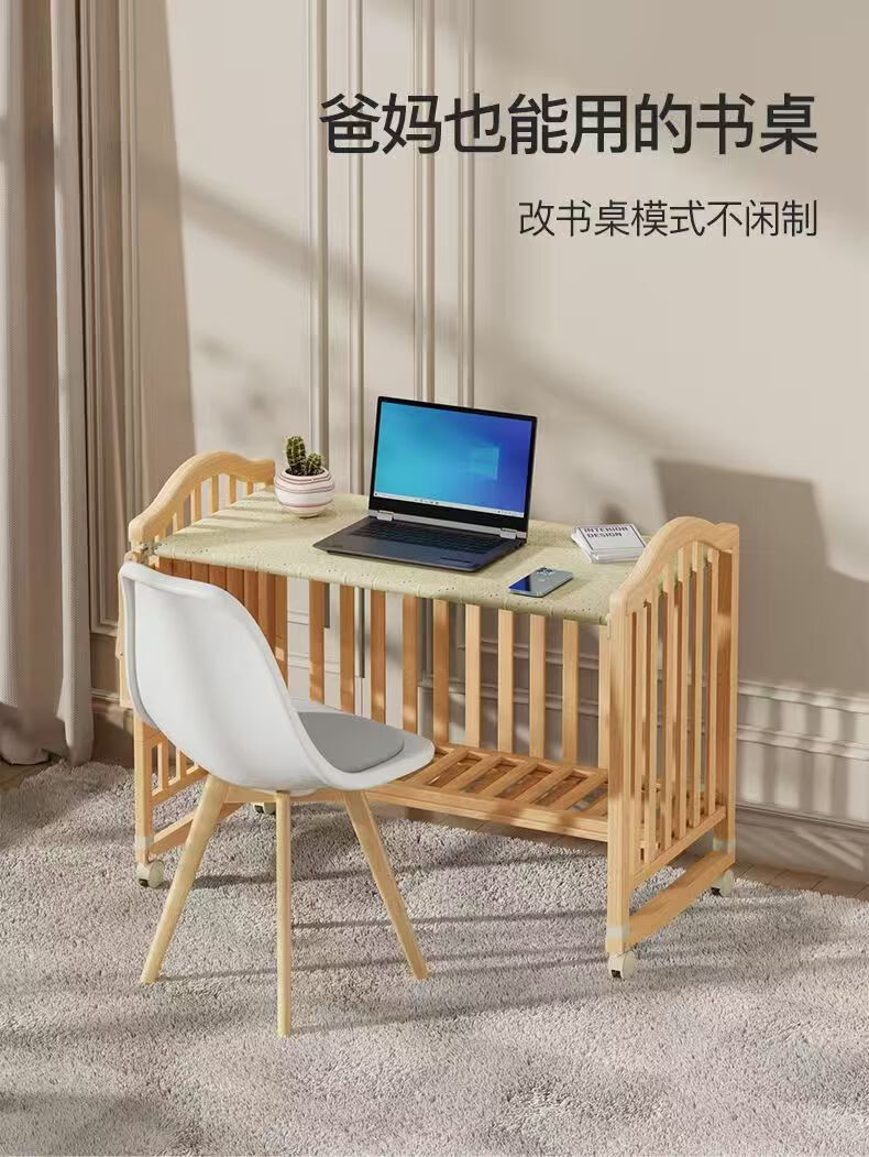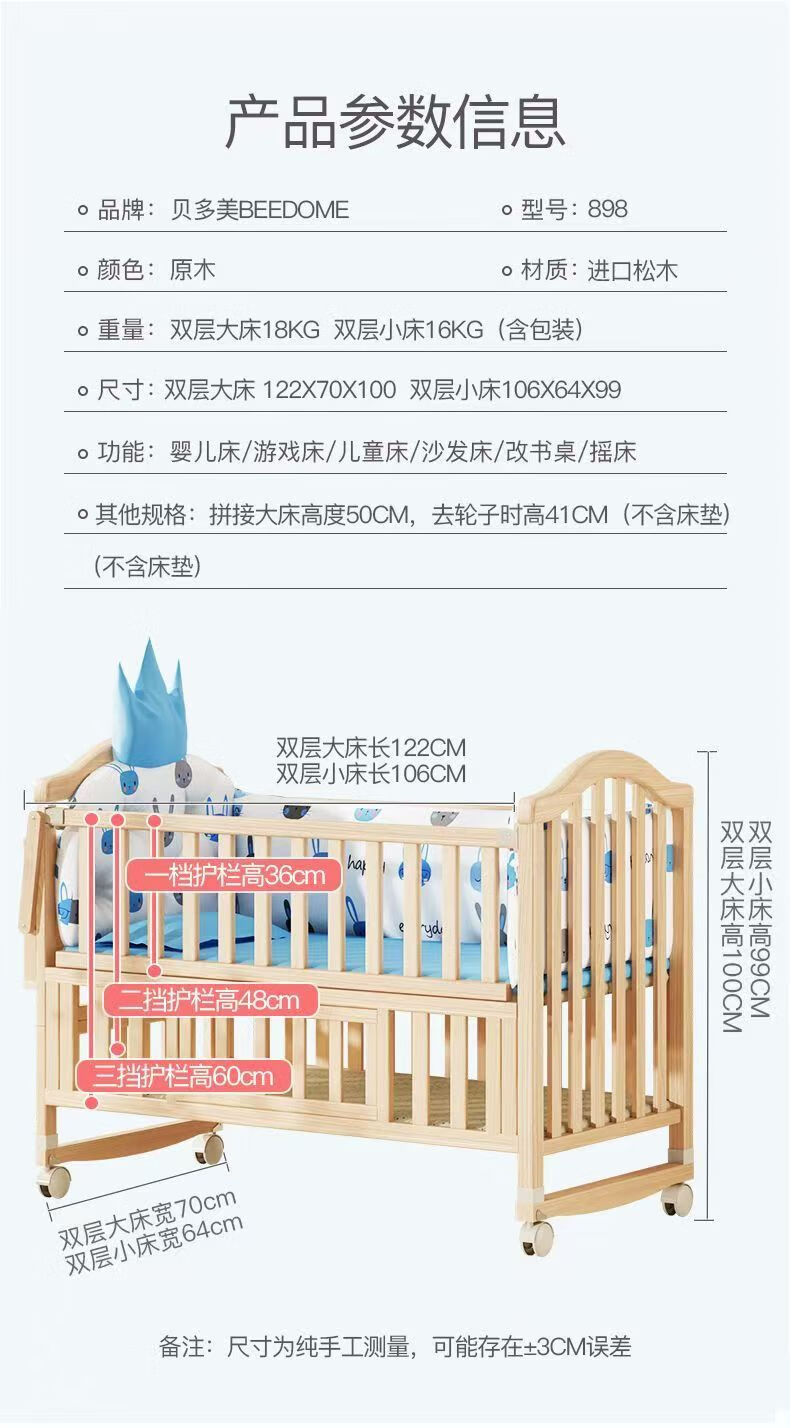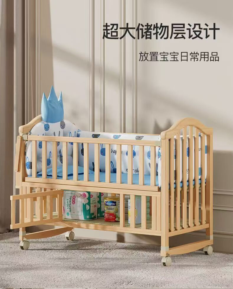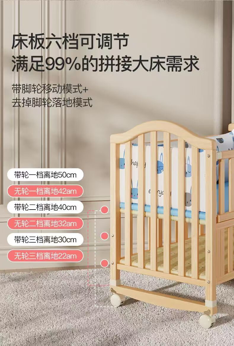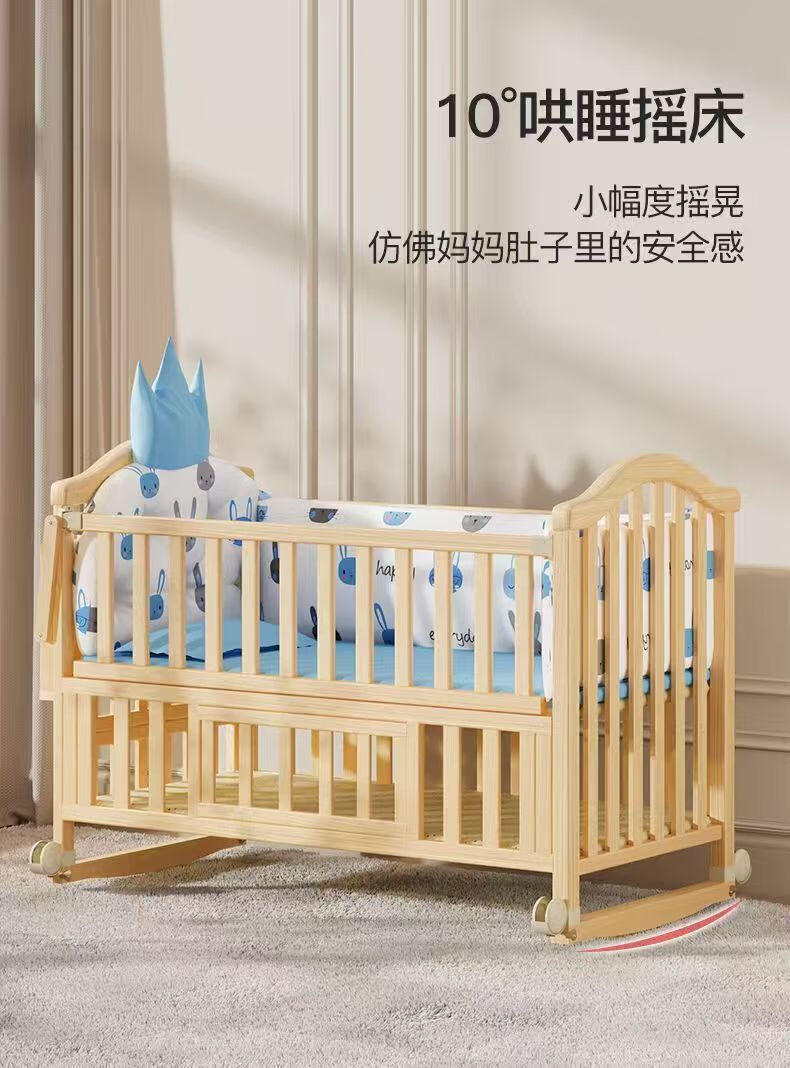 Beedome baby bed multi-functional crib spliced solid wood unpainted movable rocking bed with guardrails newborn crib, bare bed (no mosquito net, no mat), single-layer crib without changing table (95/55) 0-2 years old