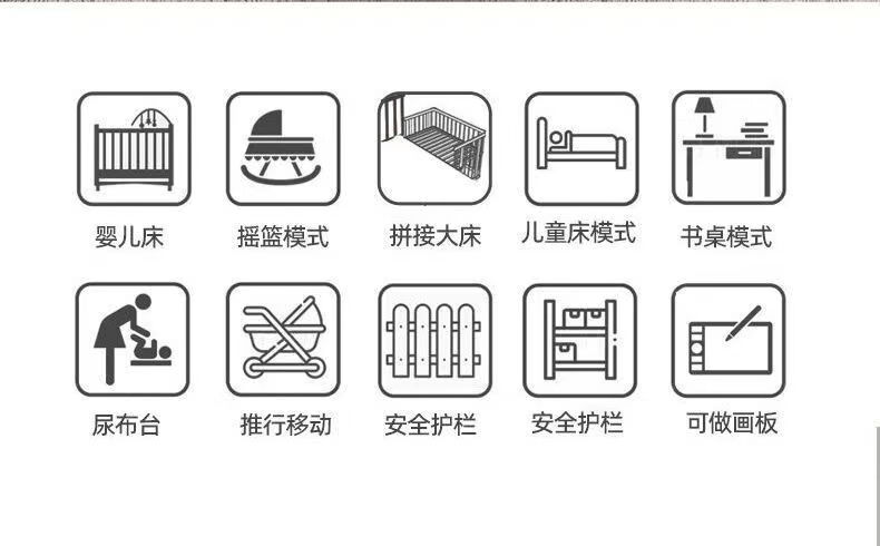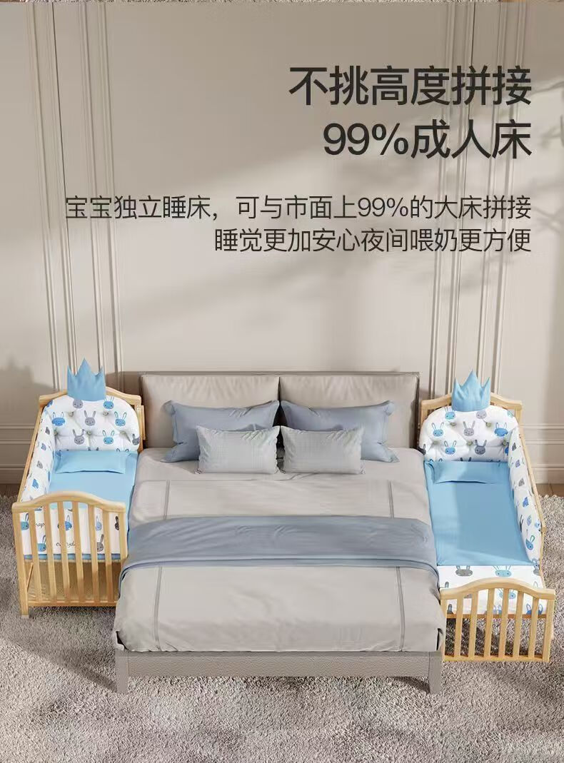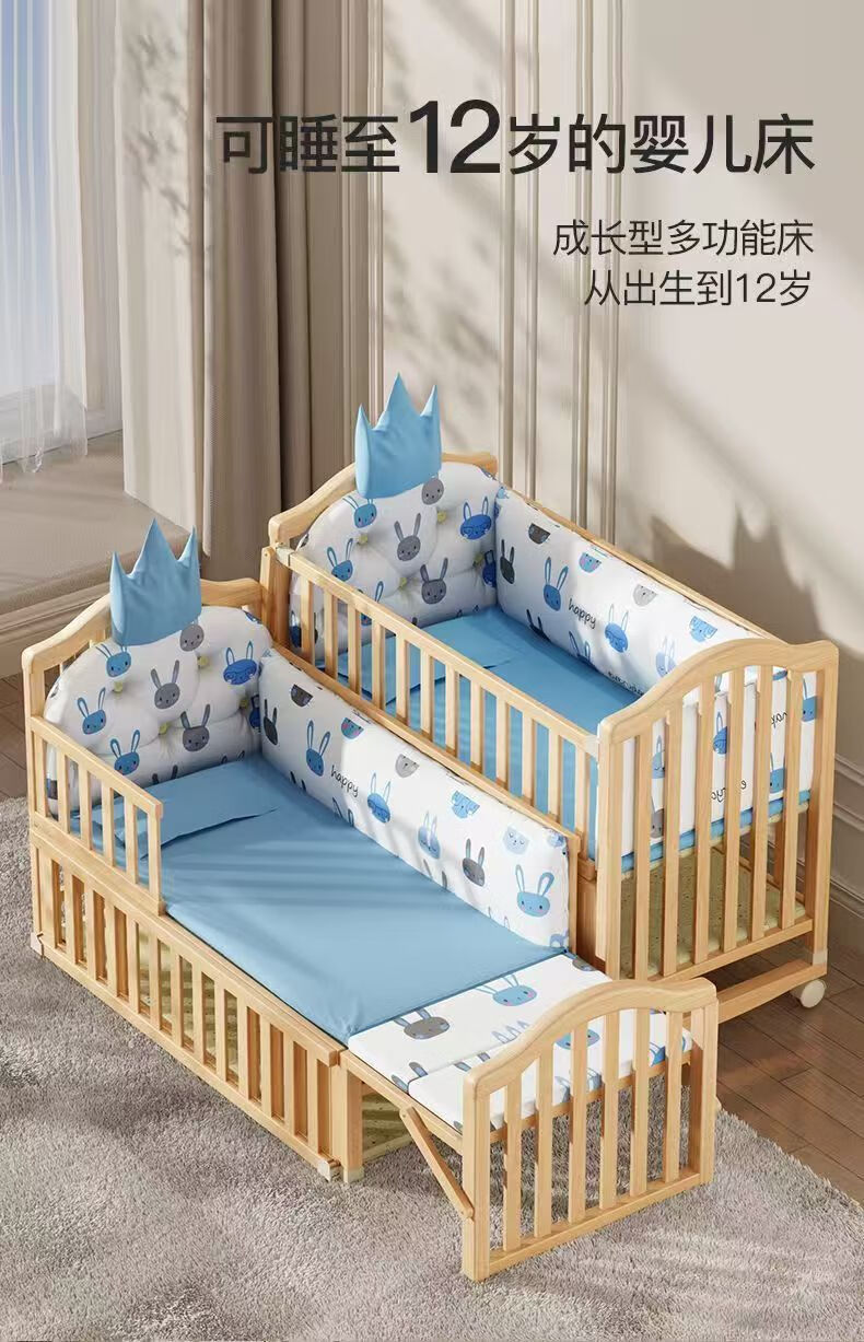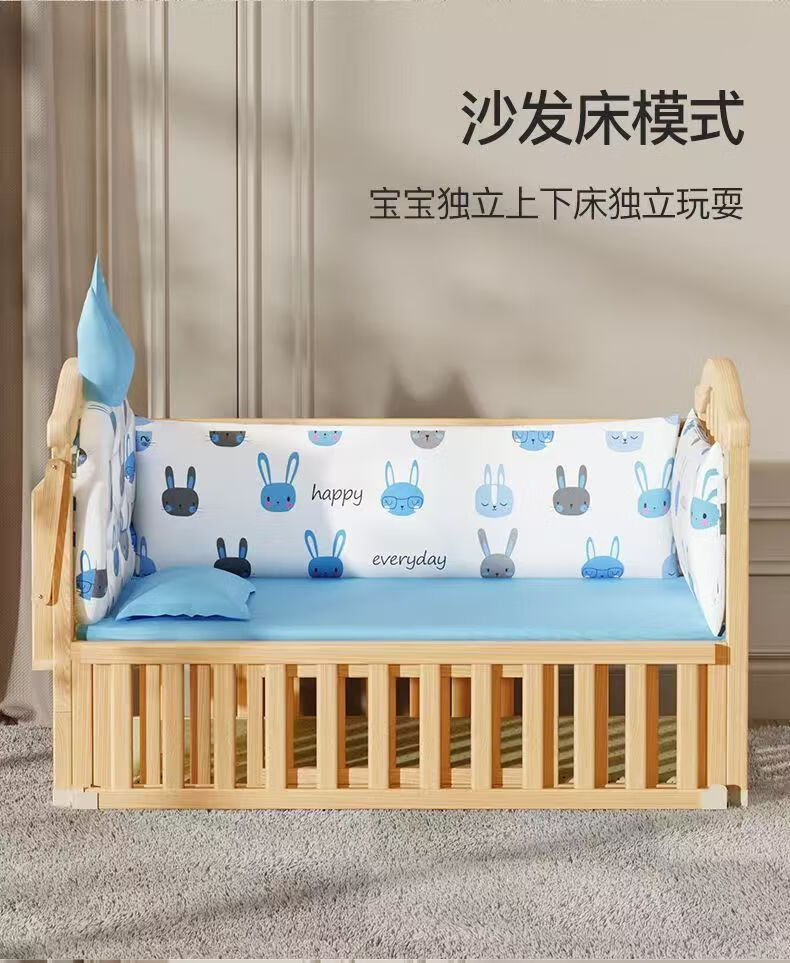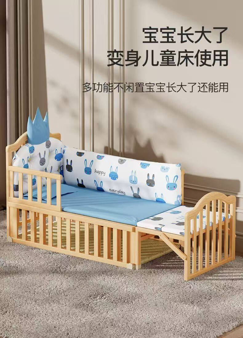 Beedome baby bed multi-functional crib spliced solid wood unpainted movable rocking bed with guardrails newborn crib, bare bed (no mosquito net, no mat), single-layer crib without changing table (95/55) 0-2 years old
