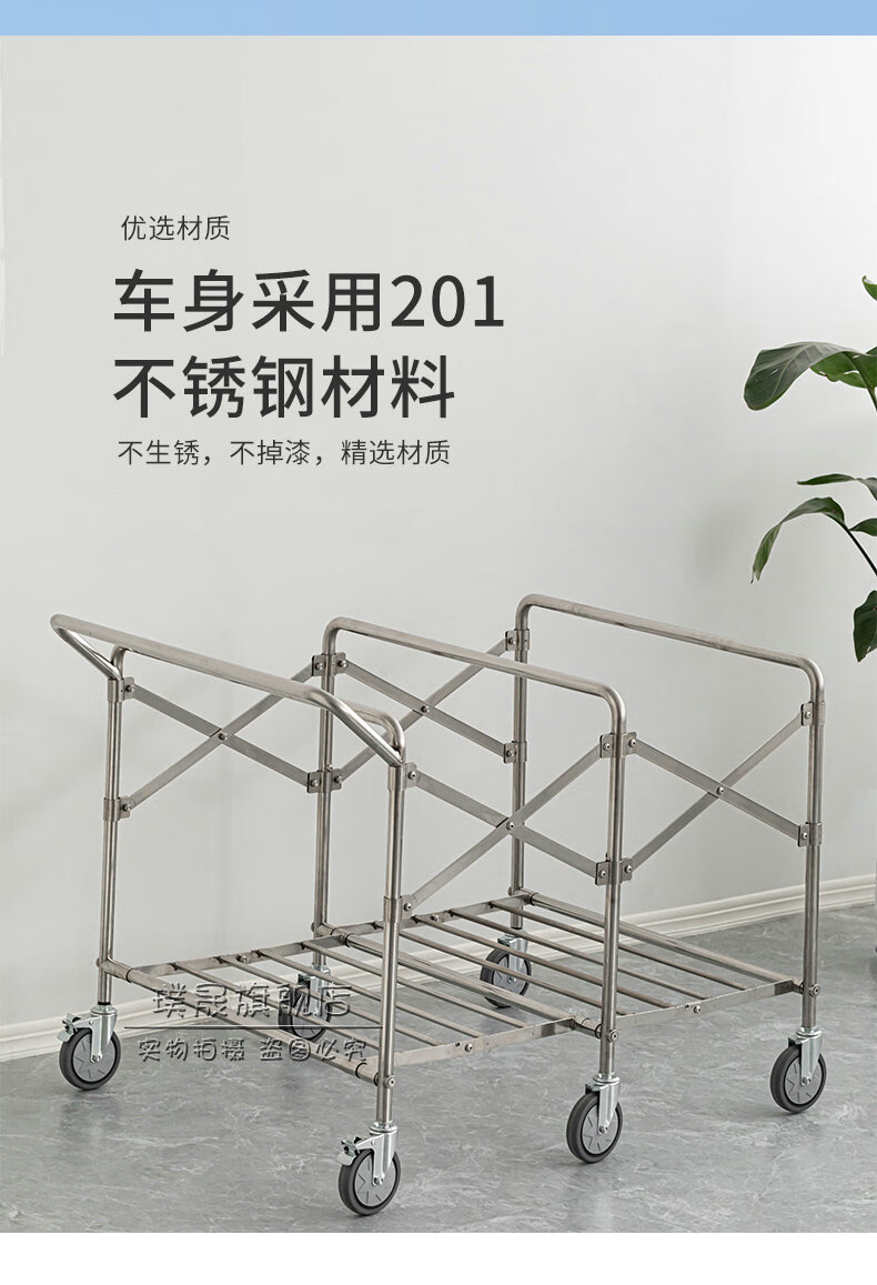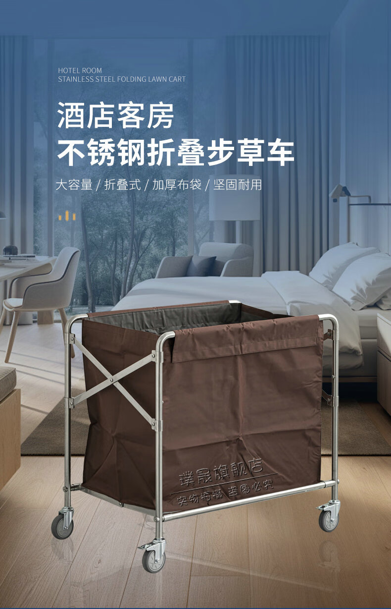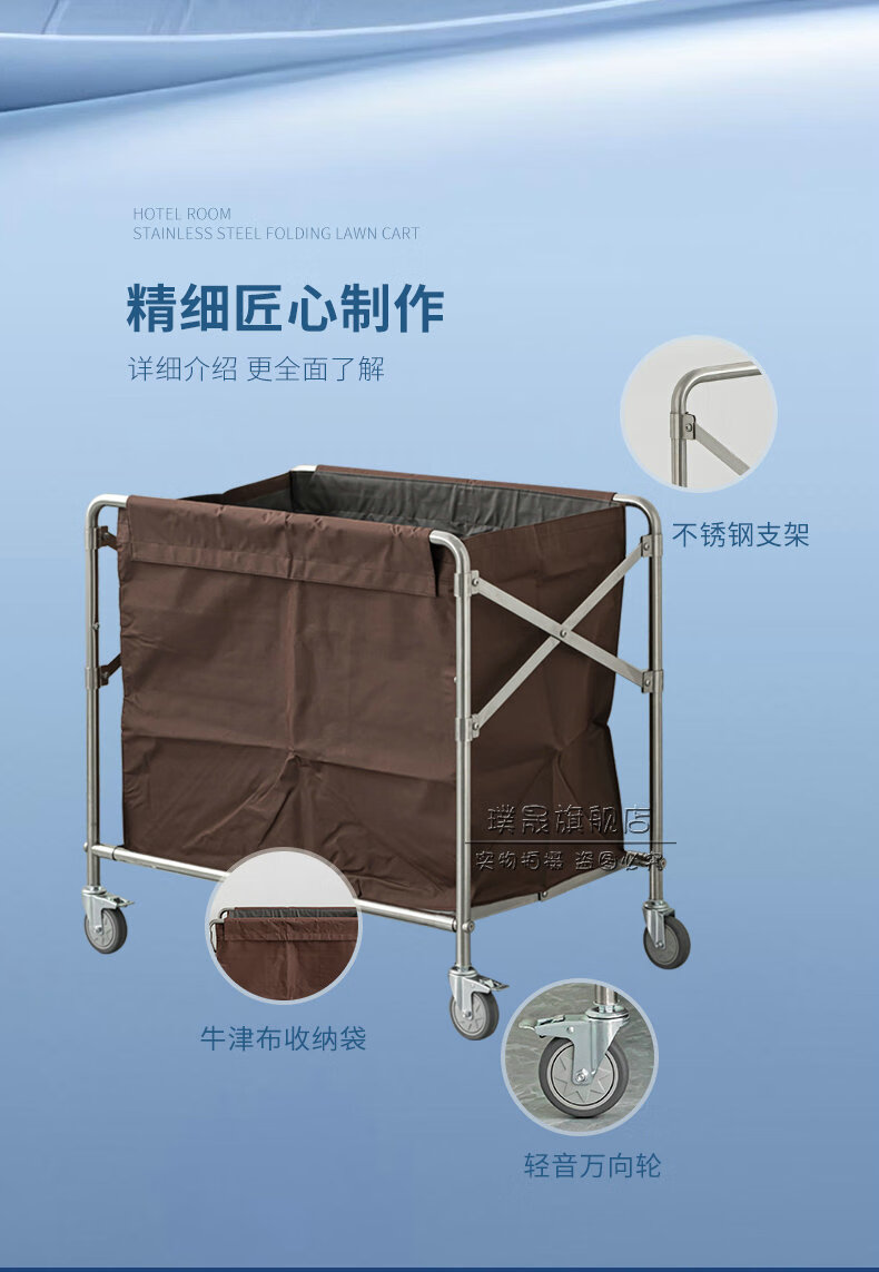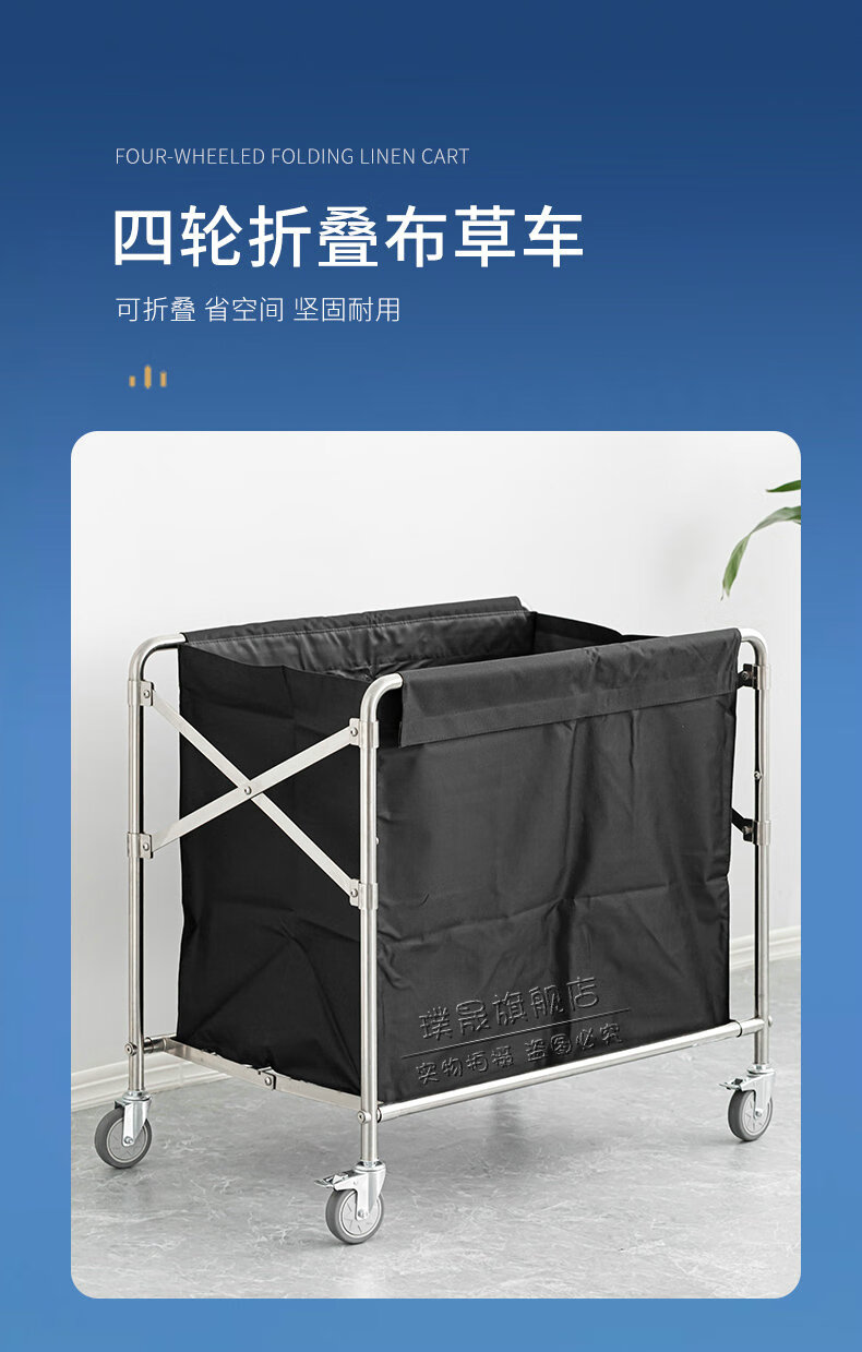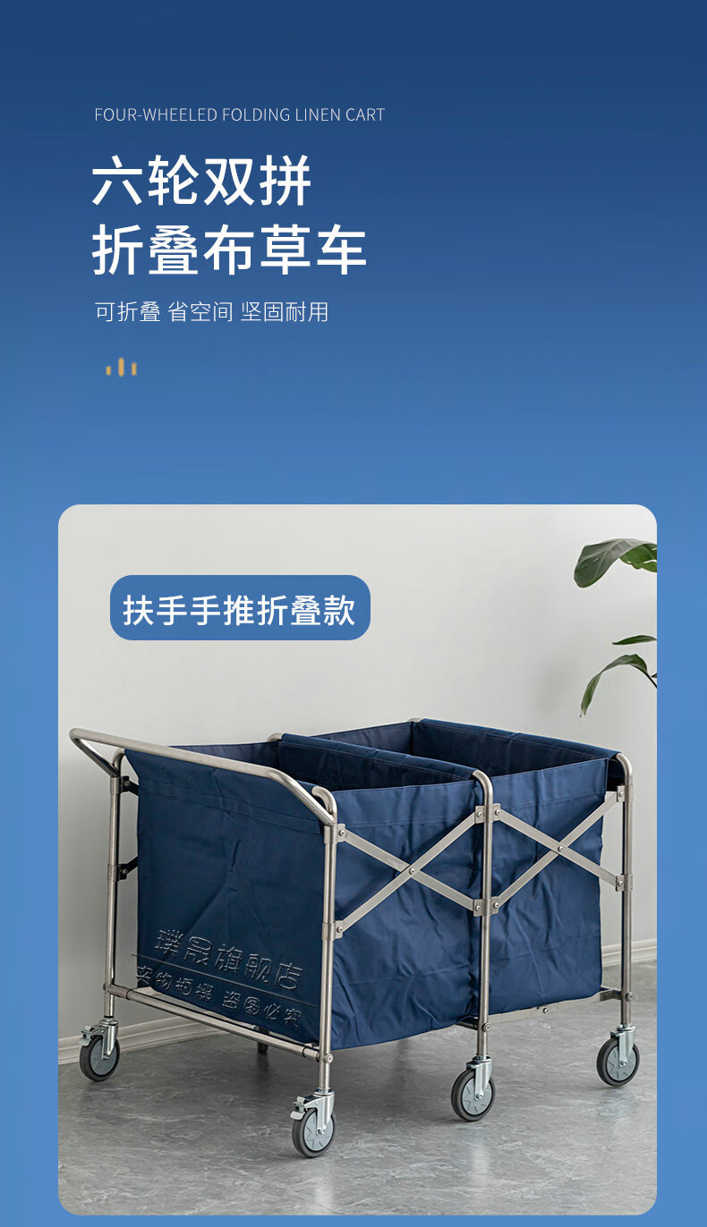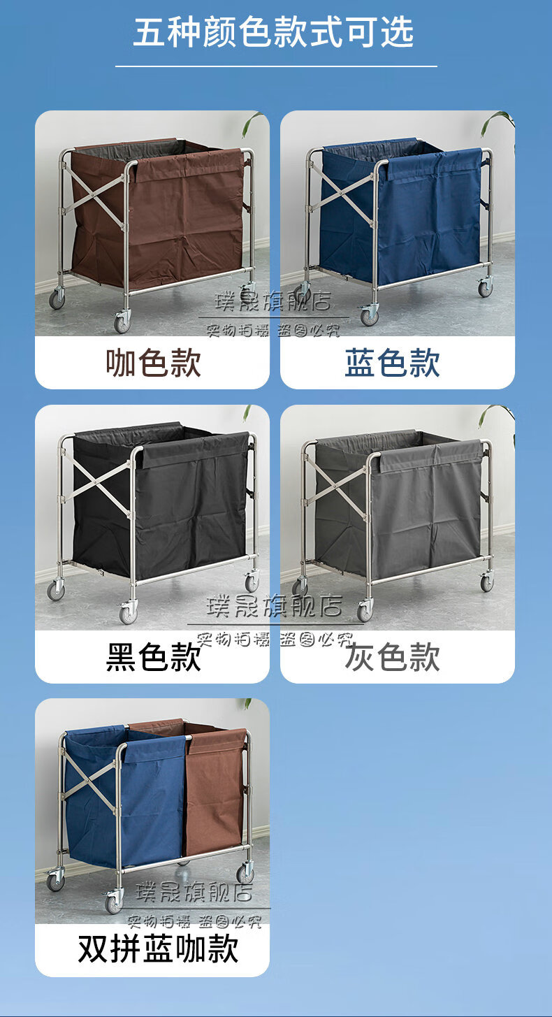 Stainless steel linen cart, hotel room service cart, laundry room collection cart, dirty cloth recycling cart, bag folding multi-functional cleaning cart, hotel cleaning cart, storage cart, large size (blue bag)