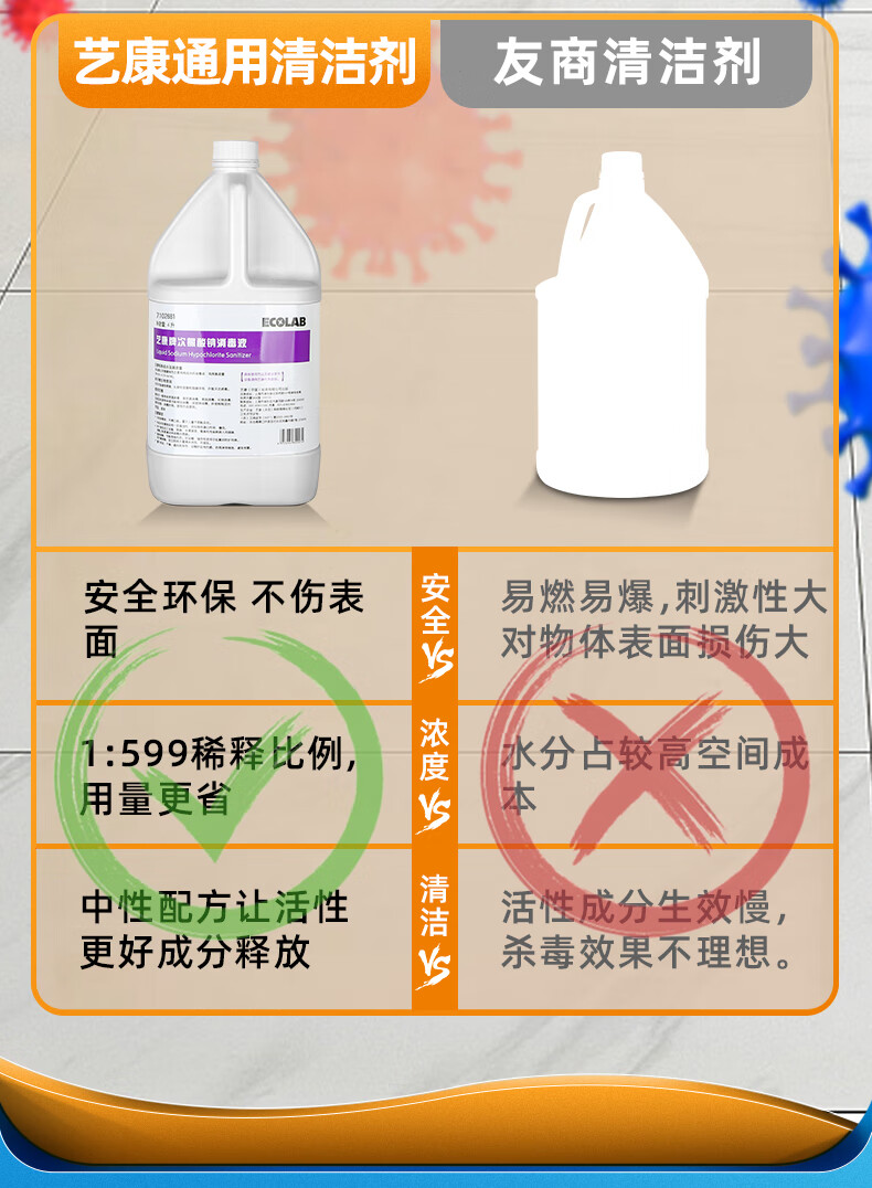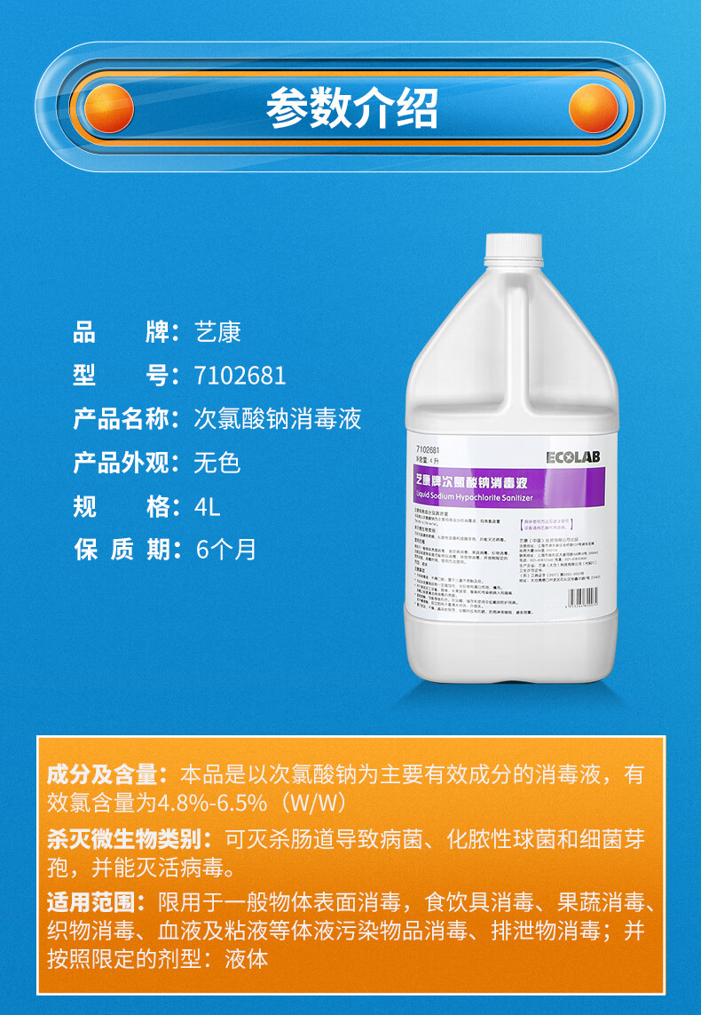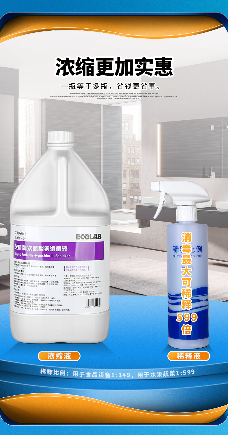 Ecolab sodium hypochlorite disinfectant 4L restaurant kitchen processing equipment cleaning cutting board food grade cleaning liquid 7102681 1 bottle