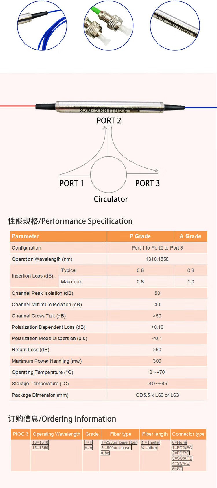 Spot fiber optic circulator 1310/1550 three-port fiber optic circulator 1 minute 2 fiber optic circulator 630nm 980nm