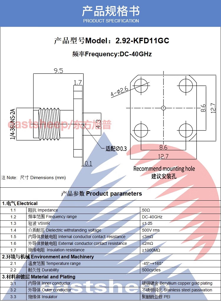 4-hole microstrip connector 2.92-KFD11GC 2.92 female adapts to 0.3 glass beads 40G 2.92-KFD11GC