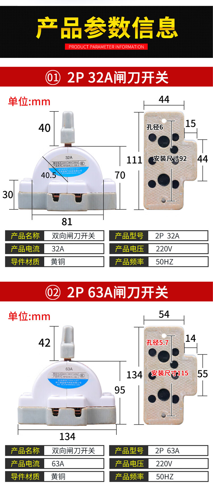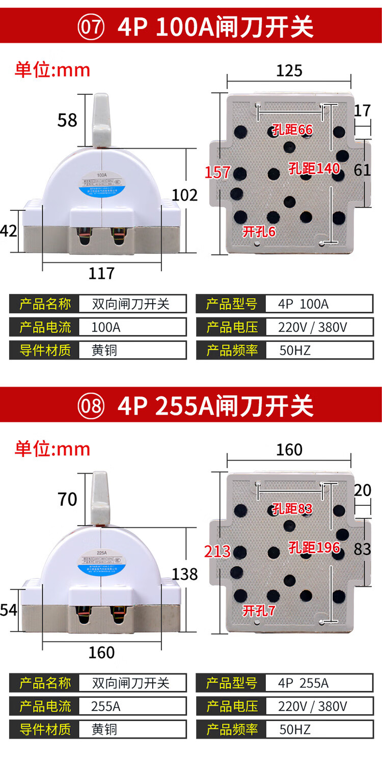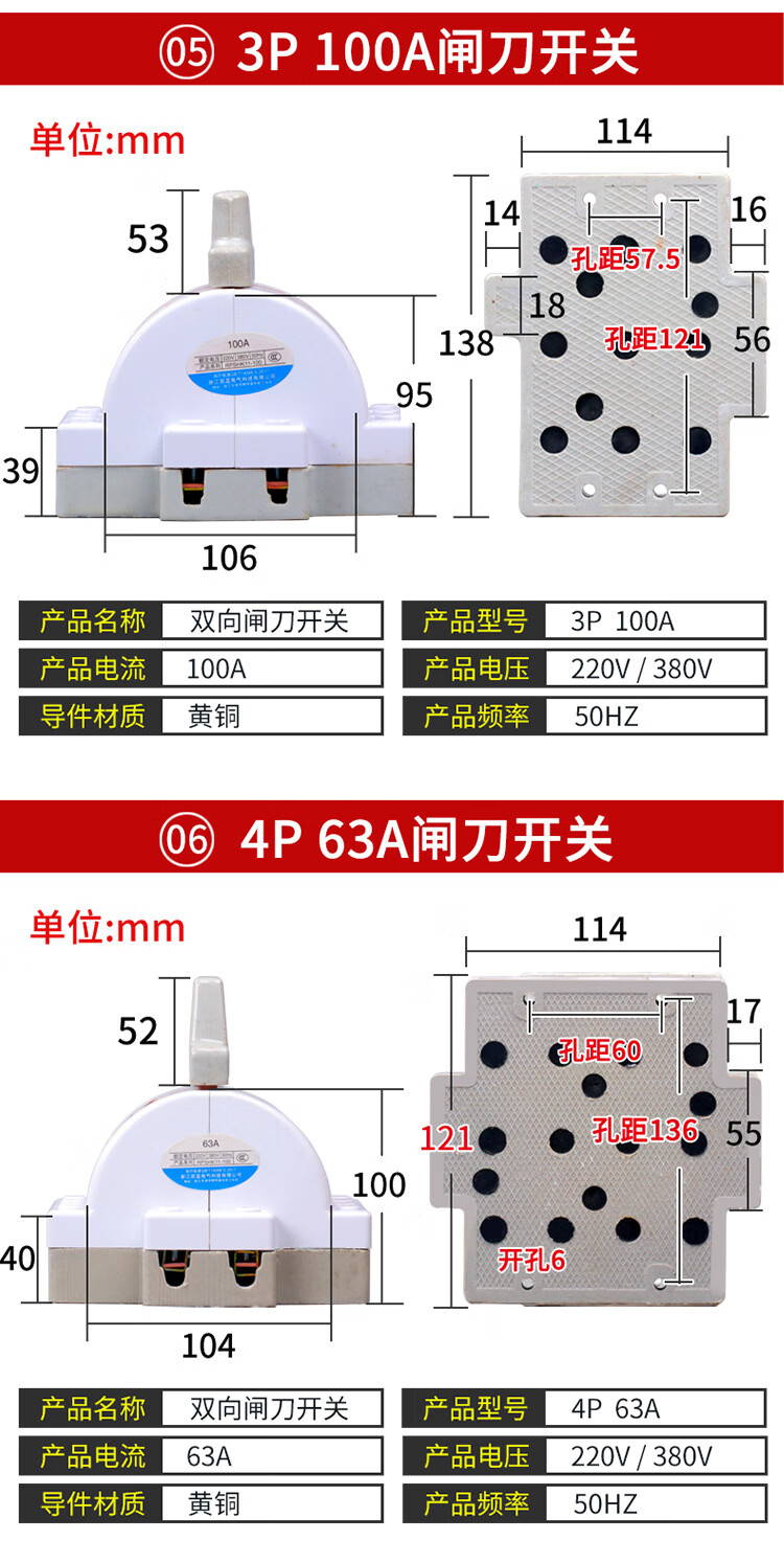 Two-way double-throw knife switch ceramic 32A2P reverse electric knife switch 220 dual power conversion switch 2P 100A ceramic model