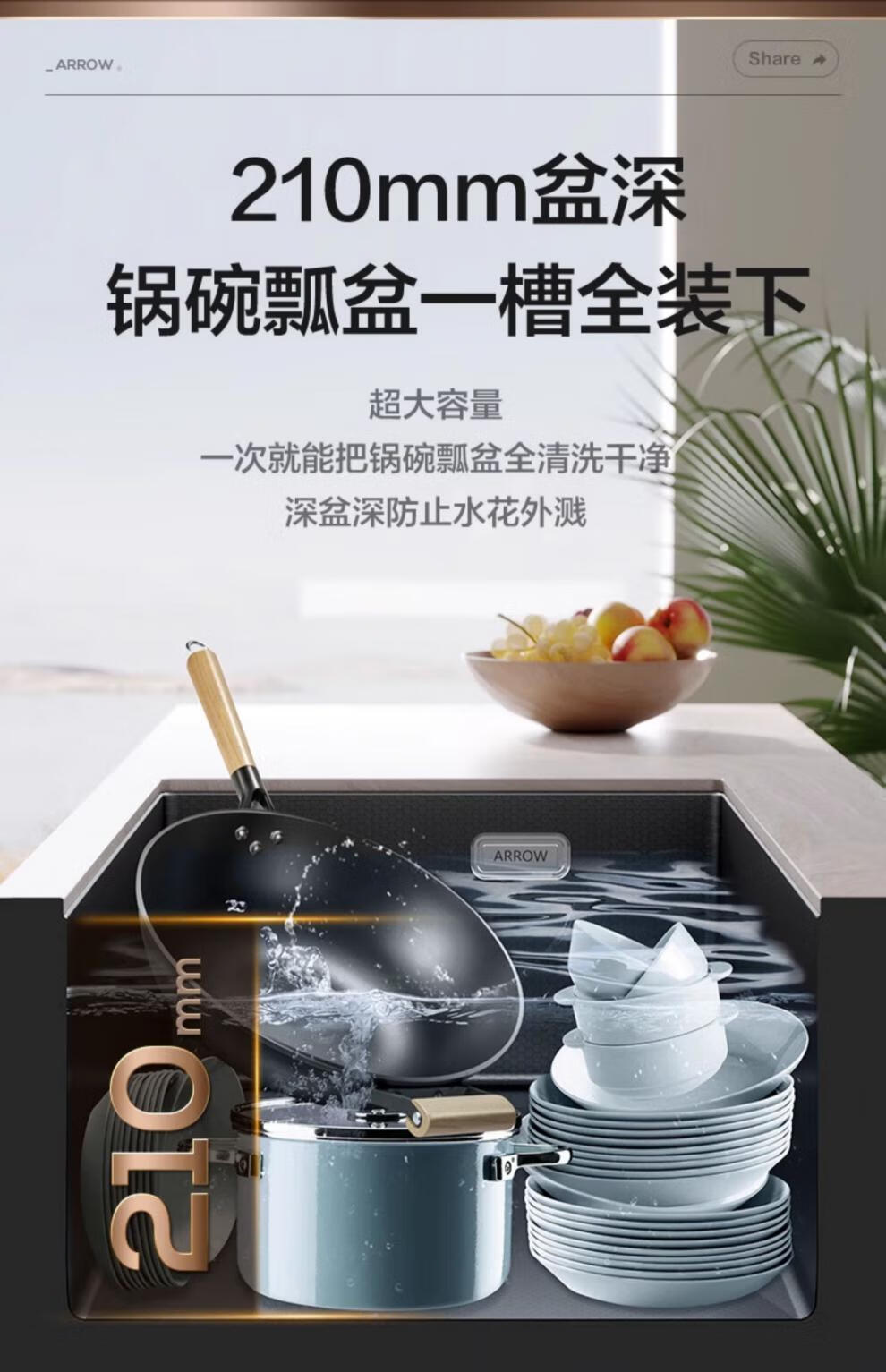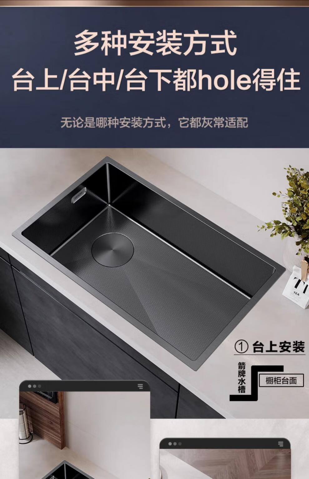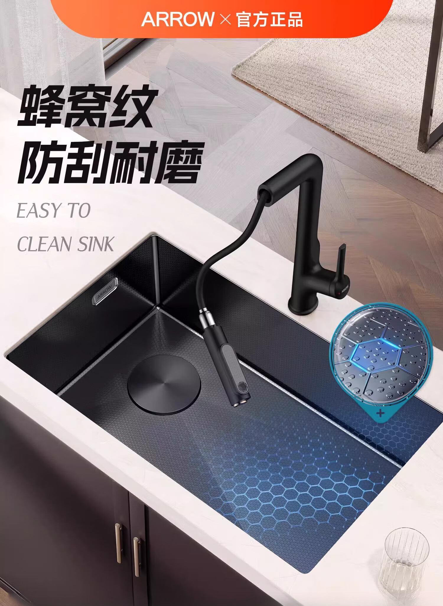 ARROW dishwashing basin 304 stainless steel nano sink kitchen household sink sink under counter basin handmade single slot A 62x43cm丨excluding faucet丨honeycomb pressure