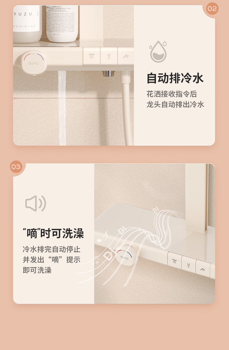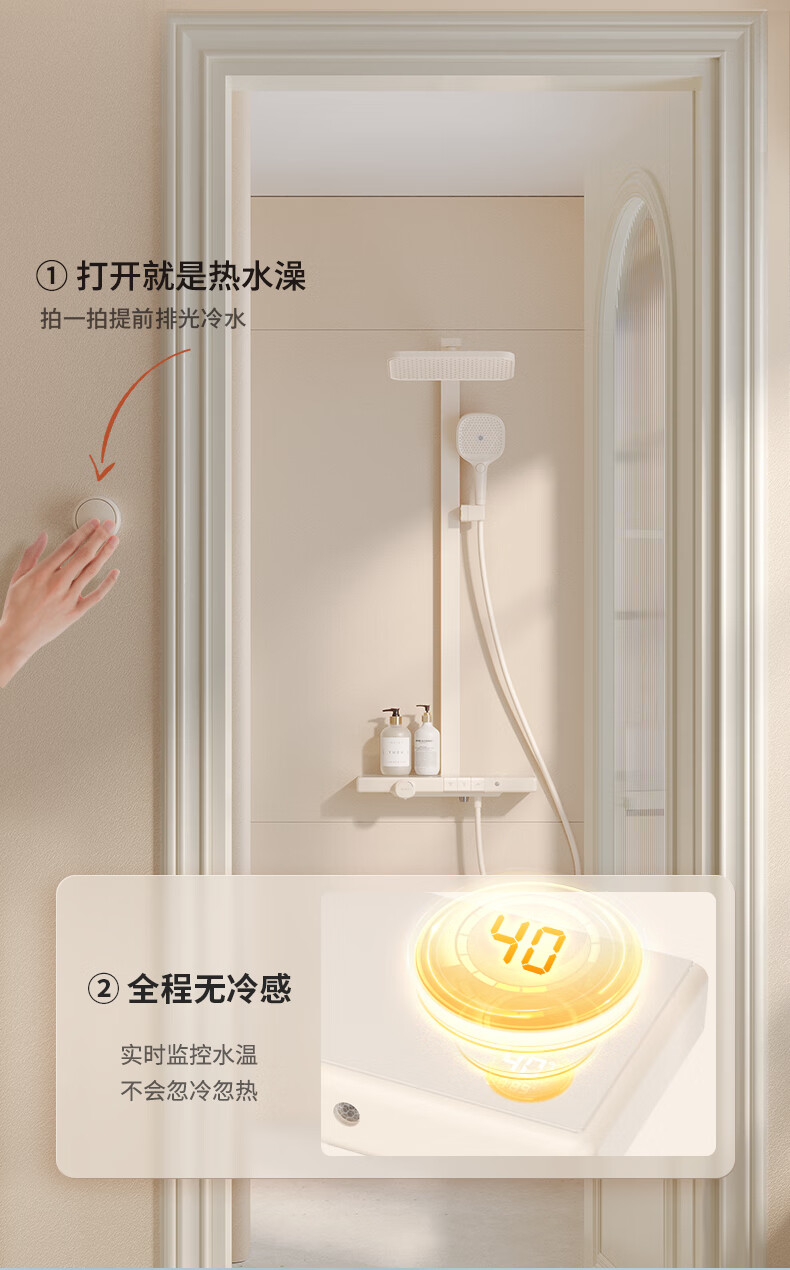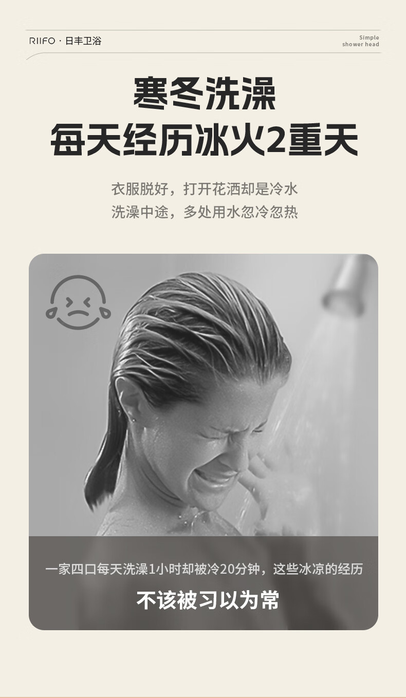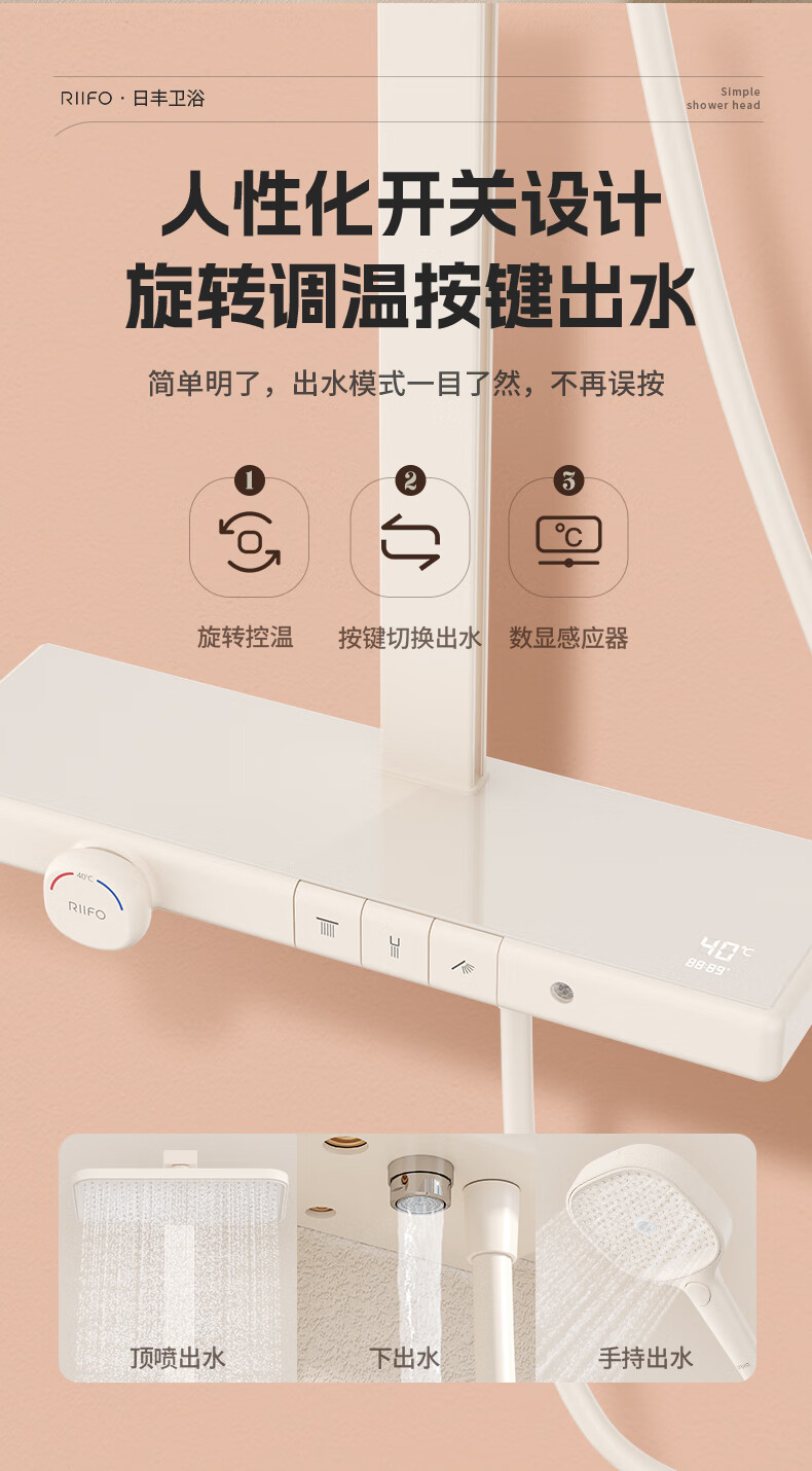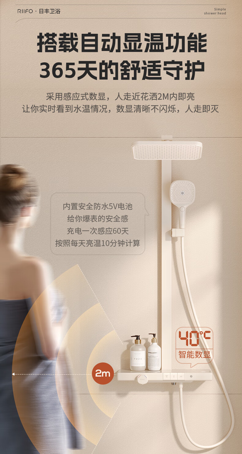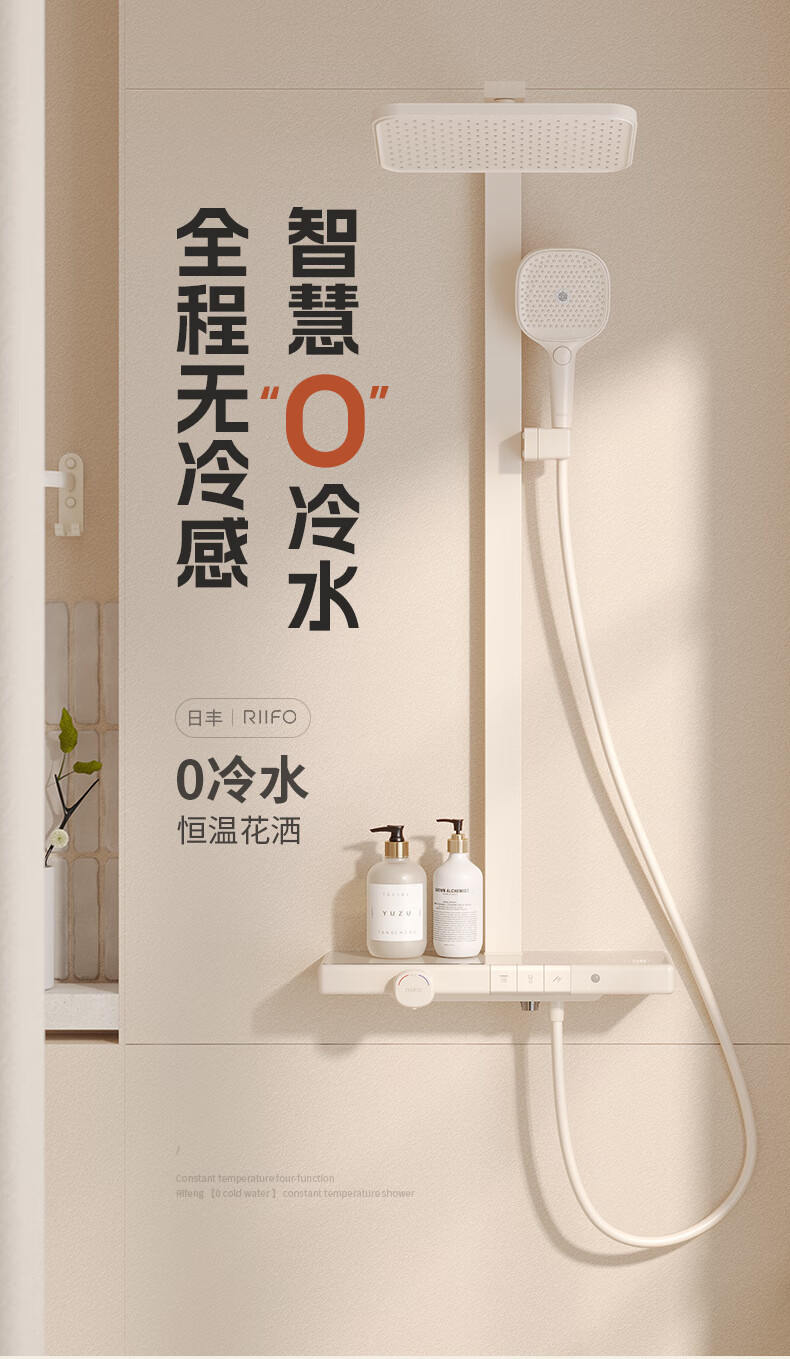 Rifeng Cream Style White Zero Cold Water Intelligent Digital Display Constant Temperature Shower Bath Constant Temperature Shower Set Booster Milk White Round Tube Three-Function Shower-