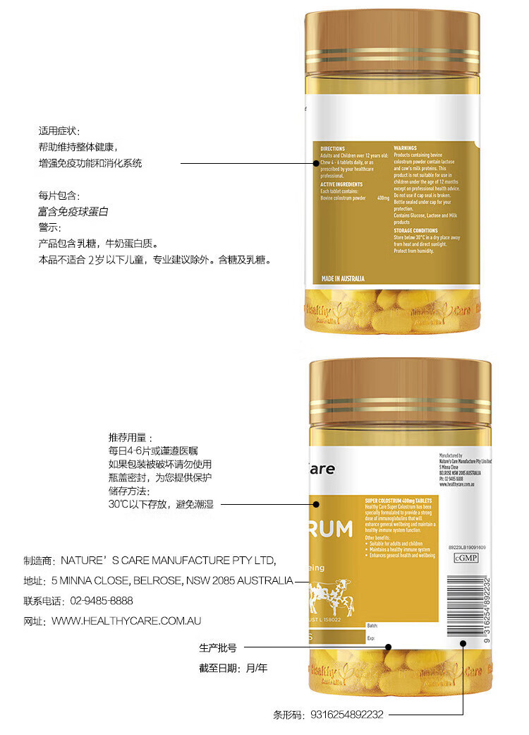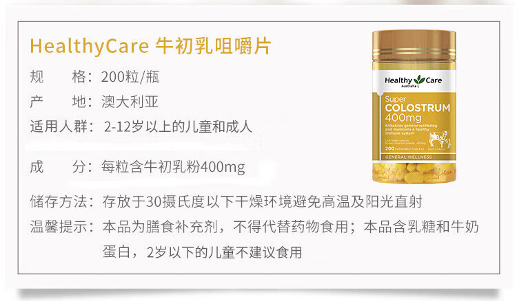 Healthy Care Bovine Colostrum Chewable Tablets 200 Tablets Imported from Australia Rich in Immunoglobulin to Enhance Immunity Bovine Colostrum Chewable Tablets 200 Tablets*1 Bottle