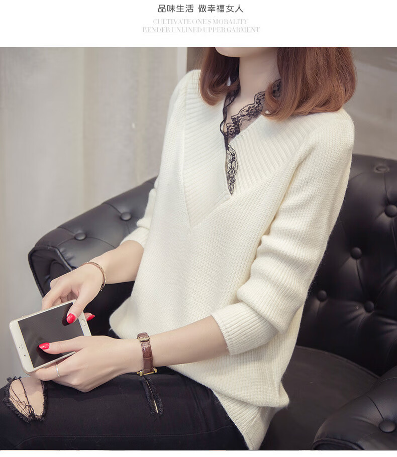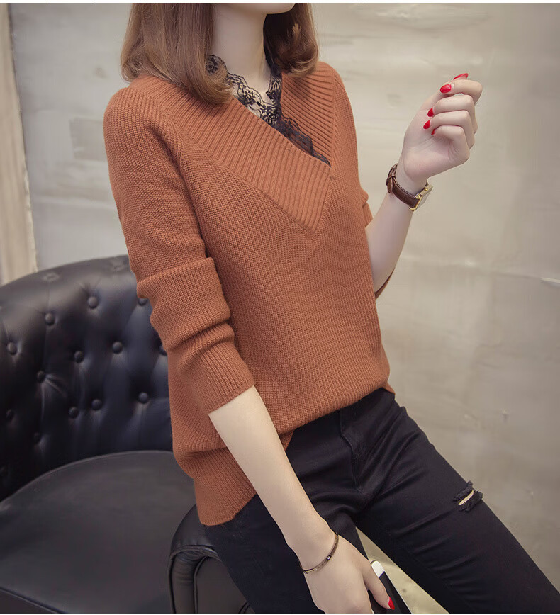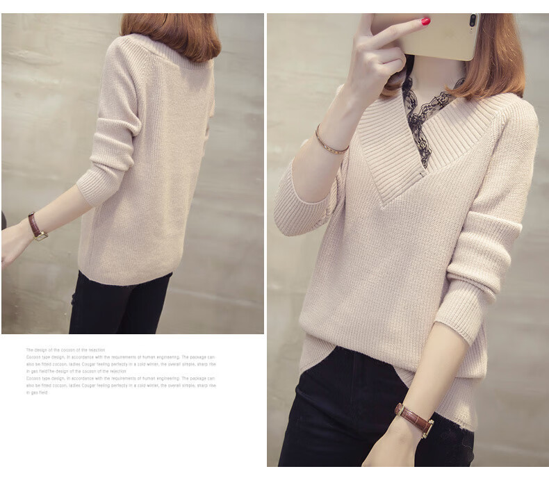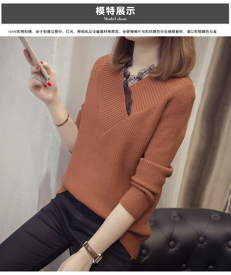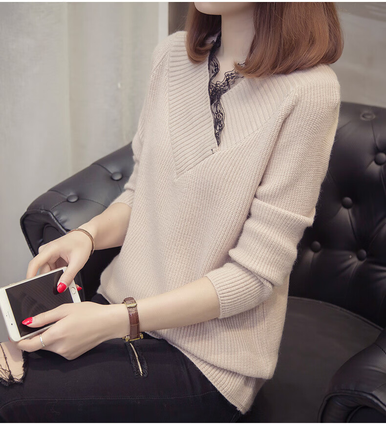 Fan Zhe Lang (FANZELANG) v-neck sweater women's loose Korean style lace 200 pounds plus fat plus size women's knitted bottoming shirt fat sister autumn and winter khaki color one size 80-120