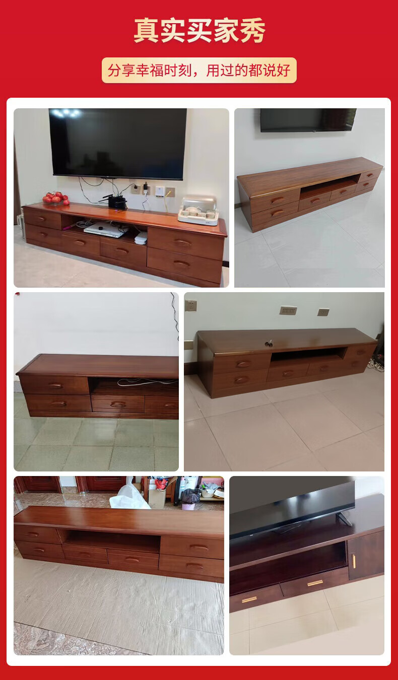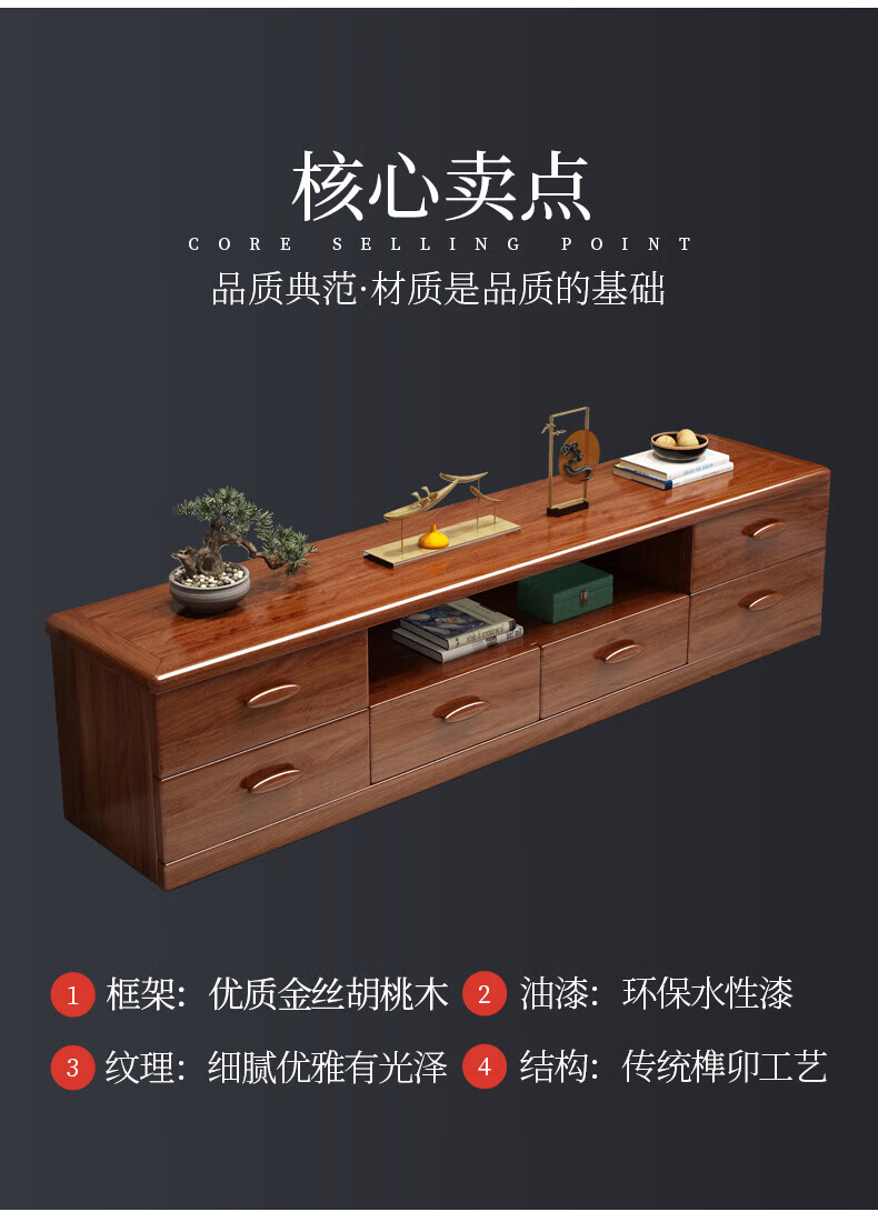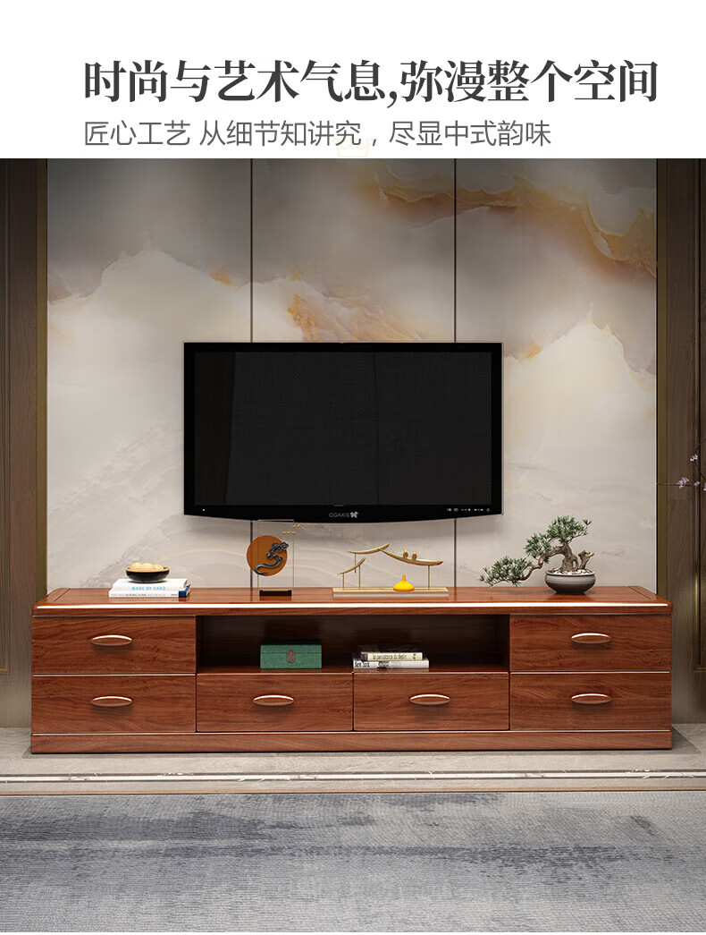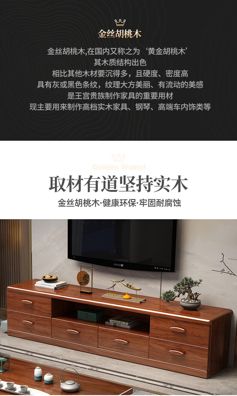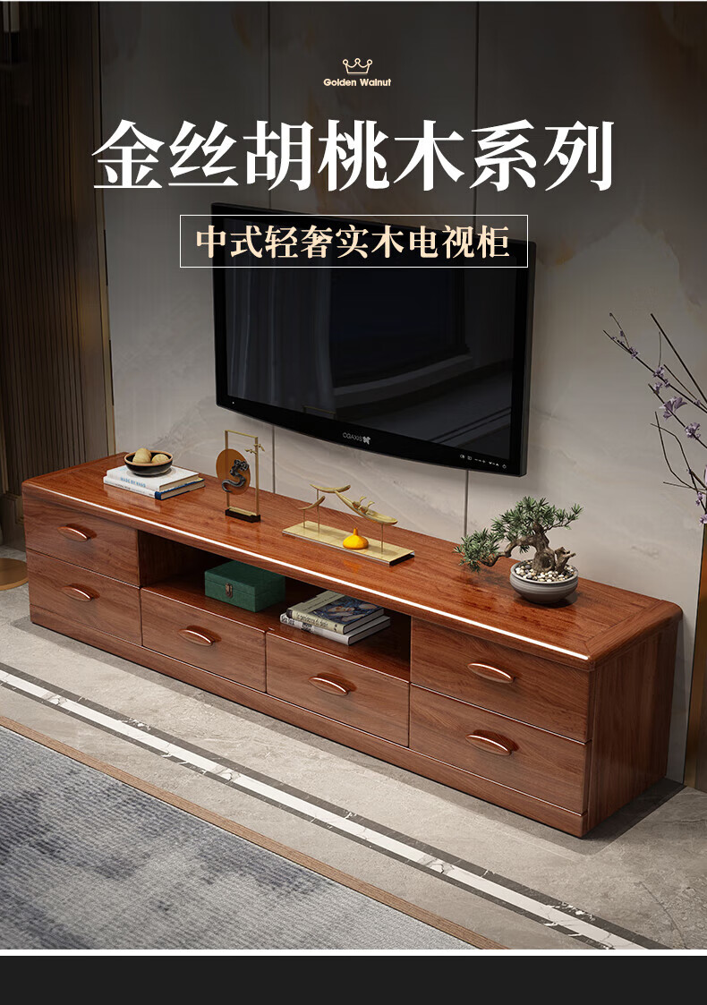 Hengyun TV cabinet golden walnut solid wood TV coffee table combination cabinet floor cabinet simple living room Chinese style boutique furniture 2.0m six-drawer TV cabinet golden walnut color